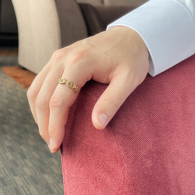 太めのボリューム感あるチェーンデザインのオープンデザインリングです。指先のおしゃれの幅を広げてくれる存在感あるリング、重ね着けリングとしてご愛用いただけます。シンプルなディリーやカジュアルに、おしゃれ着につける個性派アクセサリーに。 ・男女を問わず着用できるオシャレなユニセックススタイル シンプルで洗練されたデザインや中性的な要素を持っているアクセサリーです。 ・指輪サイズ:日本サイズ13号をベースに製作しております。(12-14号対応可) ・デザイン寸法:最大幅:6.4mm / 厚み:約1.4mm / 内径(直径):約17mm ・材質:無垢の真鍮