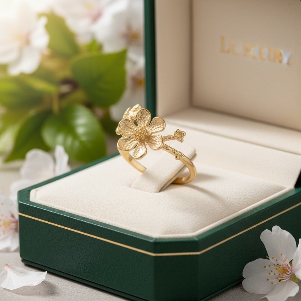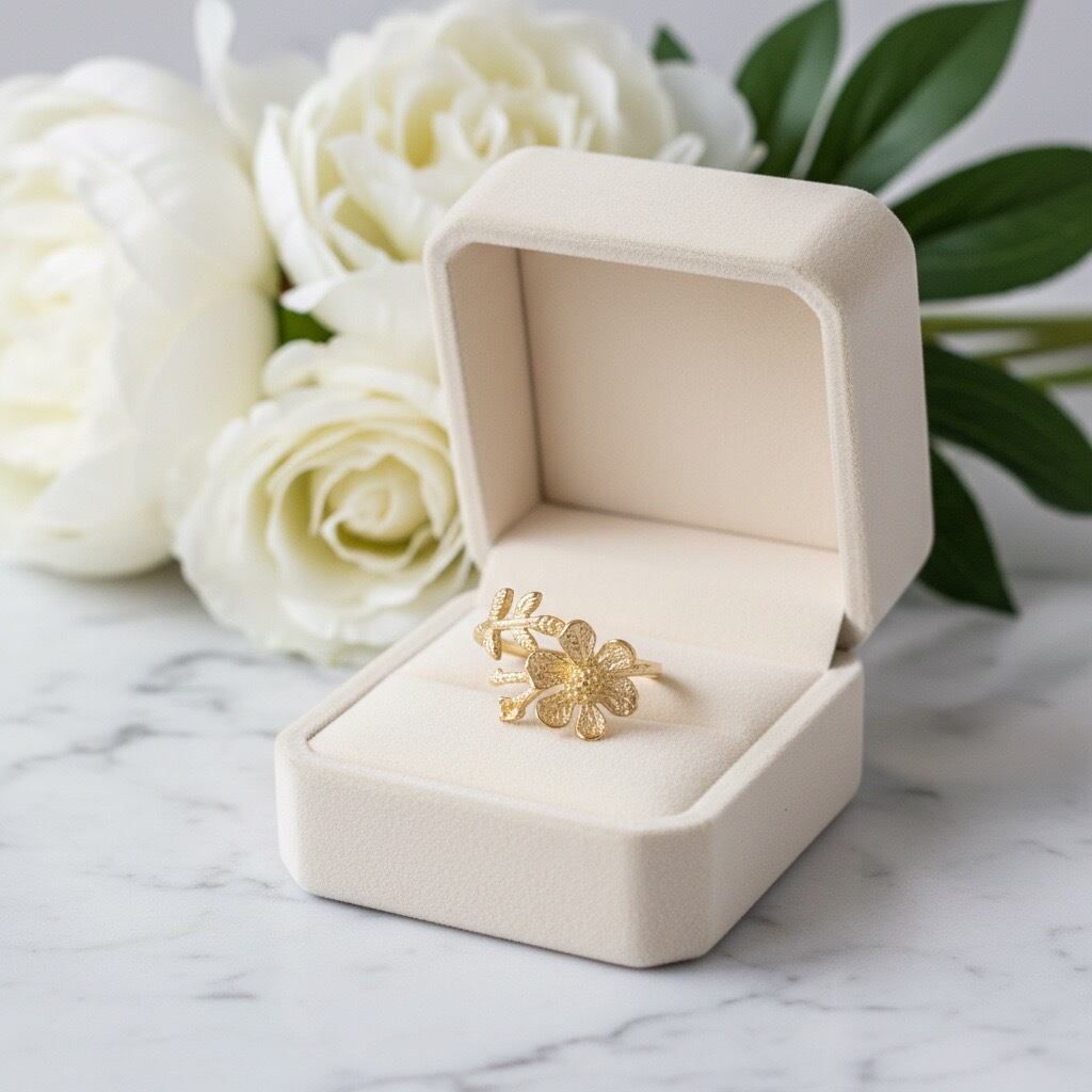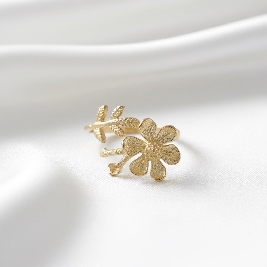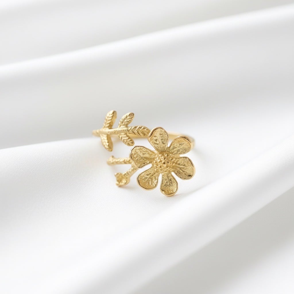 繊細なフラワーモチーフが印象的な、ボタニカルデザインの真鍮リング。花びらや葉の一つひとつに施されたディテールが、クラシカルで上品な雰囲気を演出します。アンティーク調の仕上げが、使い込むほどに味わい深く変化し、手元に自然な温もりを添えてくれます。