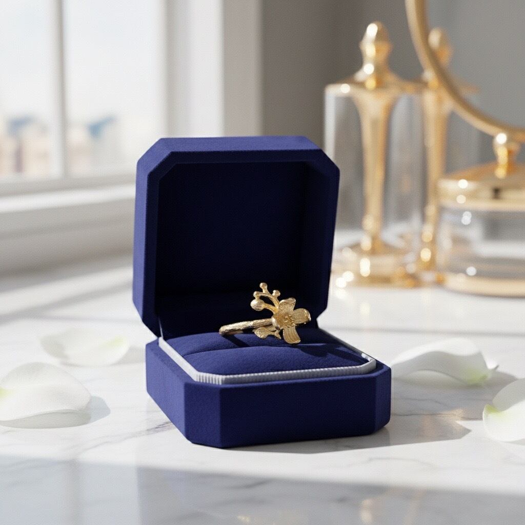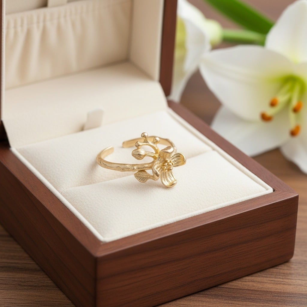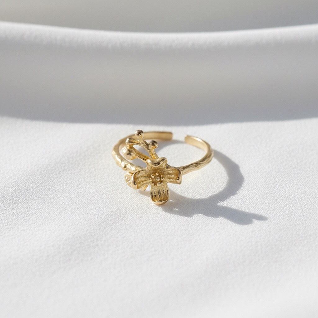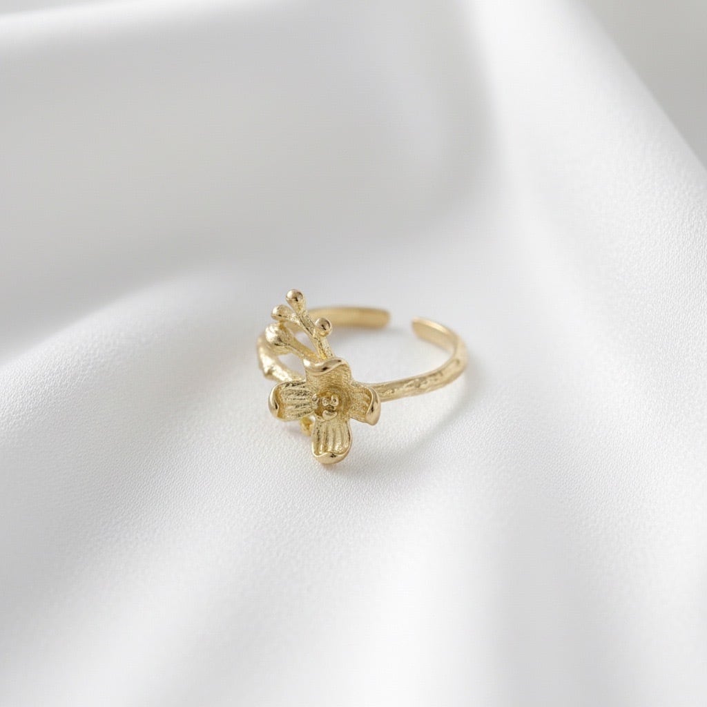 繊細な花モチーフが印象的なエレガントなデザインのリング。シンプルながらも個性的なデザインで、どんなコーディネートにも合わせやすい一品です。