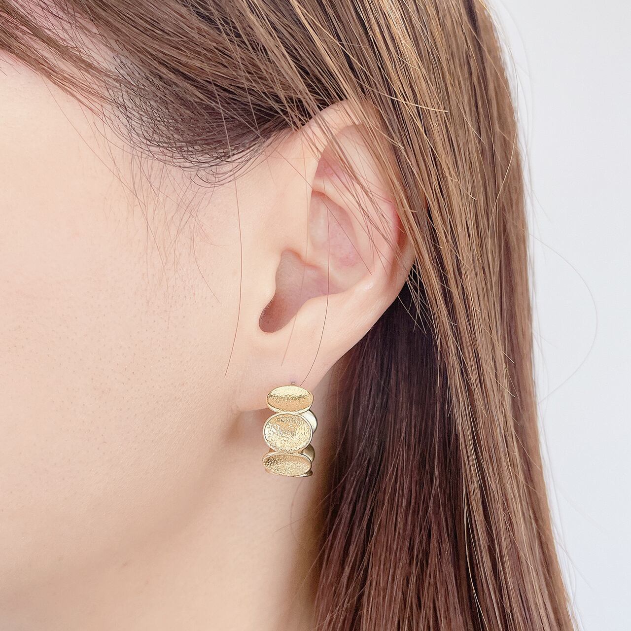 繊細なテクスチャーが施されたゴールドのプレートを連ねた、ヴィンテージ感漂うフープピアス。動くたびに光を反射し、耳元に華やかさをプラスします。