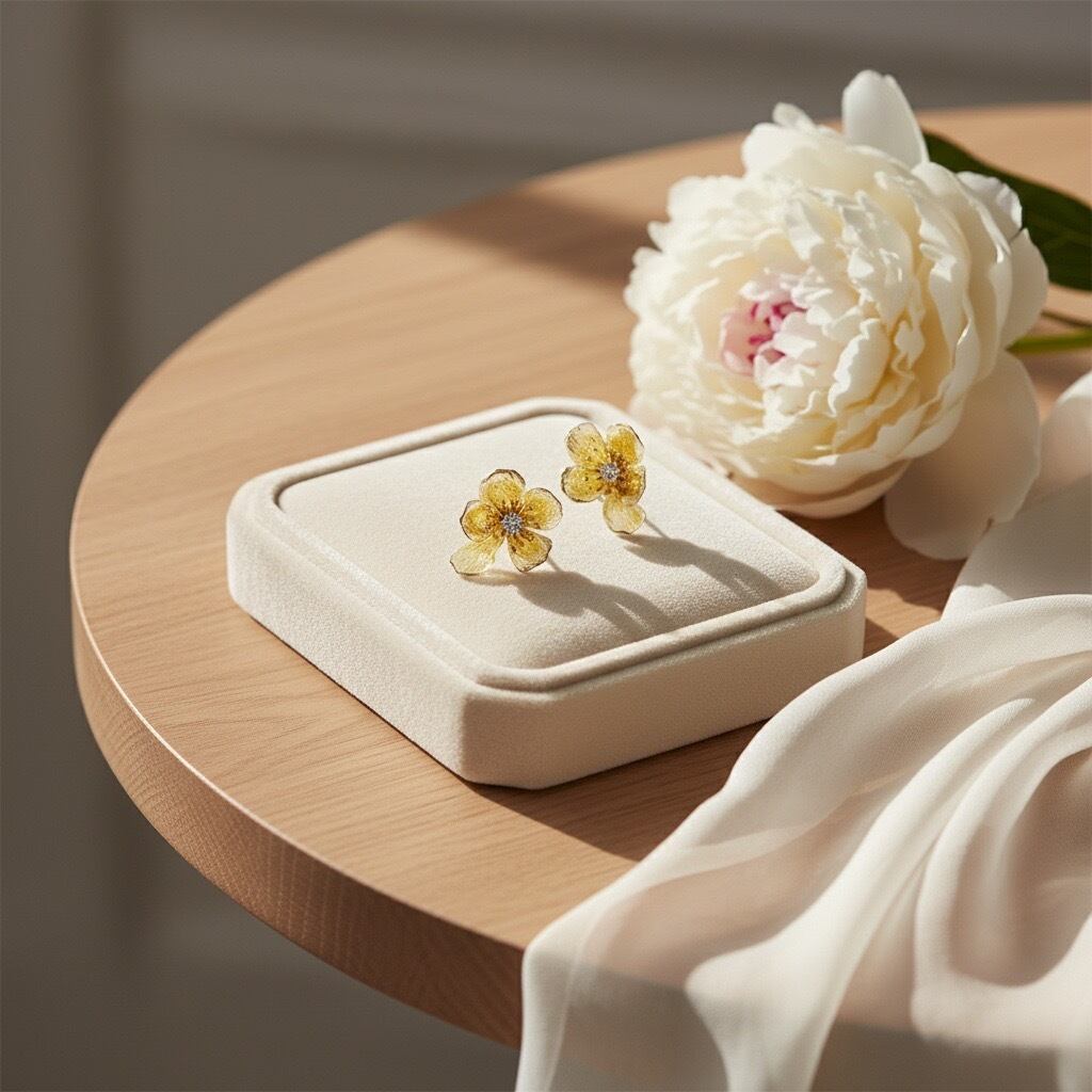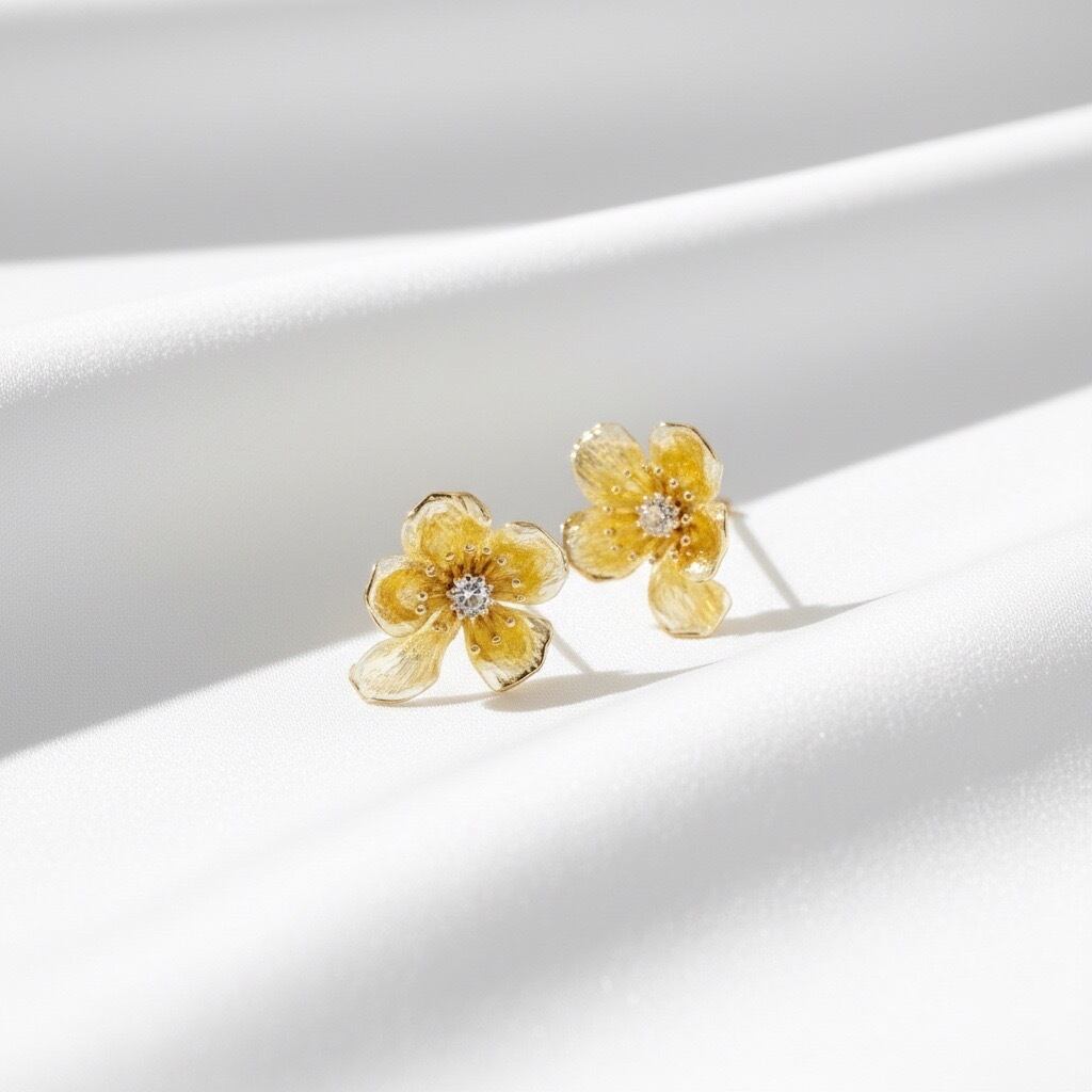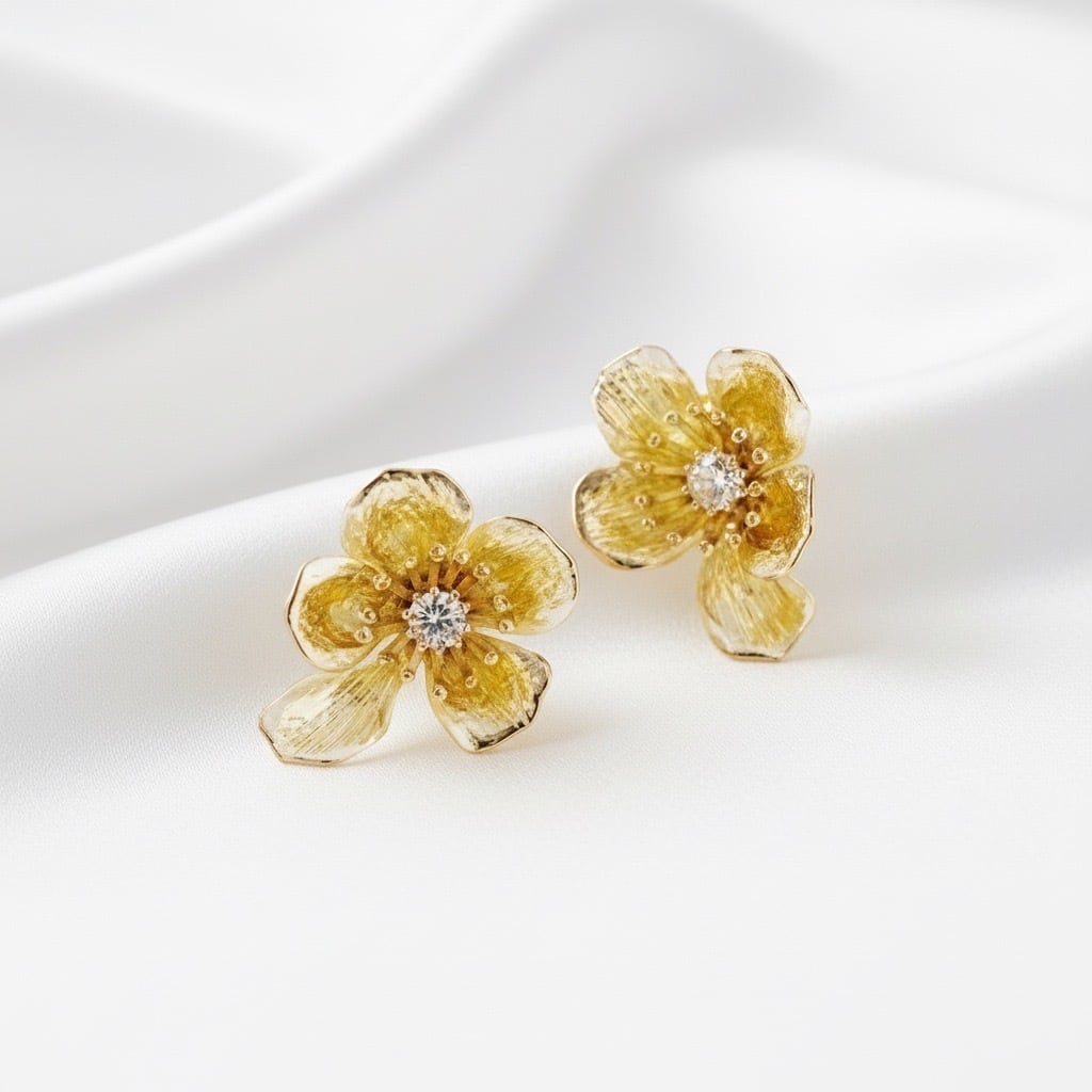 華やかに咲く花をモチーフにした立体的なデザインのフラワーピアス。花びら一枚一枚に繊細なテクスチャーを施し、まるで本物の花びらが揺れるような優雅な印象を演出します。中央にはキュービックジルコニアをセットし、光を受けるたびに上品な輝きを放ちます。
