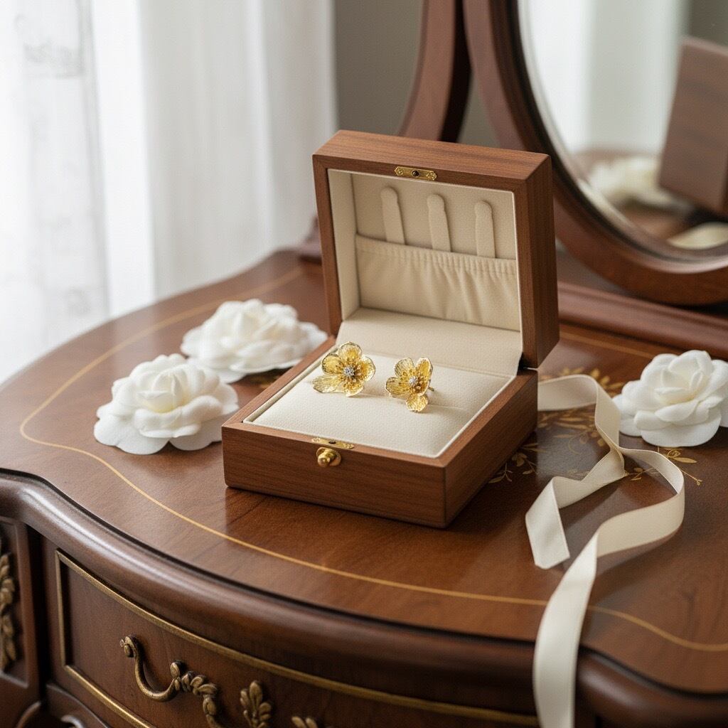 アンティーク調のゴールドカラーが大人の装いに馴染み、フォーマルにもカジュアルにも合わせやすいアイテム。特別な日のアクセントや、贈り物にも最適です。