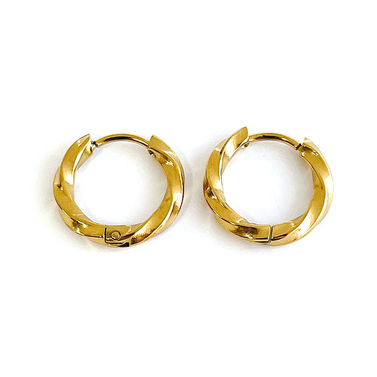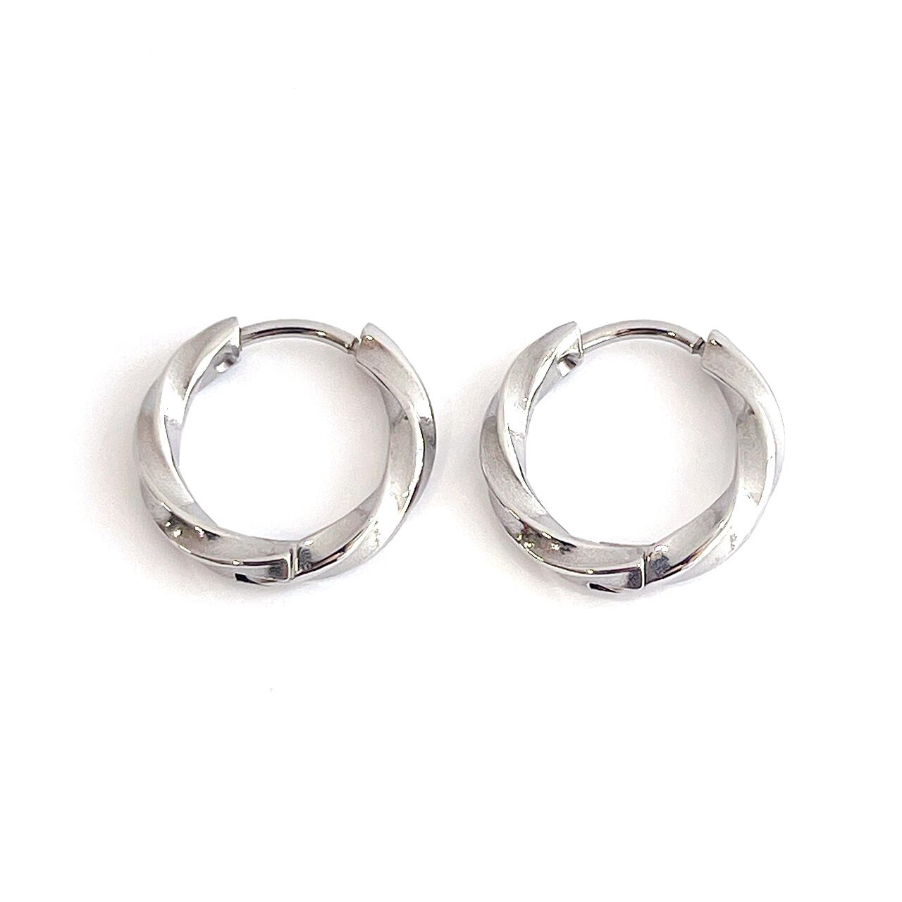 ほどよいボリュームとツイストデザインが魅力の、サージカルステンレス製フープピアス。角度によって光を受けて輝く立体的なフォルムが、顔まわりを上品に彩ります。サイズは外径約13mm・15mm・17mmの3サイズ展開。シンプルながら存在感のあるデザインで、デイリーにもフォーマルにも合わせやすい万能アイテムです。