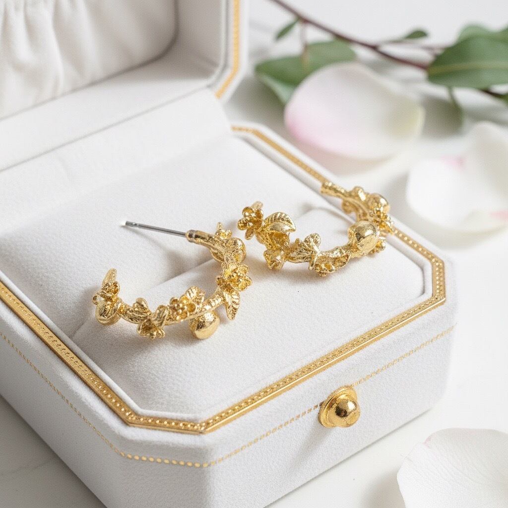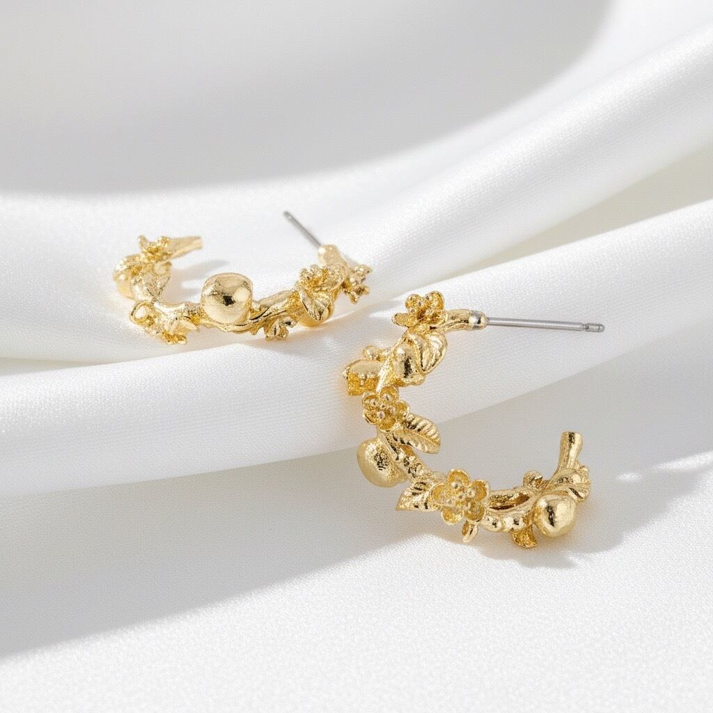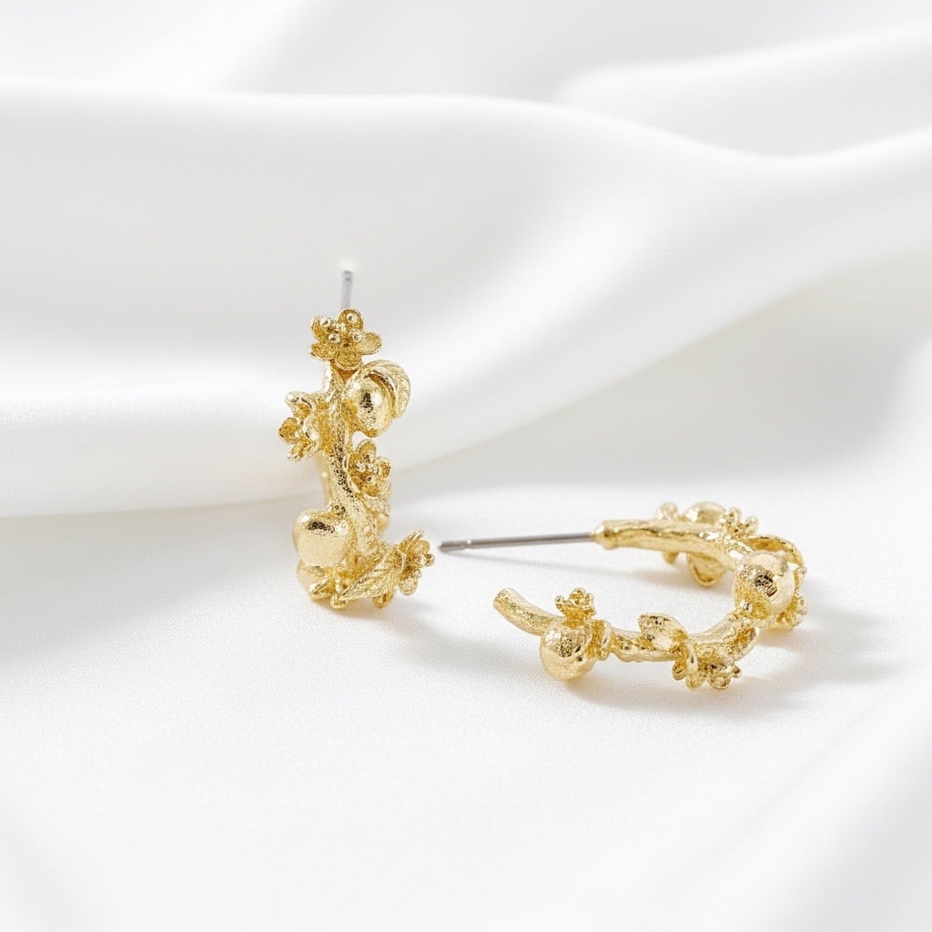 小さなお花や葉、実が立体的にあしらわれたデザインは、ナチュラルながらも華やかで、耳元に可憐な存在感を添えます。