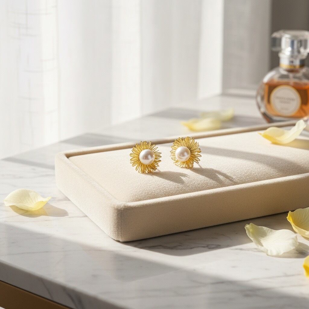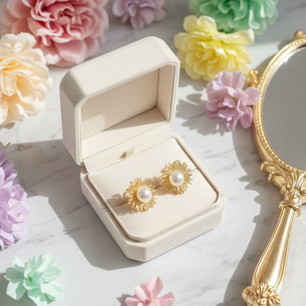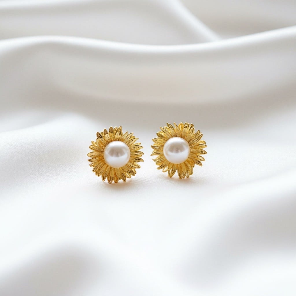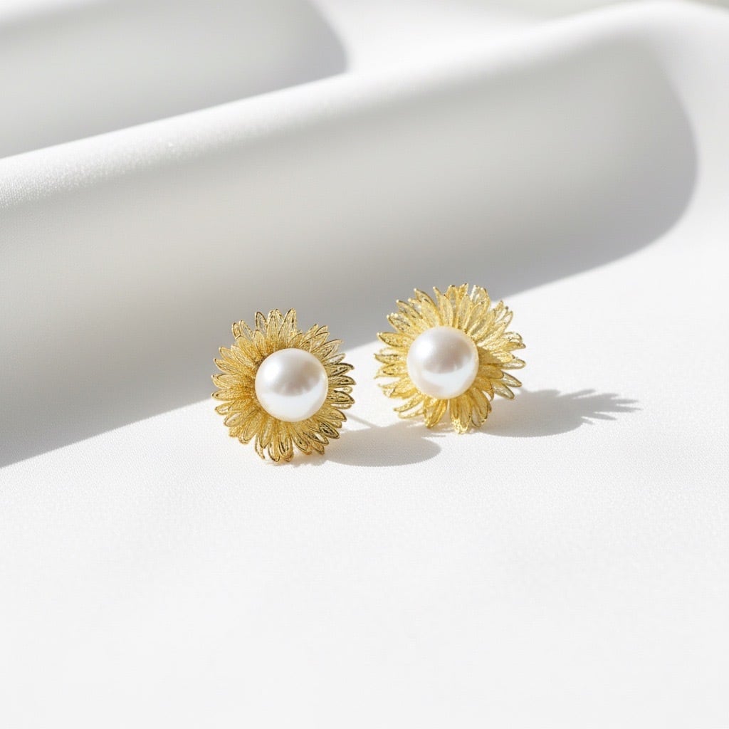 繊細なフラワーモチーフに、上品な光沢を放つ大ぶりのパールをあしらったスタッドピアス。ゴールドの花びらがやさしく広がり、中央のパールが光を受けて美しく輝きます。