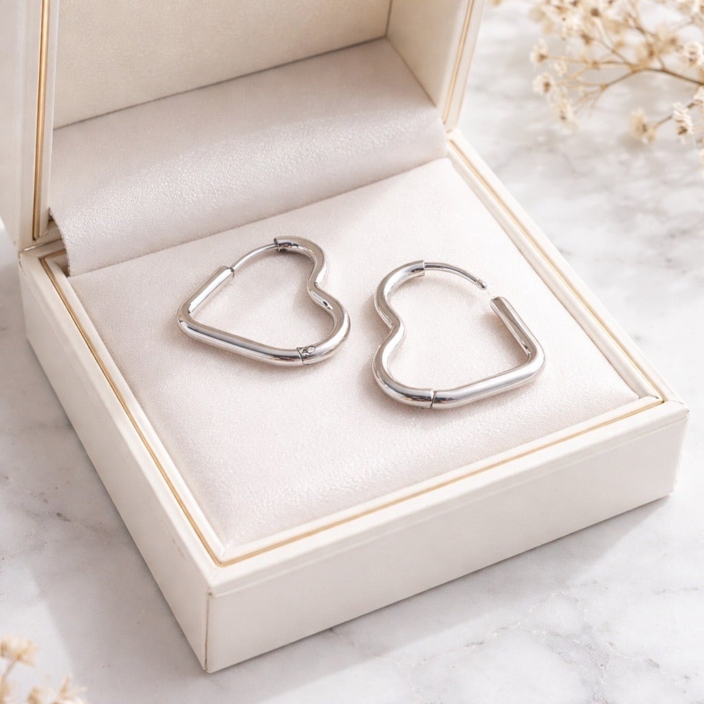 やわらかな曲線が愛らしい、ハートモチーフのフープピアス。丸みのあるハートラインが耳元にさりげない可愛らしさを添えるデザインです。ワンタッチ式でキャッチ不要のため、スムーズに着脱できるのも魅力。シンプルながら程よい存在感があり、コーディネートのアクセントとして活躍します。カラーはゴールドとシルバーの2色展開。カジュアルからフェミニンまで幅広いスタイルに合わせやすく、デイリーアクセサリーとしてもおすすめです。サージカルステンレス316L製で水や汗に強く、長くご愛用いただけます。