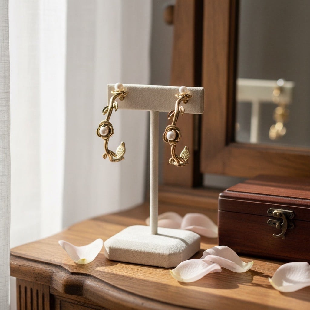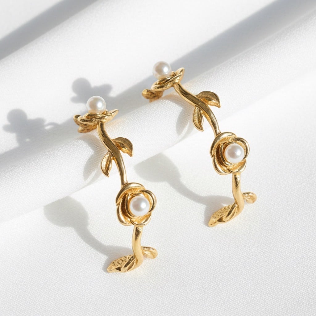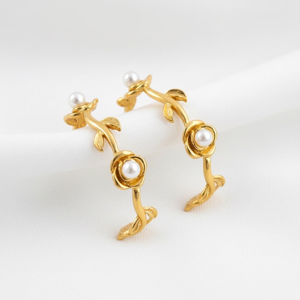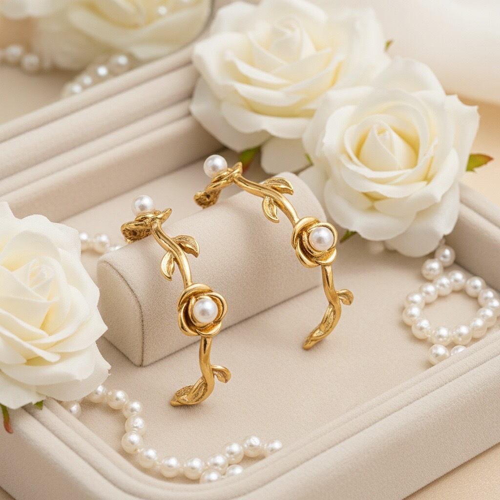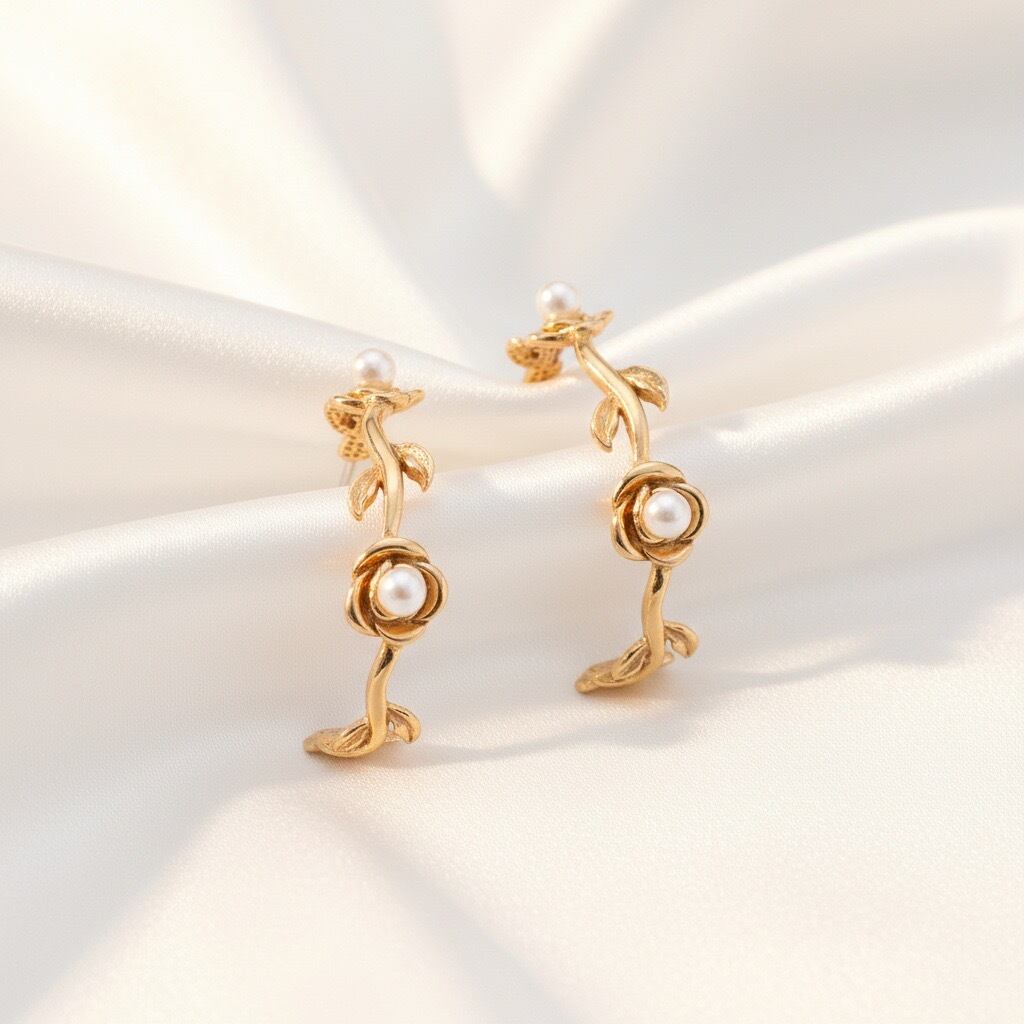 華やかなバラモチーフにガラスパールをセットした、優美な印象のフープピアス。