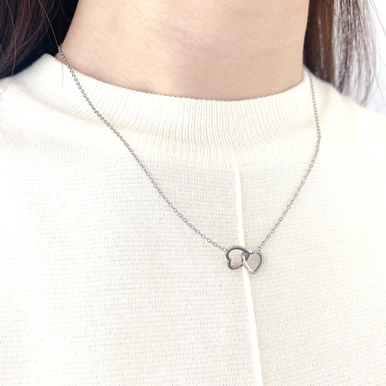 ふたつのハートが立体的に重なり合う、シンプルながらも印象的なデザインのネックレス。日常使いしやすいミニマルなサイズ感で、上品さと可愛らしさを兼ね備えたデザインは、大人のデイリースタイルにもぴったり。
