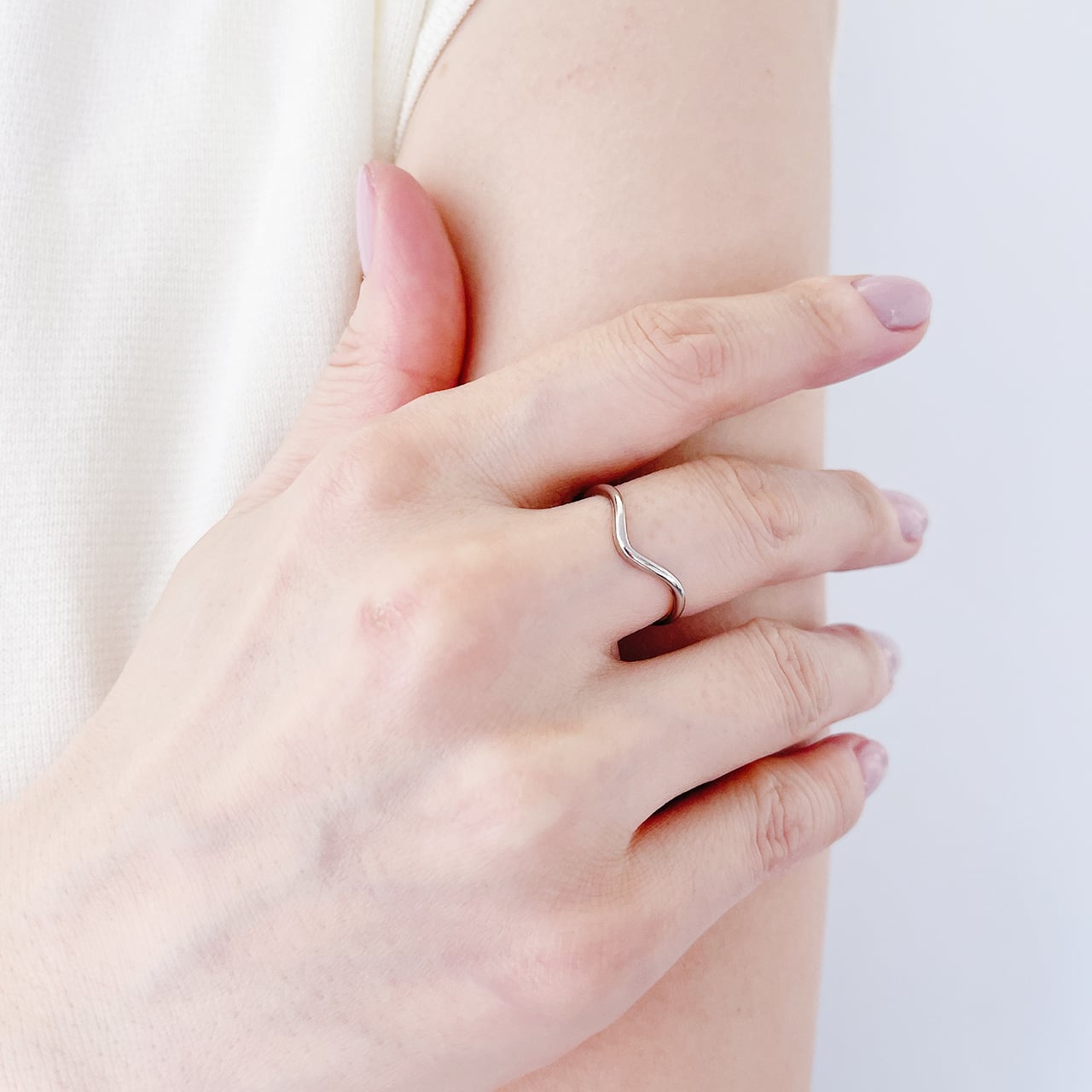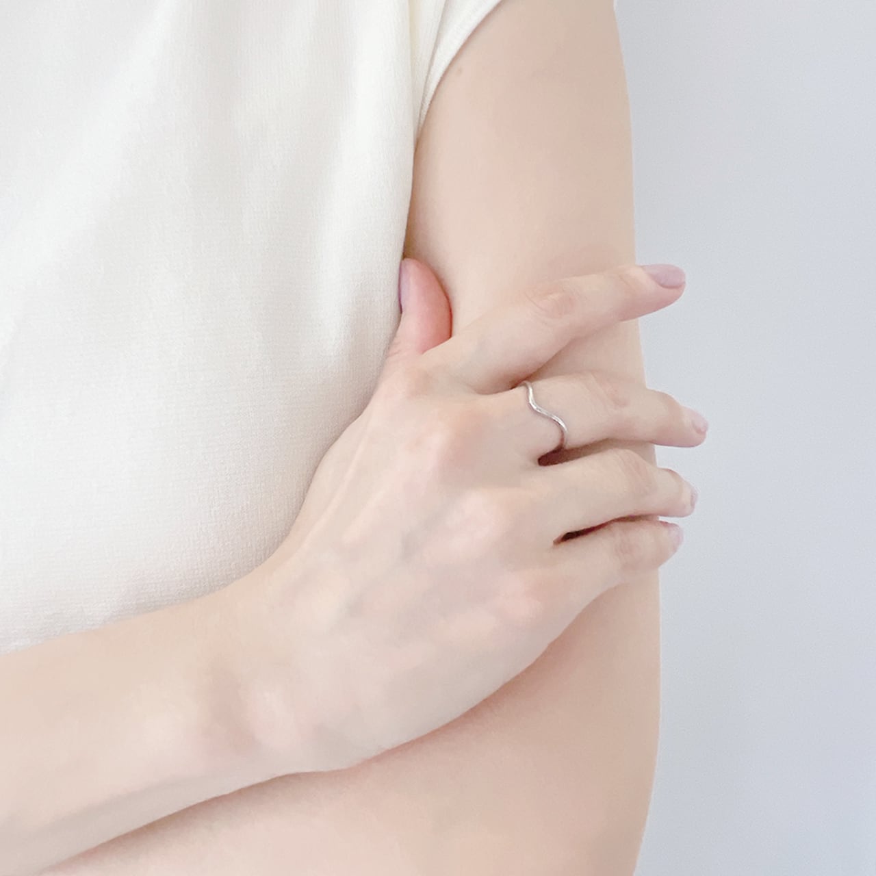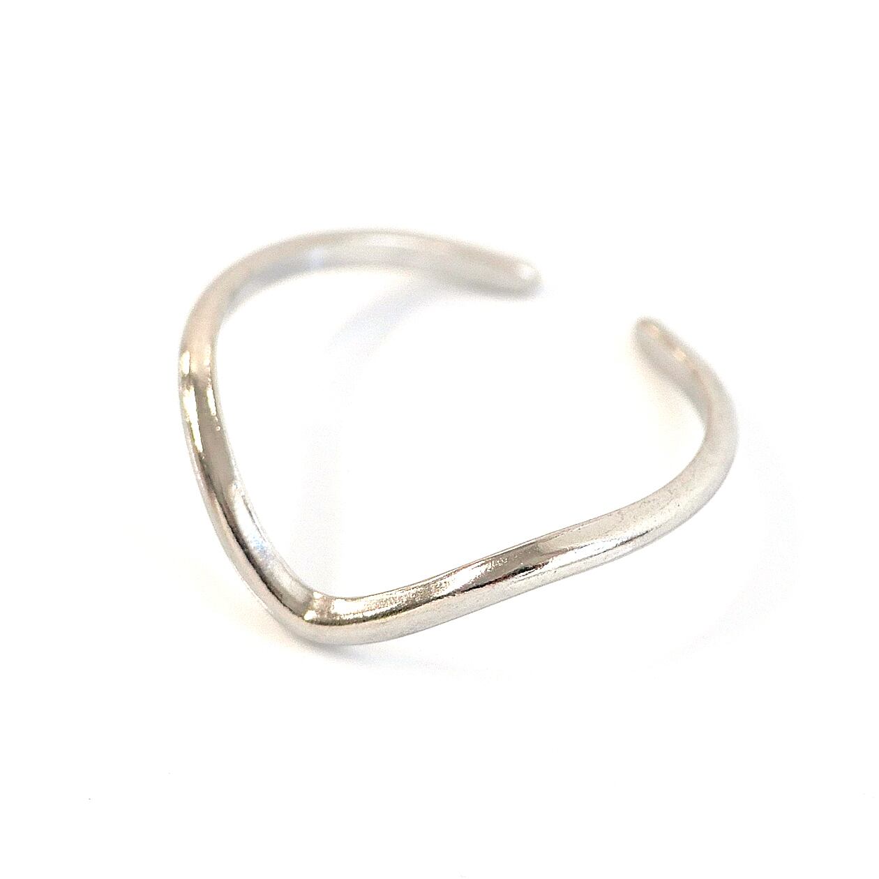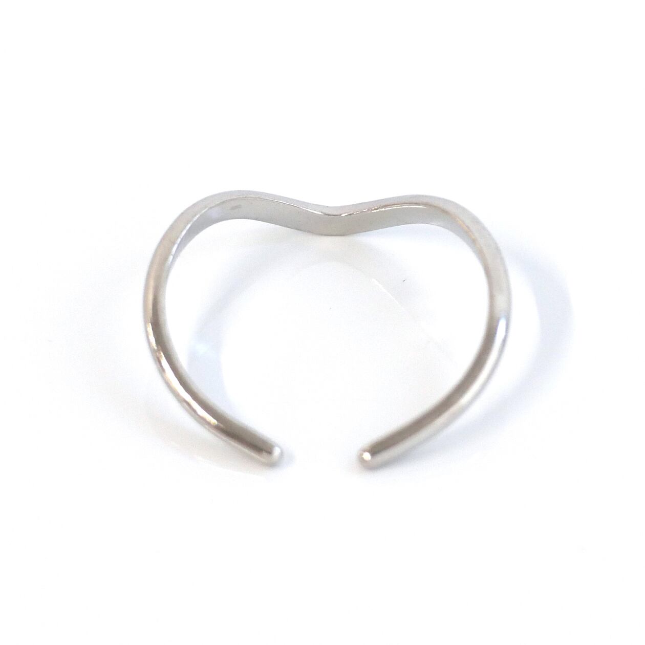 やさしくカーブを描くV字ラインが指先をすっきり見せてくれる、ミニマルなオープンリング。さりげないデザインながら凛とした表情があり、一本で着けても重ね付けしても手元に上品なニュアンスを添えてくれます。日常のコーディネートに自然と寄り添う、毎日使いにぴったりのアイテムです。