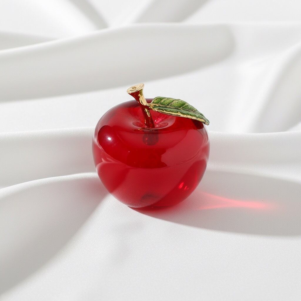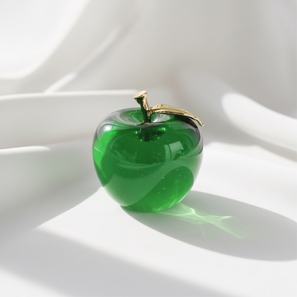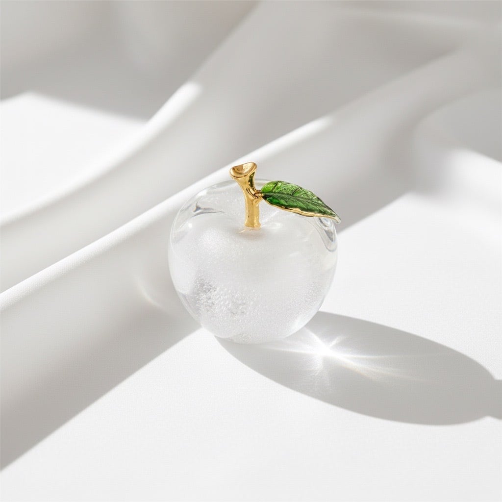 透明感あふれるガラスでかたどられた、りんごモチーフのインテリアオブジェです。ころんとした丸みのあるフォルムと、つややかな光沢が魅力。ゴールドの枝とグリーンの葉がアクセントとなり、上品で洗練された印象を与えます。
