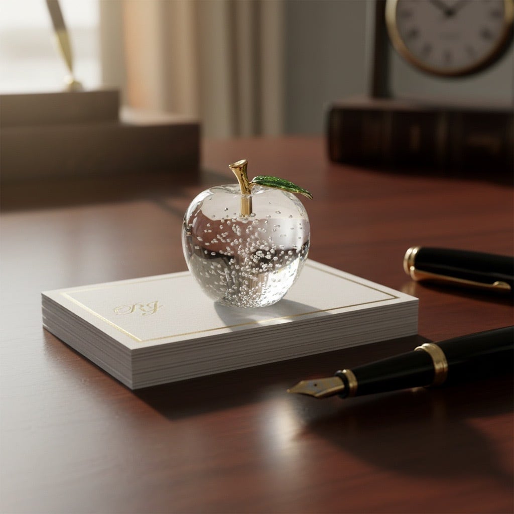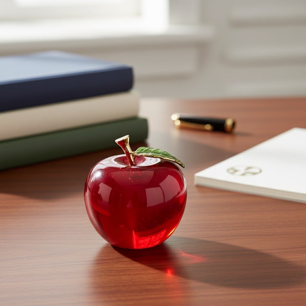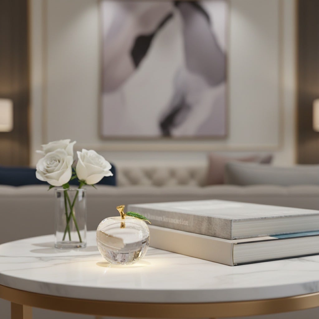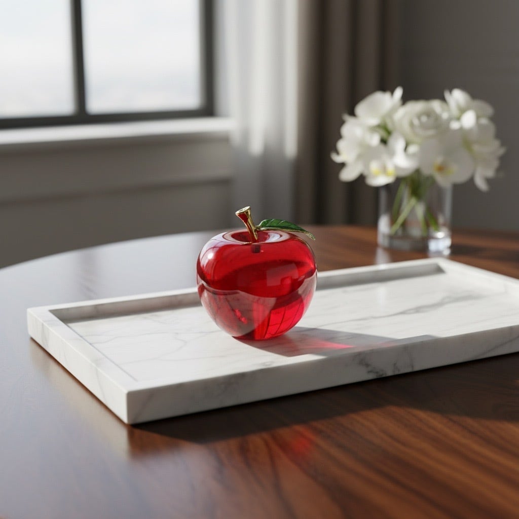 透明感あふれるガラスでかたどられた、りんごモチーフのインテリアオブジェです。ころんとした丸みのあるフォルムと、つややかな光沢が魅力。ゴールドの枝とグリーンの葉がアクセントとなり、上品で洗練された印象を与えます。