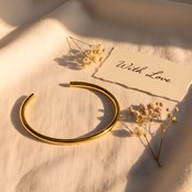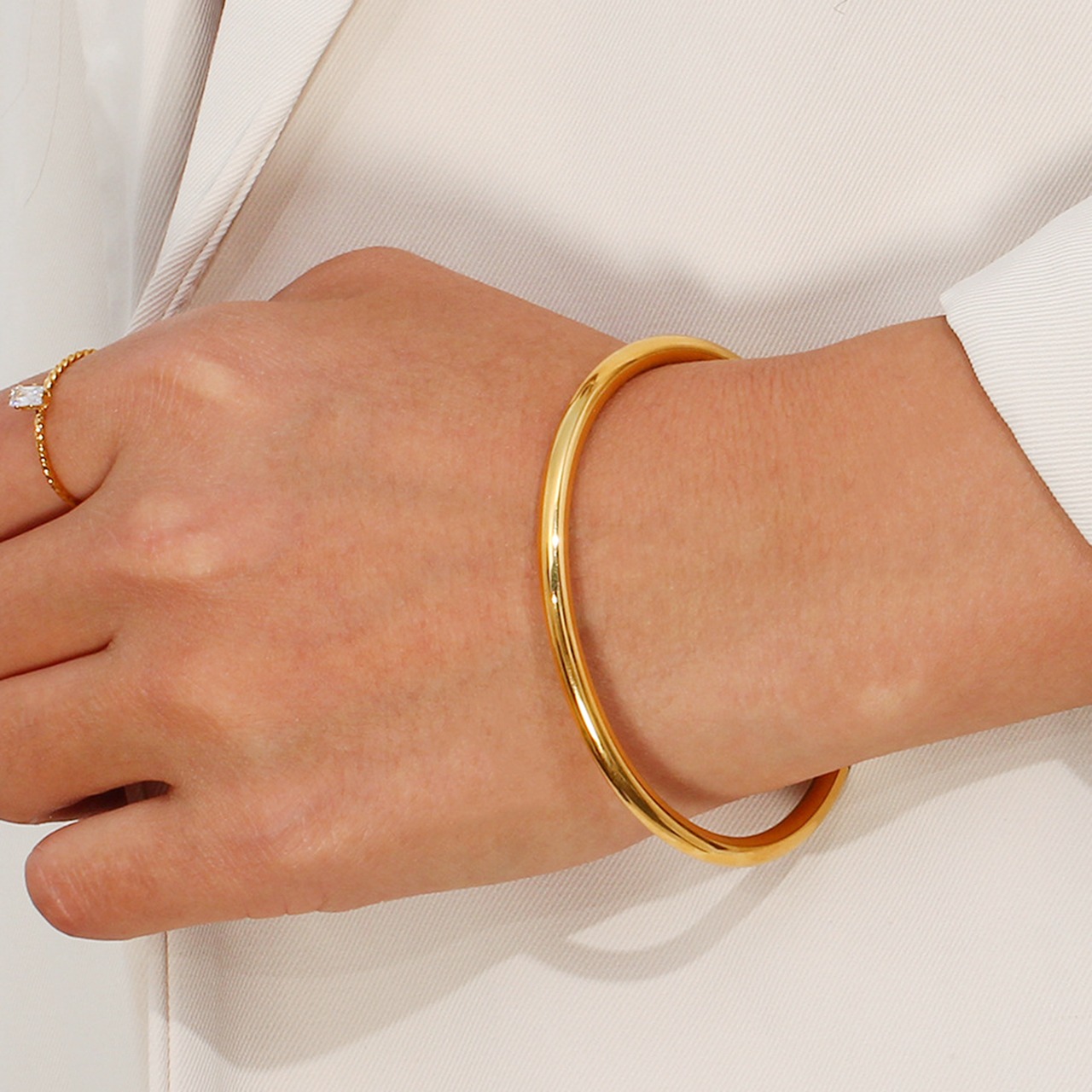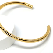 艶やかなゴールドカラーが手元を明るく魅せる、ミニマルデザインのラウンドバングル。無駄のないシンプルなフォルムで、カジュアルにもきれいめにも自然に馴染む万能アイテムです。約4mm幅の程よいボリュームが上品な存在感を添え、単体でも重ね付けでも美しくスタイリングできます。シーズンを問わず使いやすく、ギフトにも選ばれるシンプルバングルです。