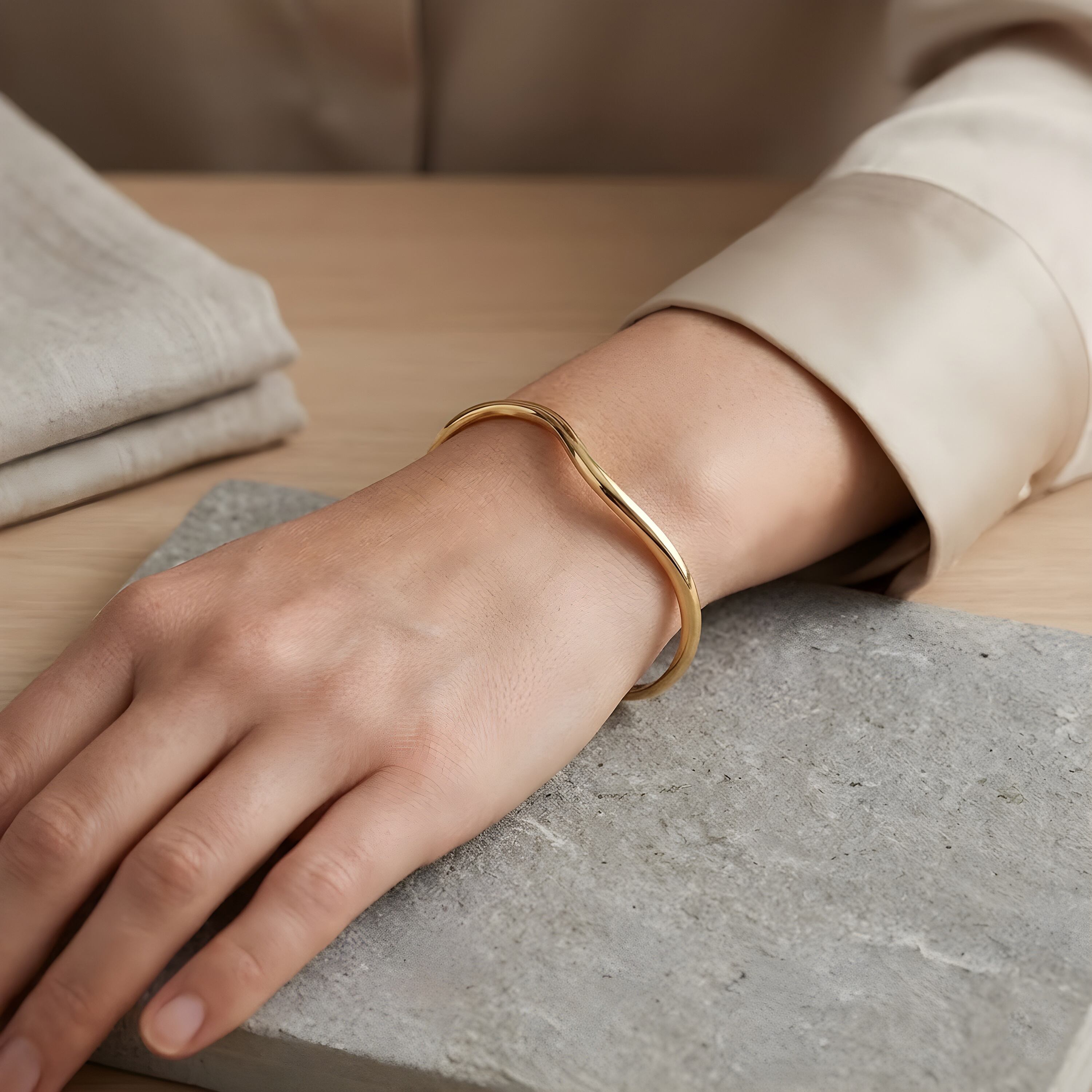 なめらかな曲線が印象的な、ミニマルデザインのウェーブバングル。シンプルながらも程よいアクセントとなり、手元に洗練された印象を与えてくれます。やや細身のラインで、他のバングルや時計との重ね付けにもぴったり。ゴールドとシルバーの2色展開で、気分やコーディネートに合わせて選べます。