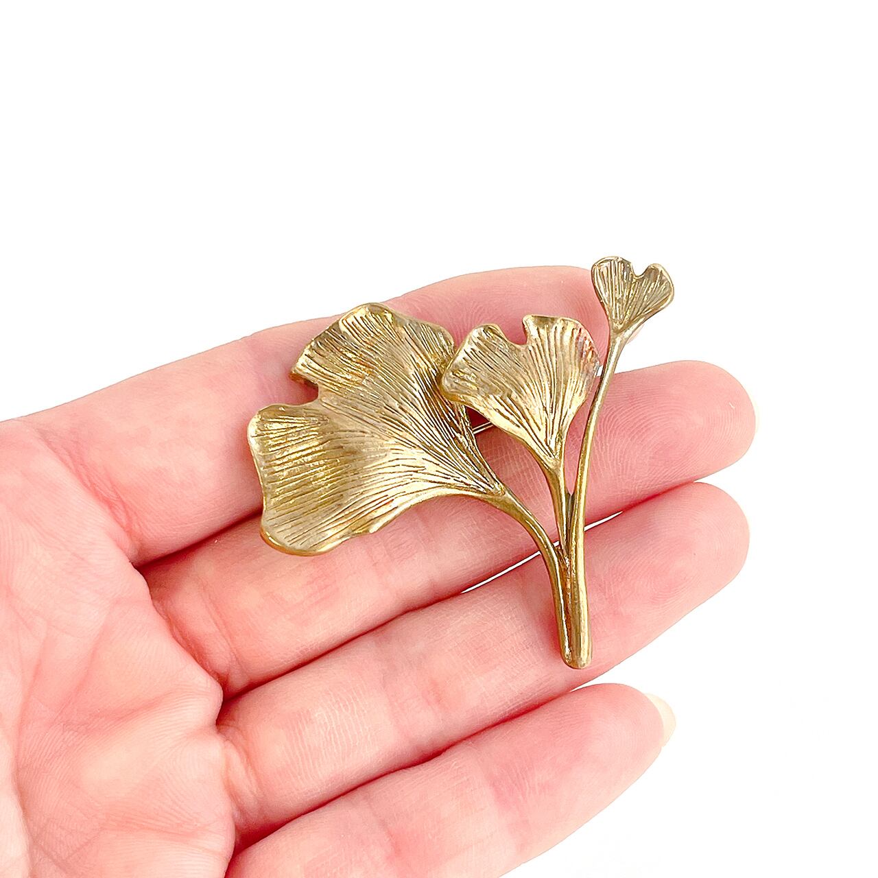 繊細な葉脈まで丁寧に再現された、イチョウモチーフの真鍮製ブローチ。アンティーク調のゴールドカラーが、装いに上品な華やかさを添えてくれます。ジャケットやストール、バッグなどのワンポイントにおすすめです。