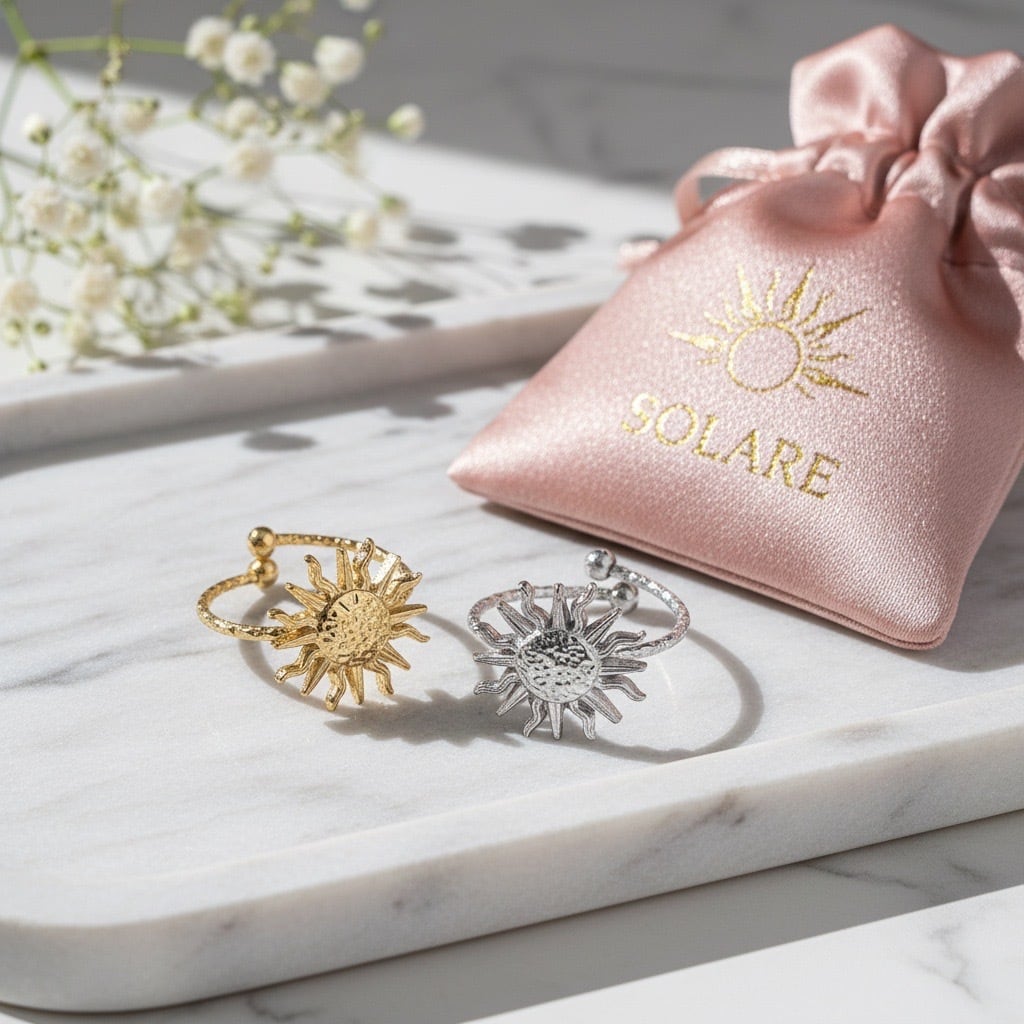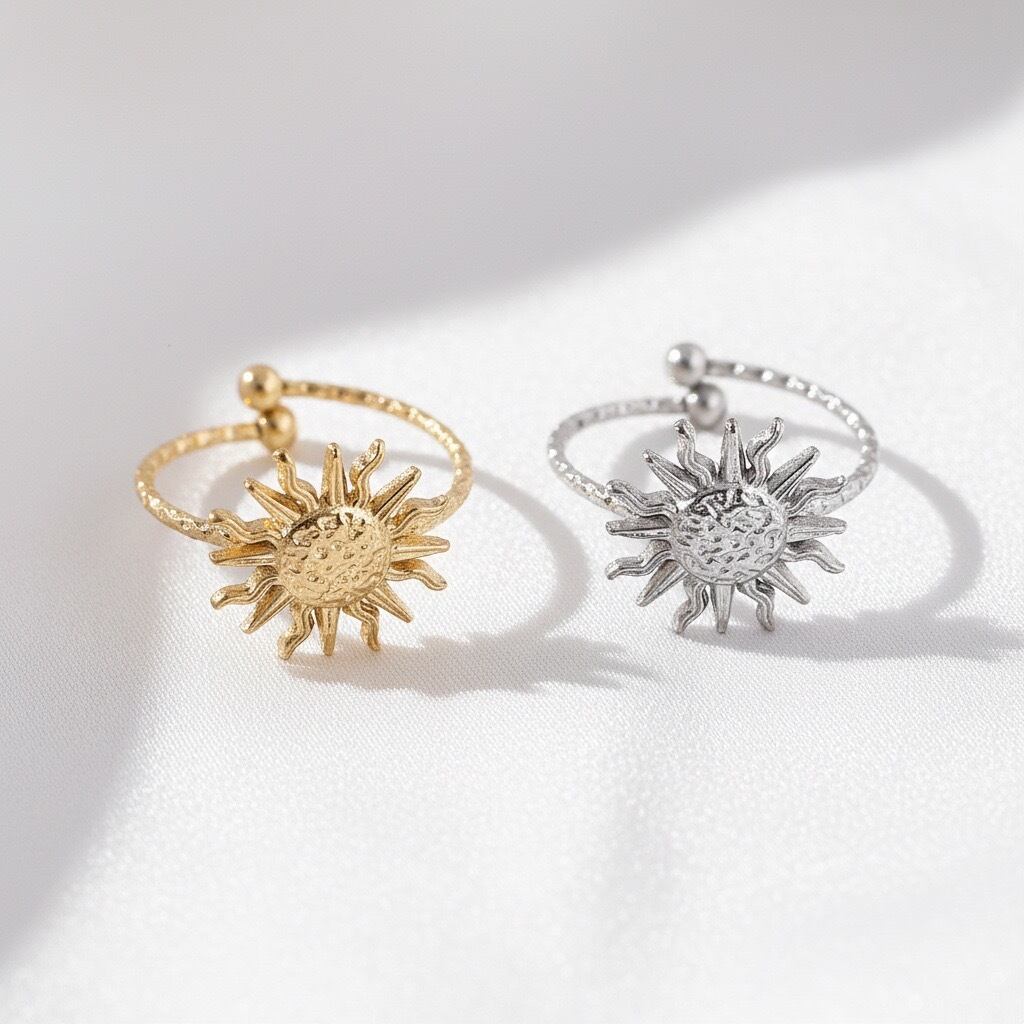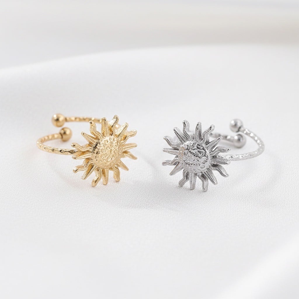 生命力を感じさせる太陽をモチーフにした、存在感のあるオープンリング。放射状に広がるデザインと繊細なテクスチャーが、指先に輝きを添えます。カラーは、華やかなゴールドと洗練されたシルバーの2色展開。季節を問わず、カジュアルからきれいめまで幅広いスタイルにマッチします。