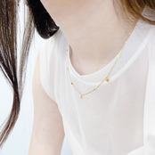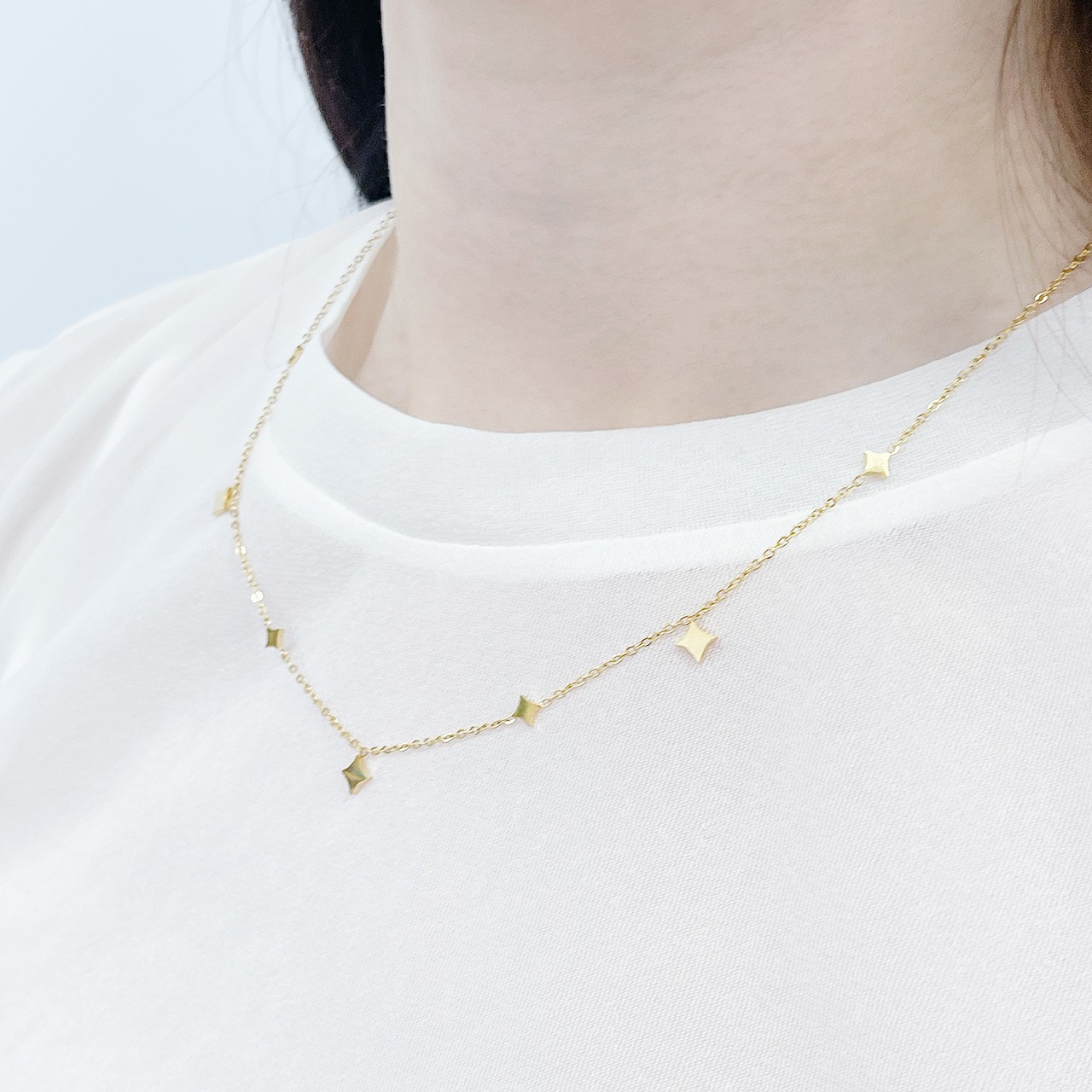 小さなダイヤシェイプモチーフをリズミカルに並べた、上品で軽やかなネックレス。シンプルな装いにさりげなく華やかさを添えてくれる、ミニマルなデザインが魅力です。首元に程よいアクセントを与える長さで、デイリーにもフォーマルにもお使いいただけます。重ね着けにもおすすめの、万能ネックレスです。