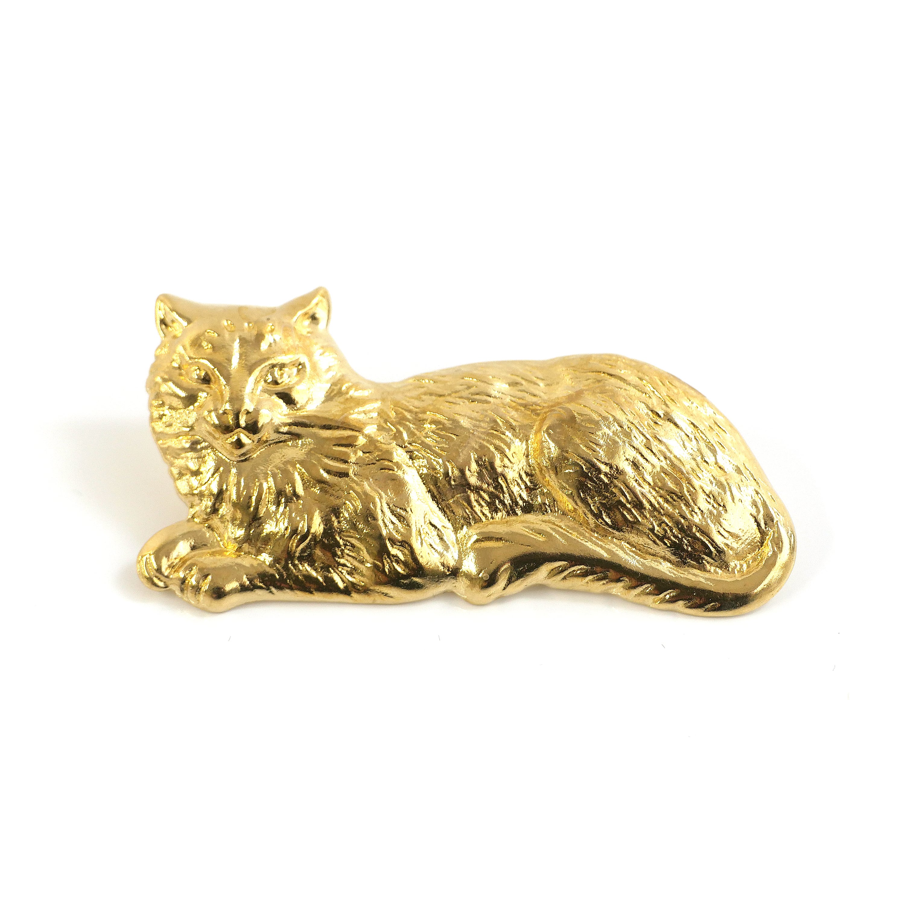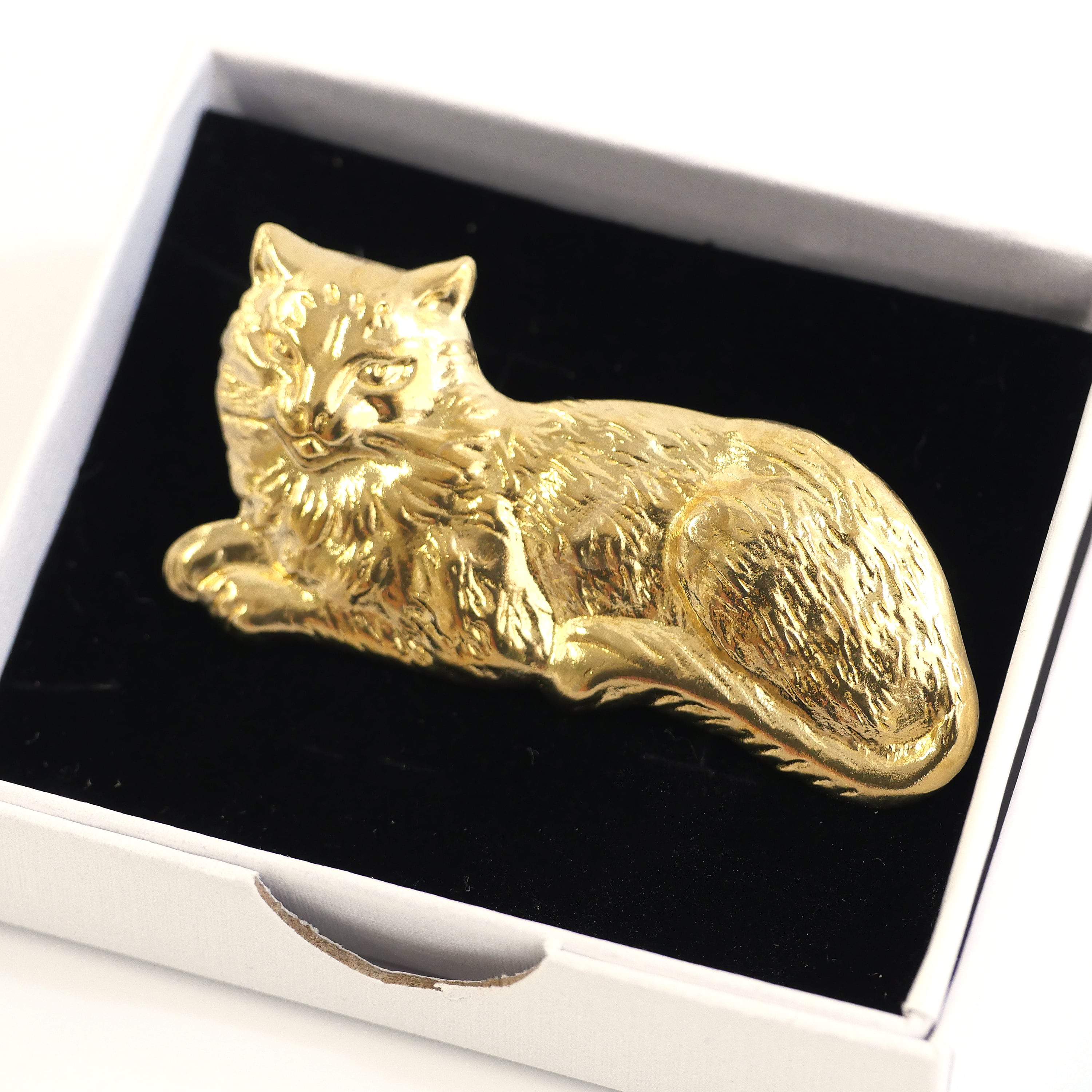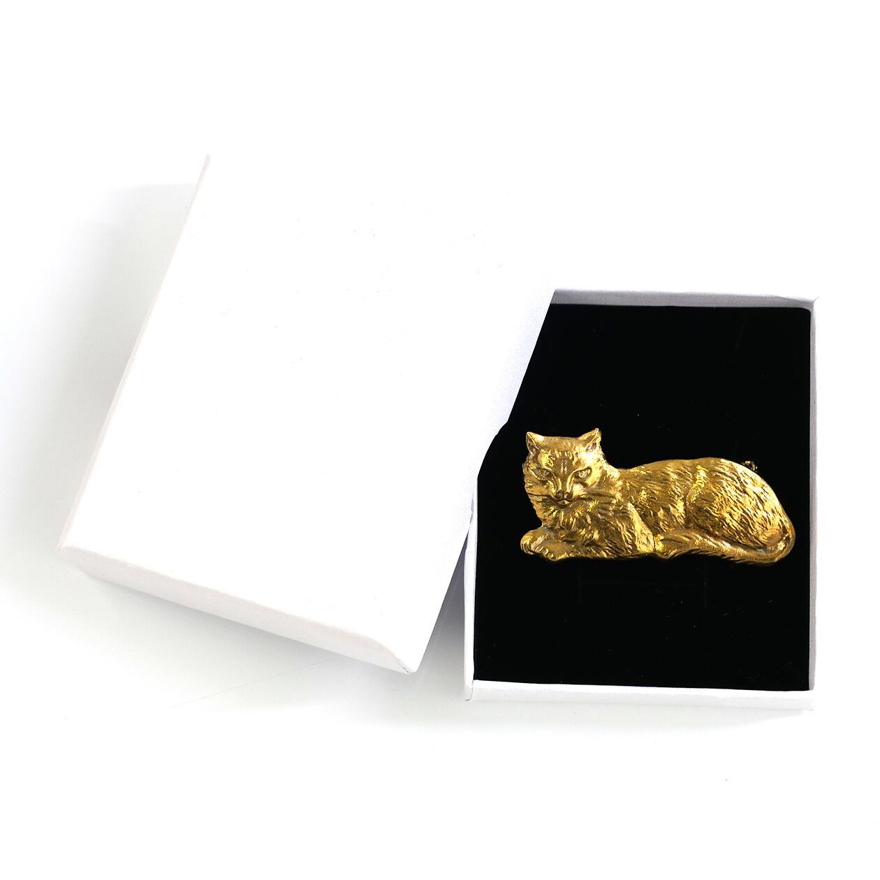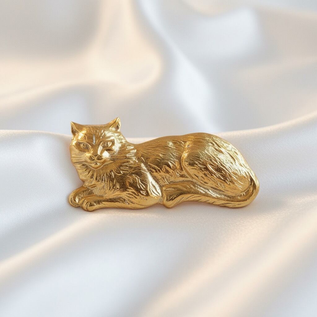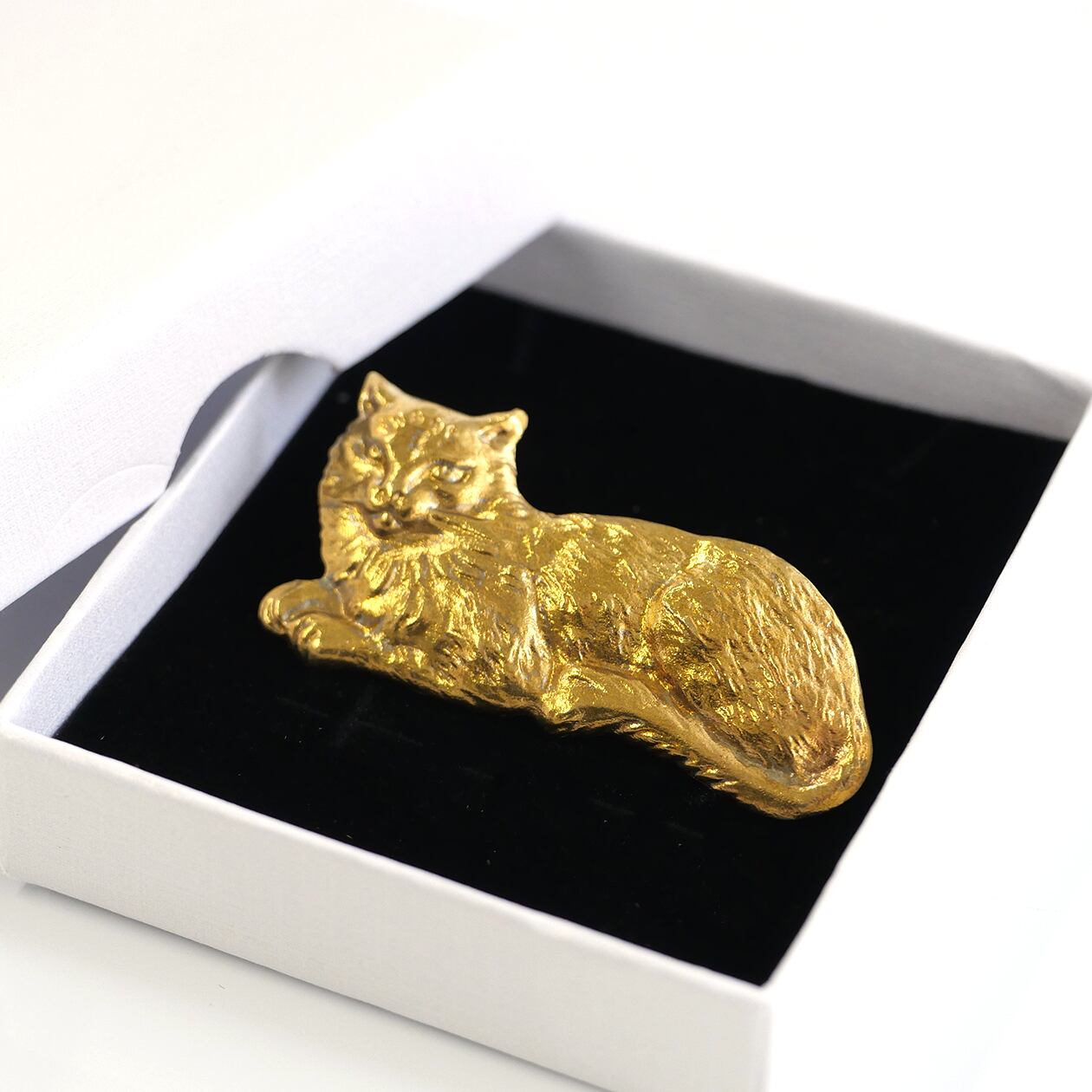 こちらをじっと見つめるような表情と、くつろぐポーズが愛らしい、ねこモチーフの真鍮ブローチ。細部まで丁寧に表現された毛並みや輪郭が魅力で、落ち着いたアンティーク調ゴールドがクラシカルな印象を与えてくれます。ジャケットやシャツ、バッグやストールなどにさりげなく添えるだけで、大人の遊び心を感じさせるアクセントに。専用ボックスに入れてお届けいたしますので、ギフトにもぴったりです。
