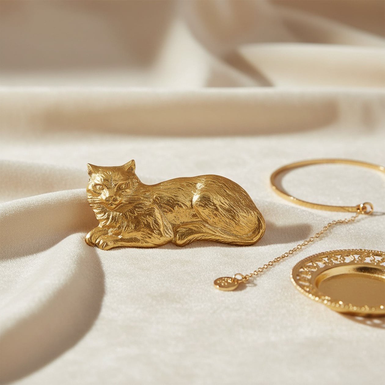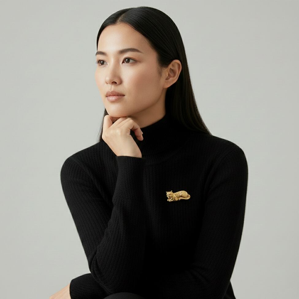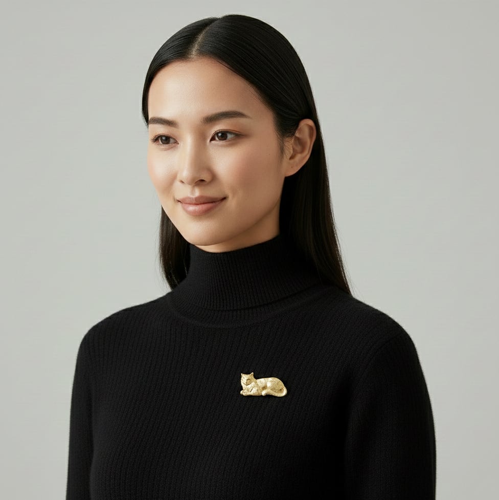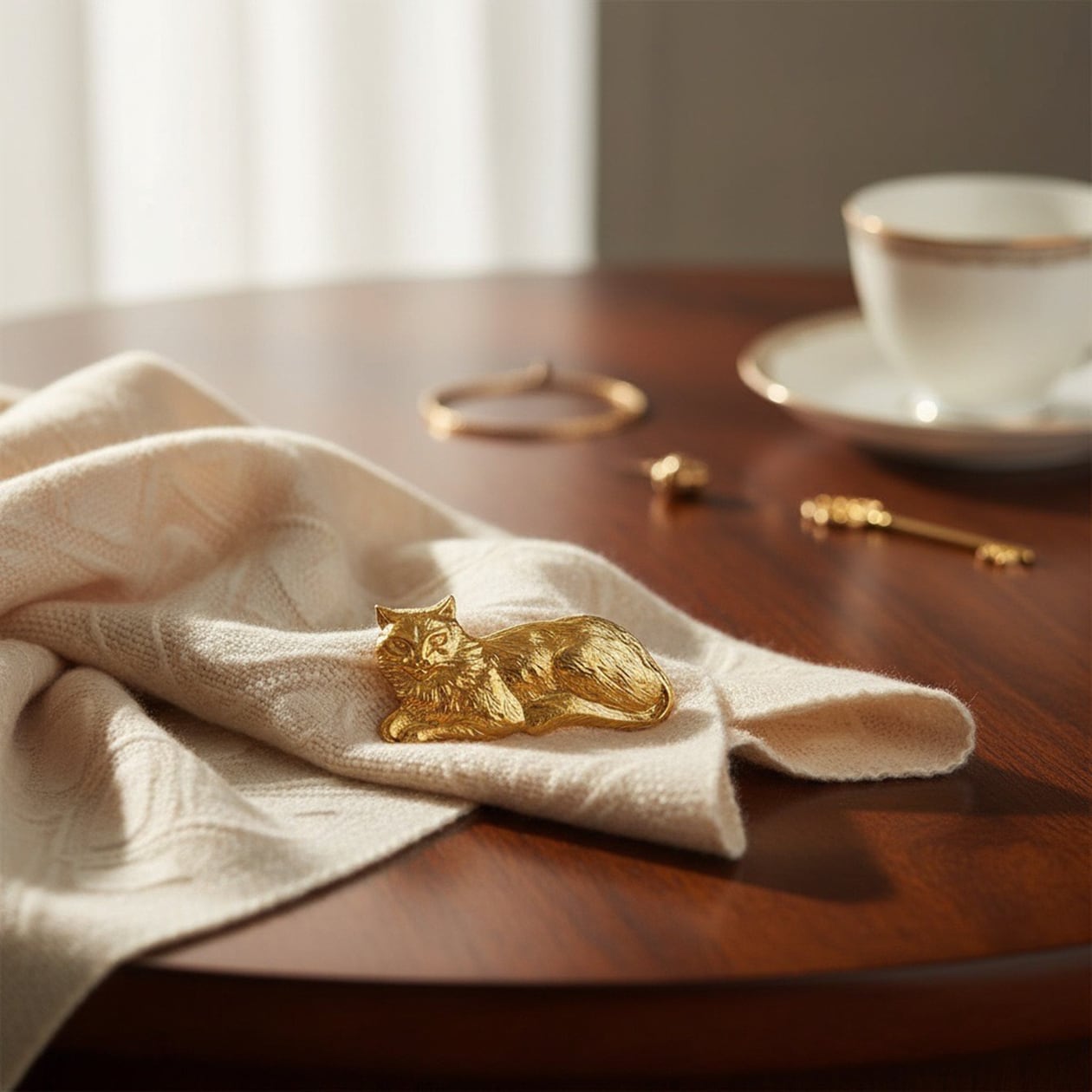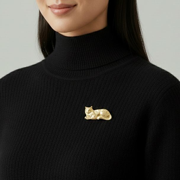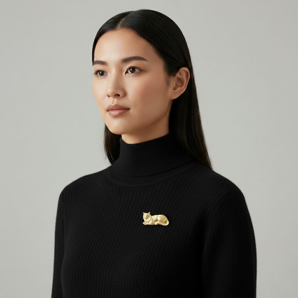 こちらをじっと見つめるような表情と、くつろぐポーズが愛らしい、ねこモチーフの真鍮ブローチ。細部まで丁寧に表現された毛並みや輪郭が魅力で、落ち着いたアンティーク調ゴールドがクラシカルな印象を与えてくれます。ジャケットやシャツ、バッグやストールなどにさりげなく添えるだけで、大人の遊び心を感じさせるアクセントに。専用ボックスに入れてお届けいたしますので、ギフトにもぴったりです。
