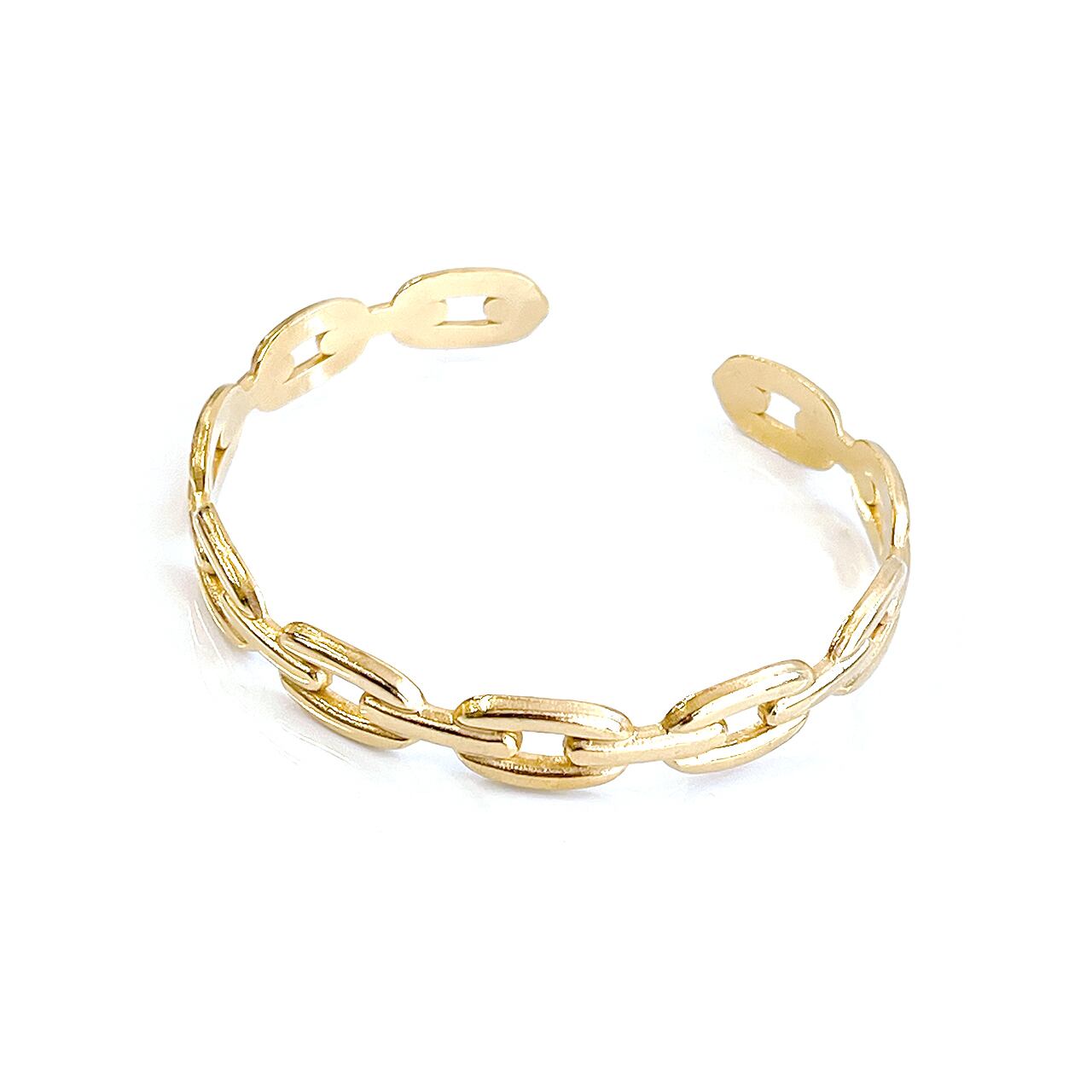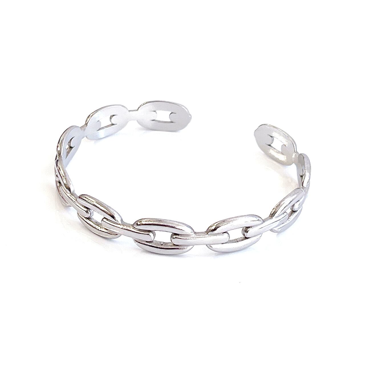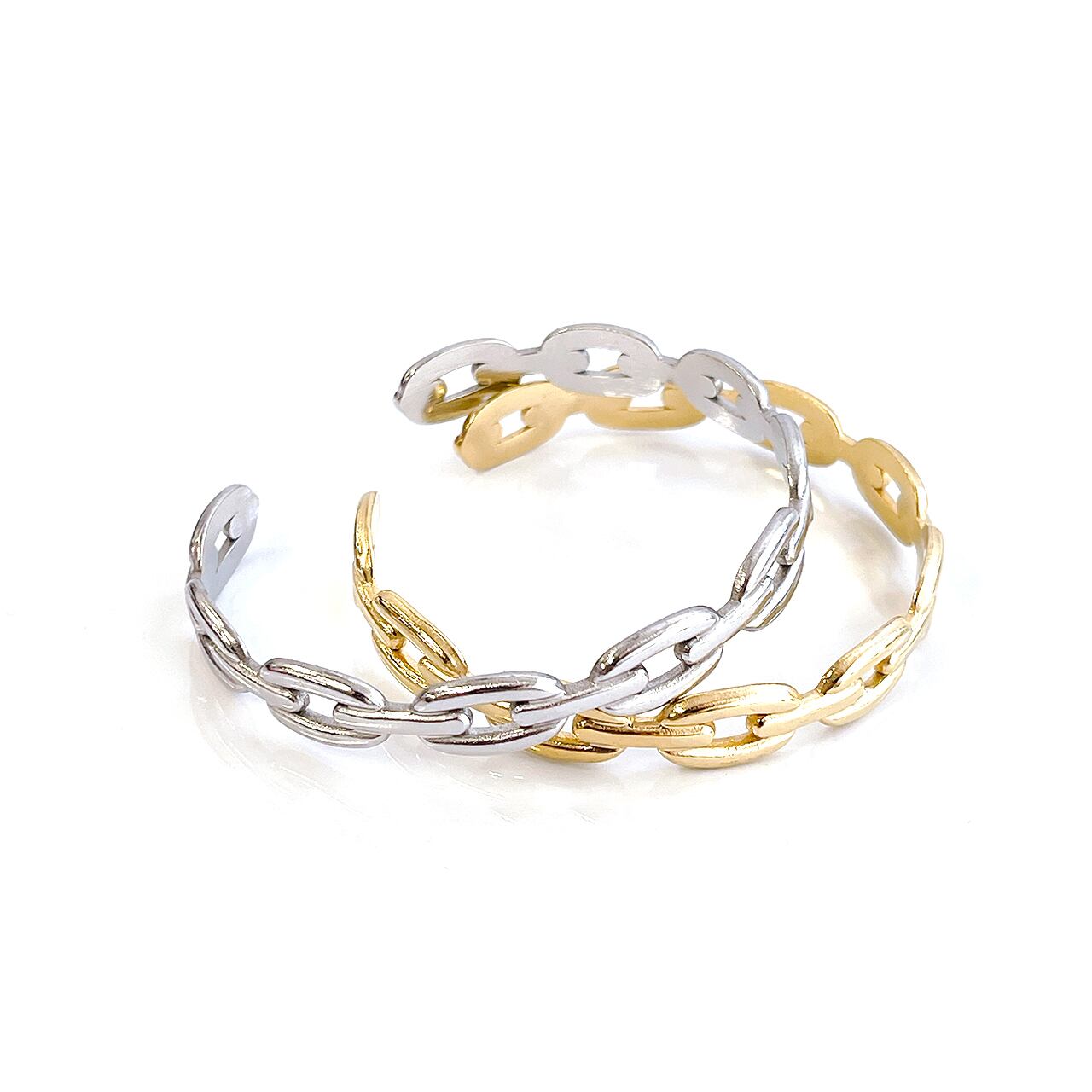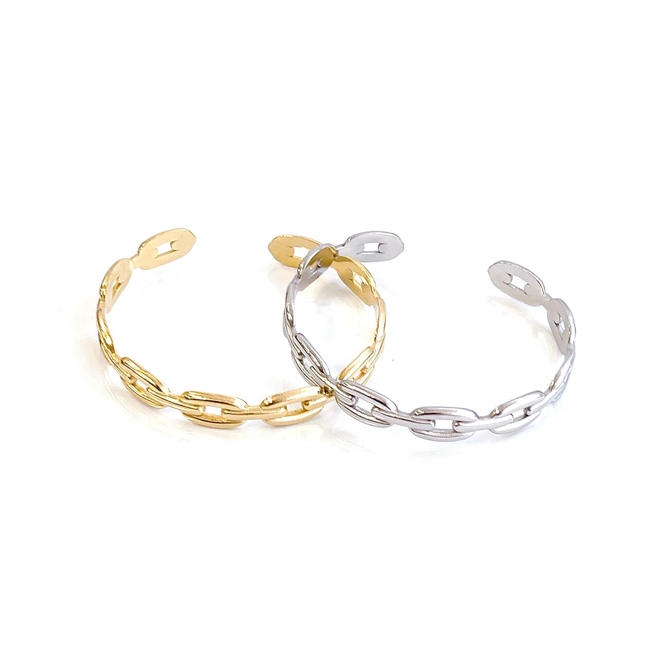 チェーンを思わせるリンクデザインが目を引く、サージカルステンレス製のバングル。 シンプルでありながら存在感があり、手元にモードなアクセントをプラスしてくれます。 シルバーとゴールドの2色展開で、カジュアルからきれいめまで幅広いコーディネートにマッチ。オープンタイプのデザインなので着脱も簡単で、男女問わずお使いいただけるユニセックスアイテムです。 水や汗に強く、変色しにくいサージカルステンレス素材を使用しており、長く美しい輝きをお楽しみいただけます。贈り物にも最適です。
