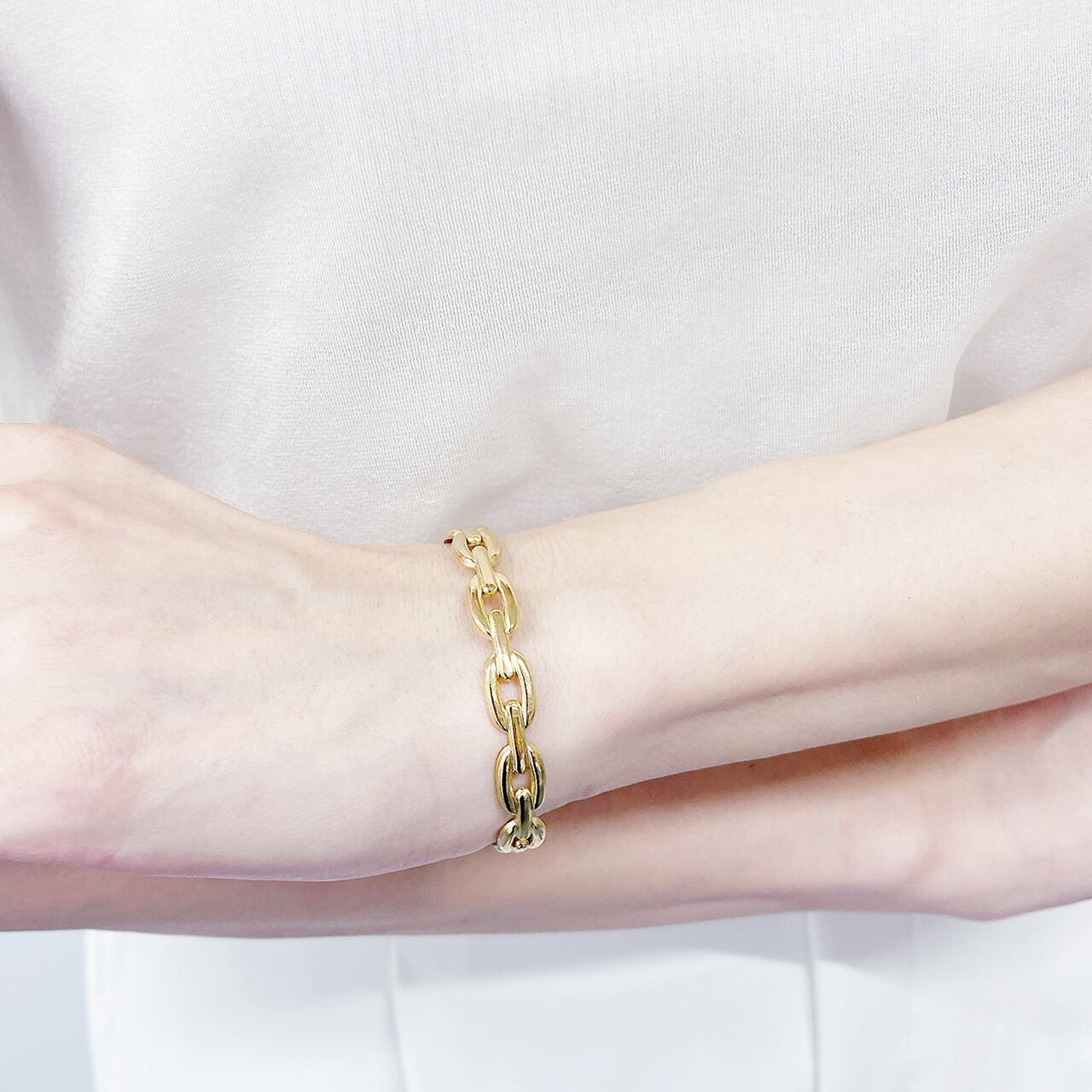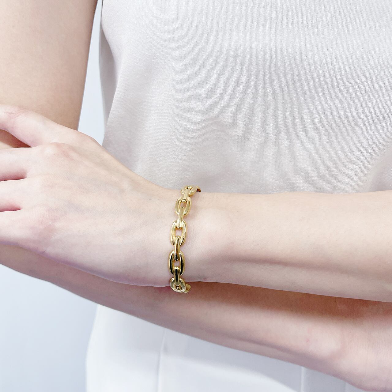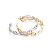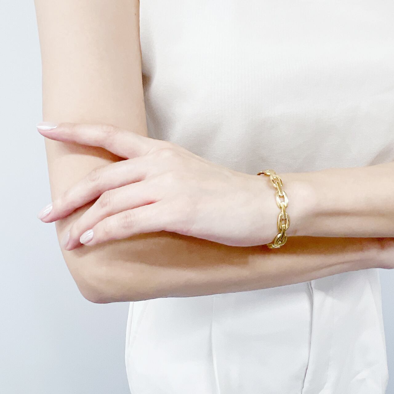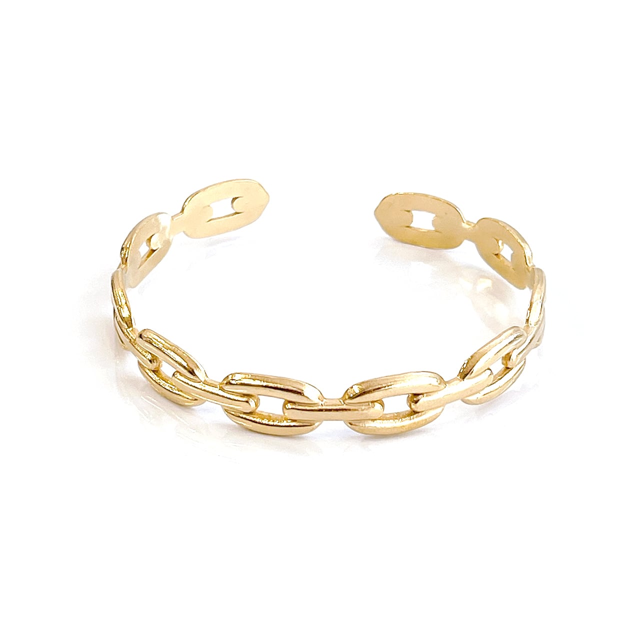 チェーンを思わせるリンクデザインが目を引く、サージカルステンレス製のバングル。 シンプルでありながら存在感があり、手元にモードなアクセントをプラスしてくれます。 シルバーとゴールドの2色展開で、カジュアルからきれいめまで幅広いコーディネートにマッチ。オープンタイプのデザインなので着脱も簡単で、男女問わずお使いいただけるユニセックスアイテムです。 水や汗に強く、変色しにくいサージカルステンレス素材を使用しており、長く美しい輝きをお楽しみいただけます。贈り物にも最適です。
