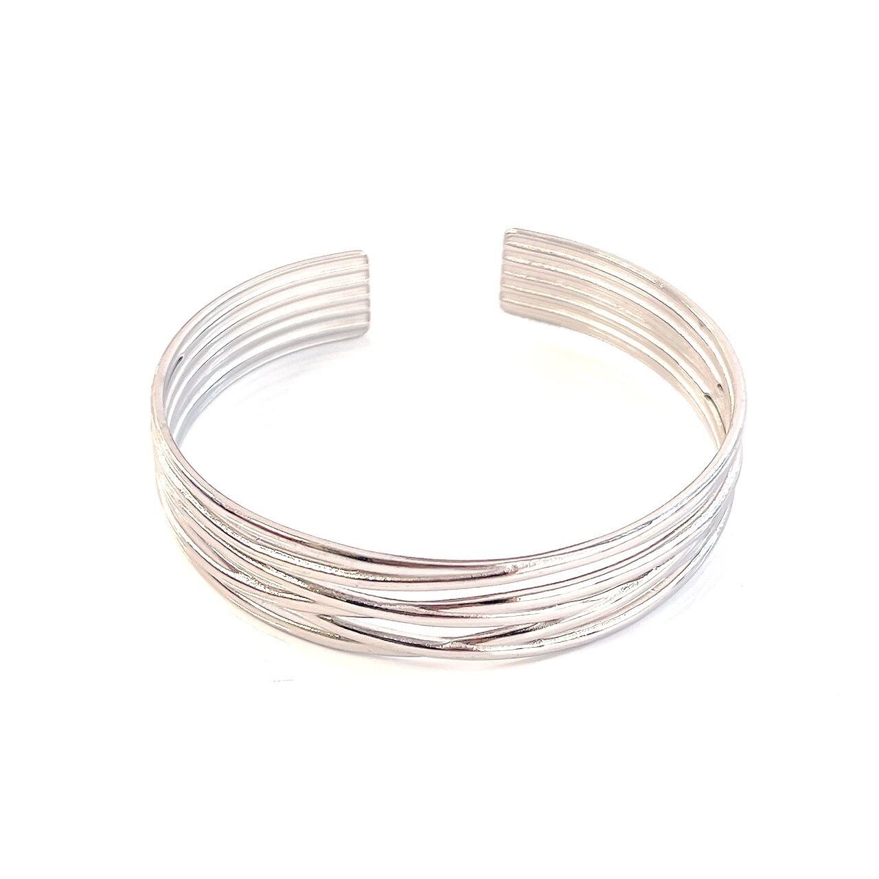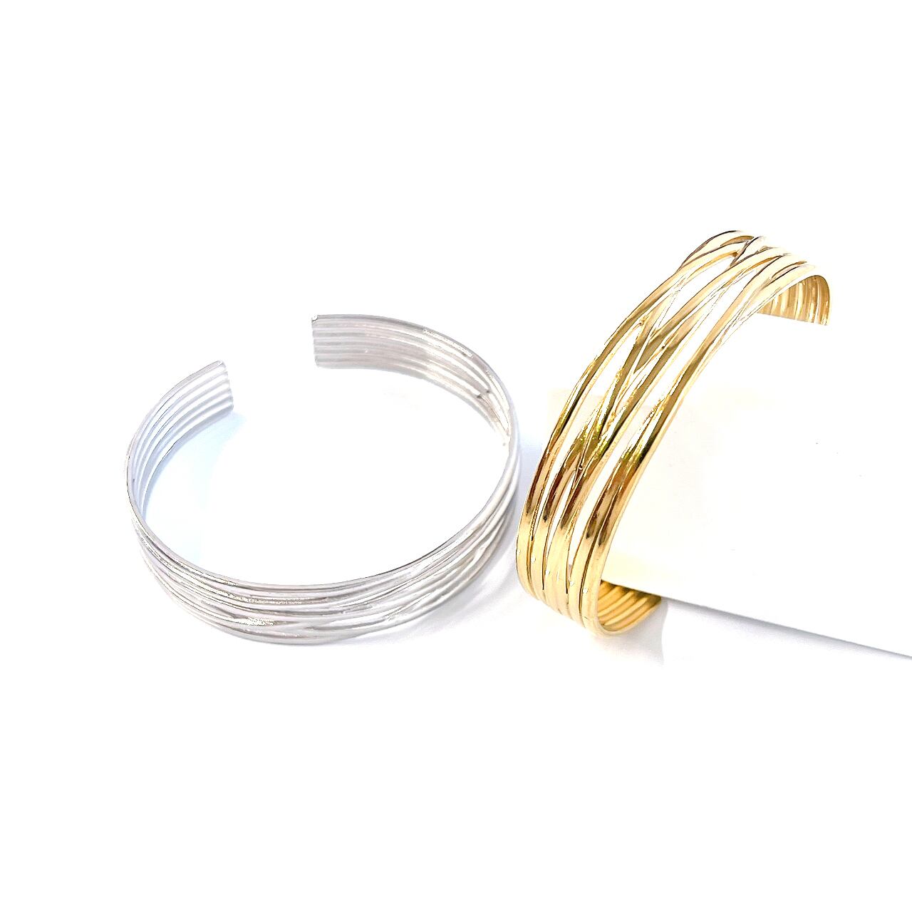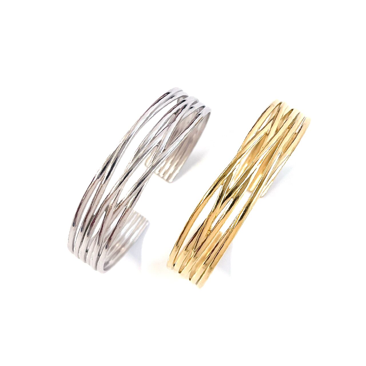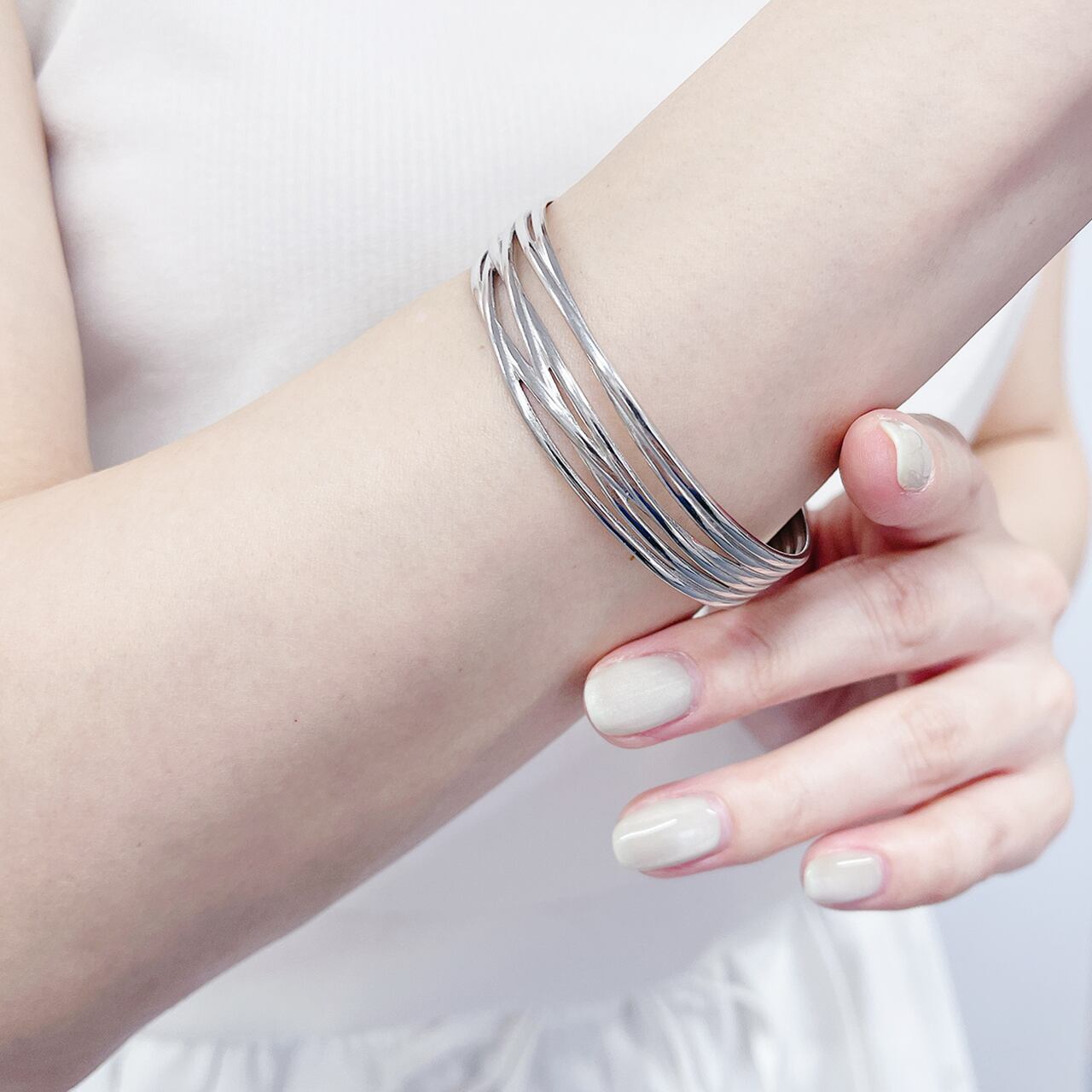 緩やかに重なるラインが美しい、ミニマルデザインのバングル。シンプルで洗練されたフォルムは、手元にさりげない輝きを添えてくれます。カジュアルからオフィススタイルまで、どんな装いにも自然にマッチするデザインです。ゴールドとシルバー、2色からお選びいただけます。