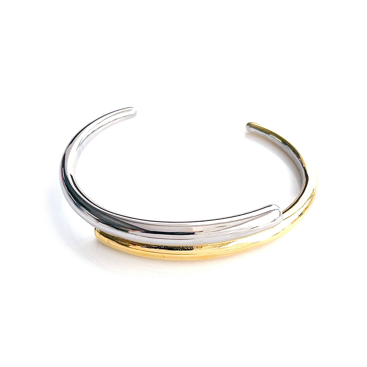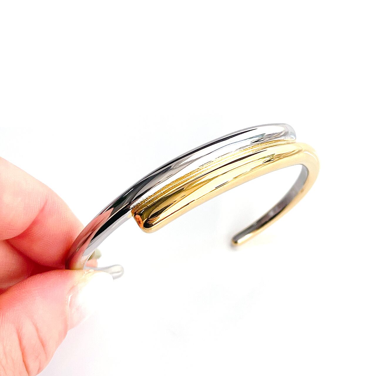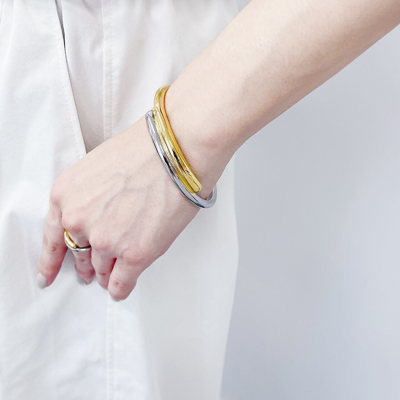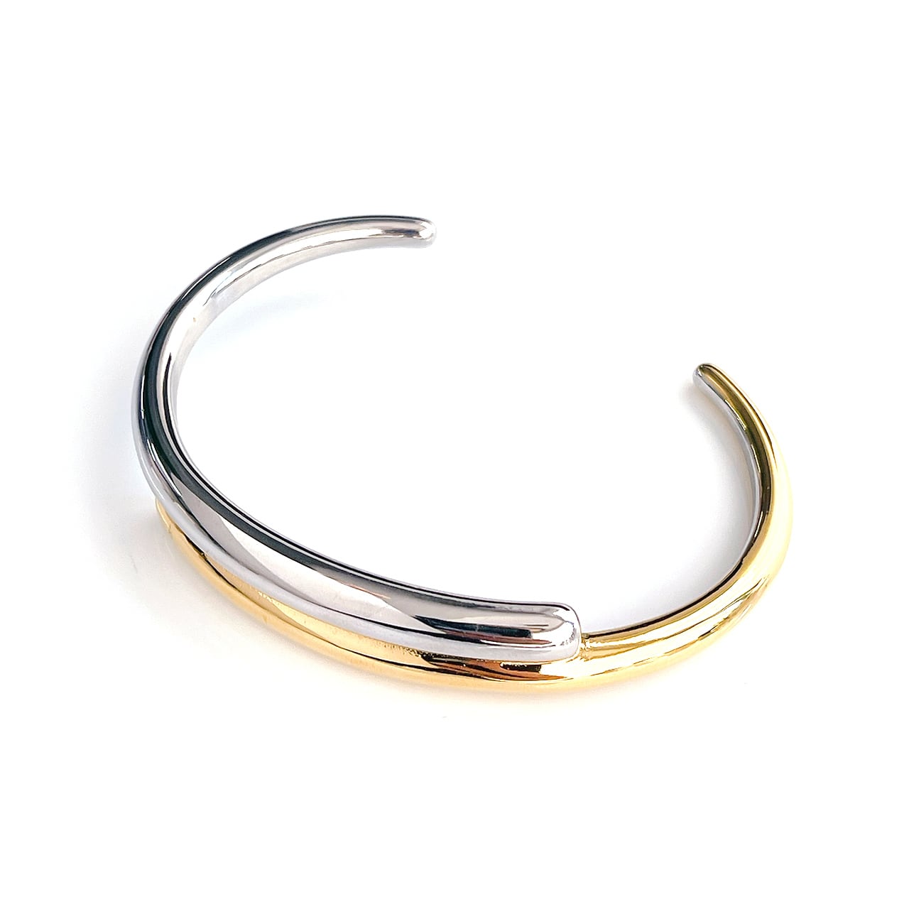 2本のラインが寄り添うように重なった、シンプルで上品なデザインのバングル。ゴールドとシルバーの輝きが手元に華やかさを添え、カジュアルにもフォーマルにも馴染みます。