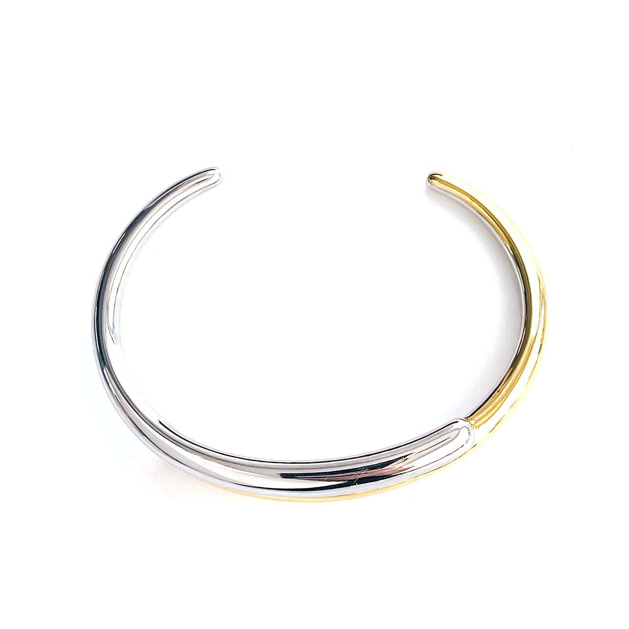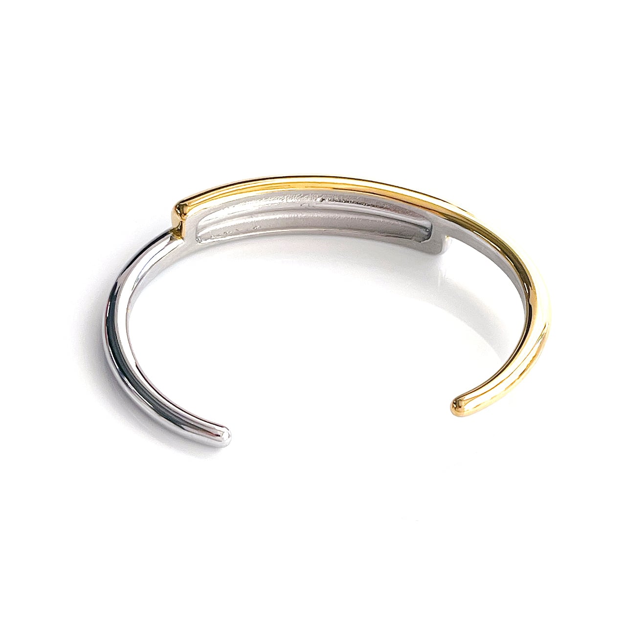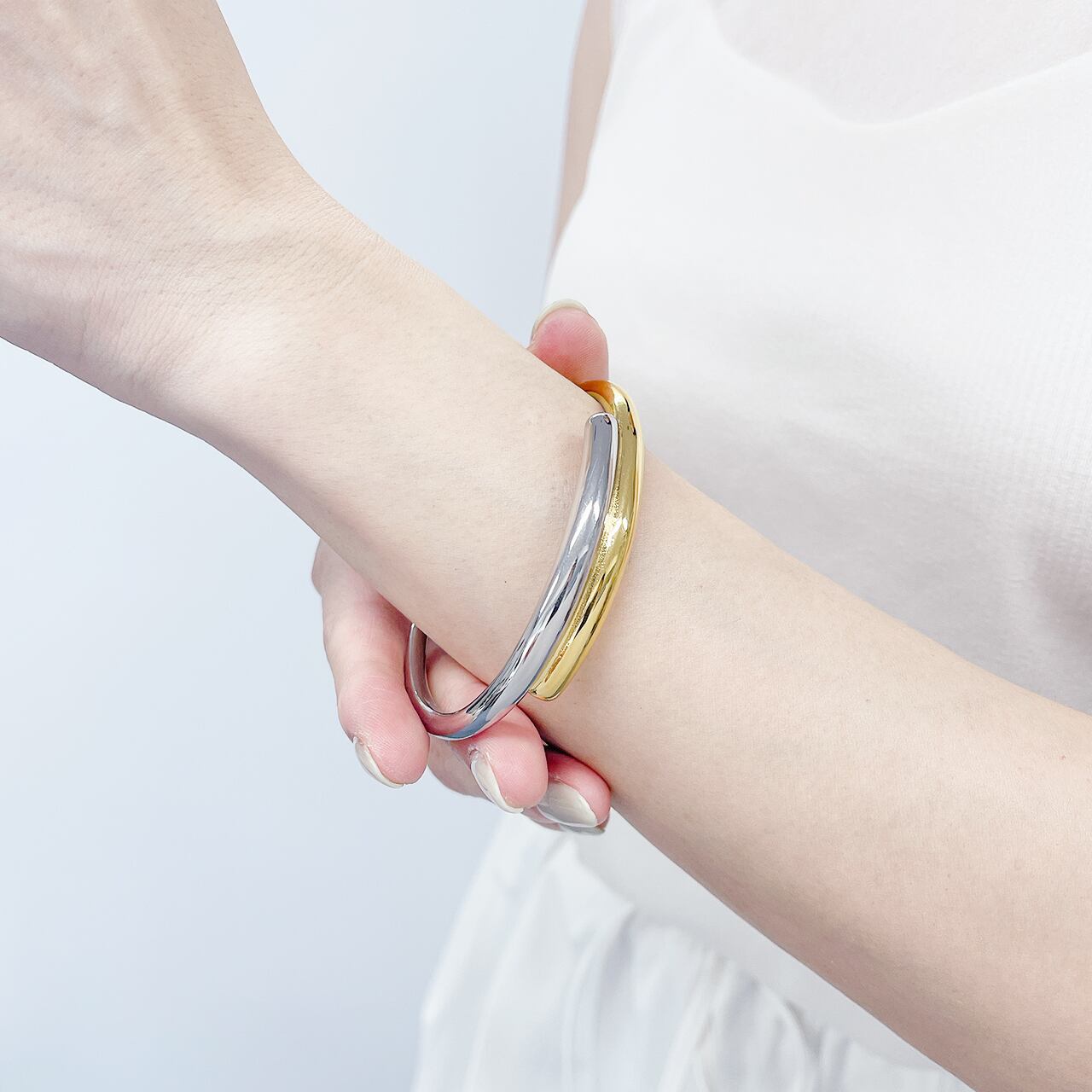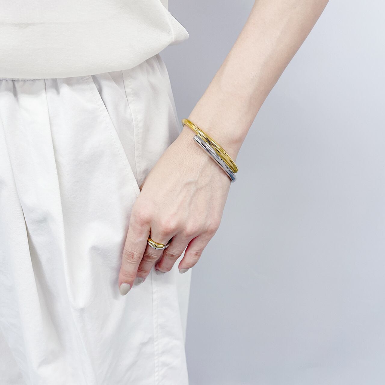 2本のラインが寄り添うように重なった、シンプルで上品なデザインのバングル。ゴールドとシルバーの輝きが手元に華やかさを添え、カジュアルにもフォーマルにも馴染みます。