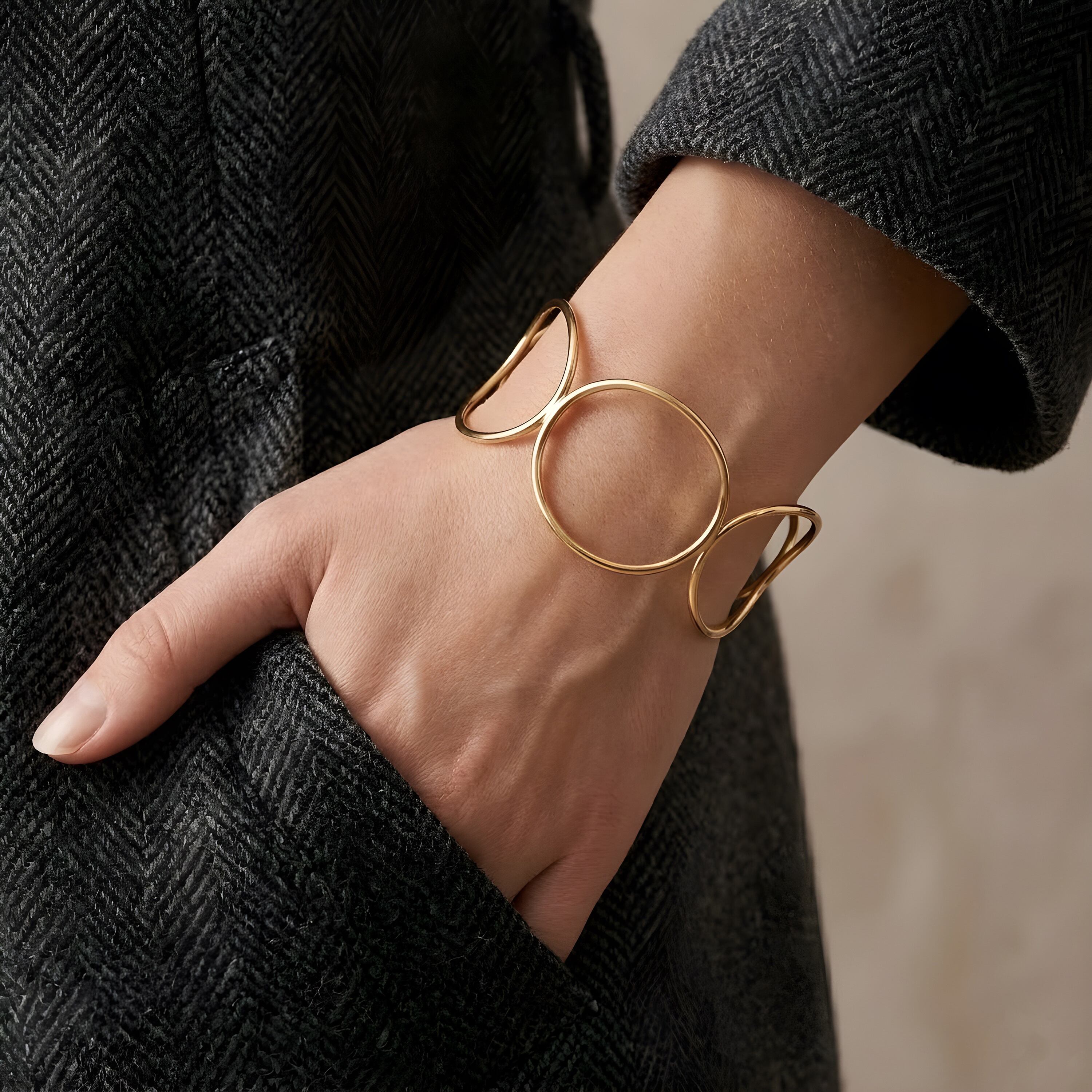 美しい曲線と立体感が際立つ、サークルモチーフのサージカルステンレス製バングル。華奢ながらもしっかりとしたラインで構成されたフレームが、まるでアート作品のような印象を与えます。シンプルな装いにも存在感をプラスし、コーディネートのアクセントにぴったりの一本。軽やかでつけ心地もよく、カジュアルにもモードにも合わせやすいデザインです。