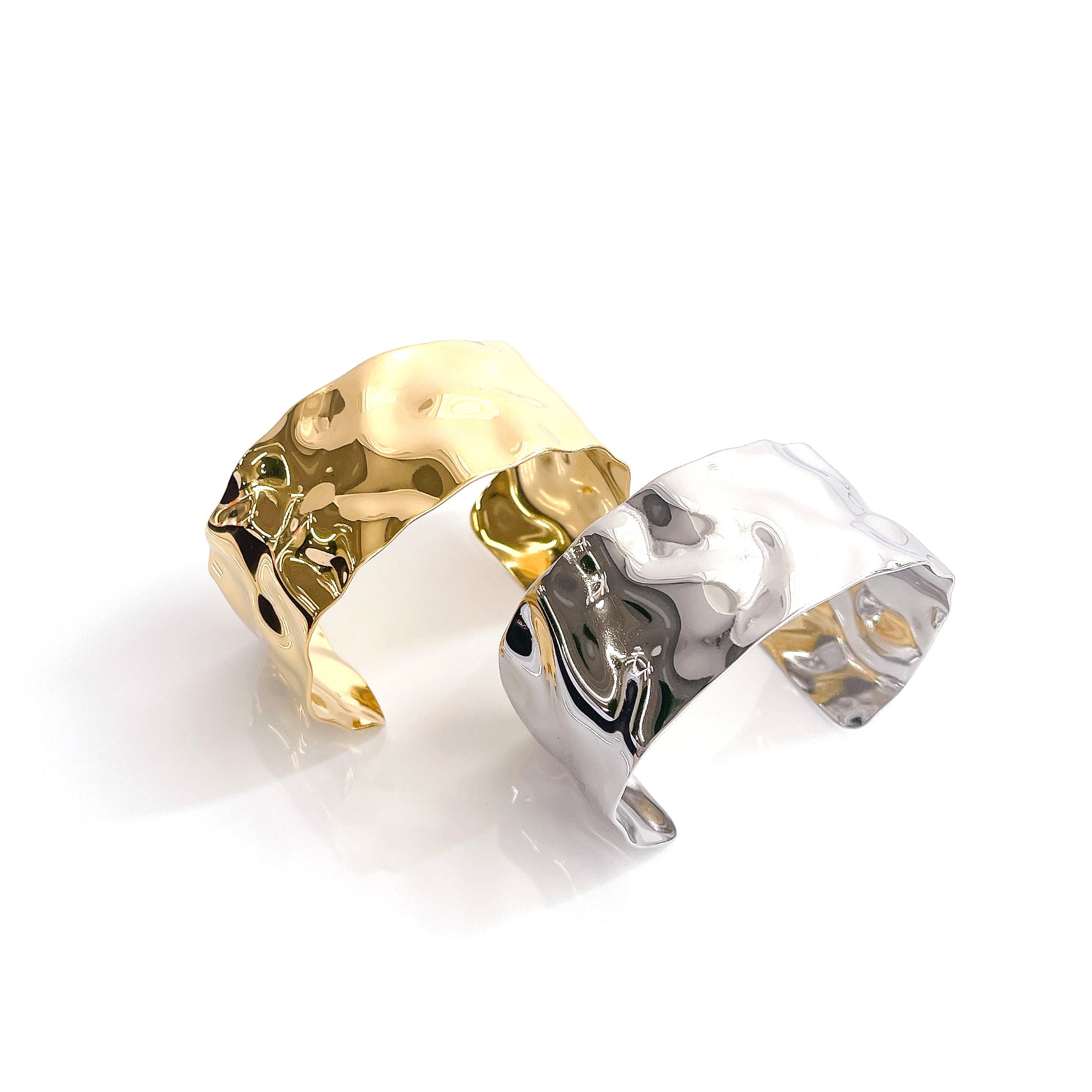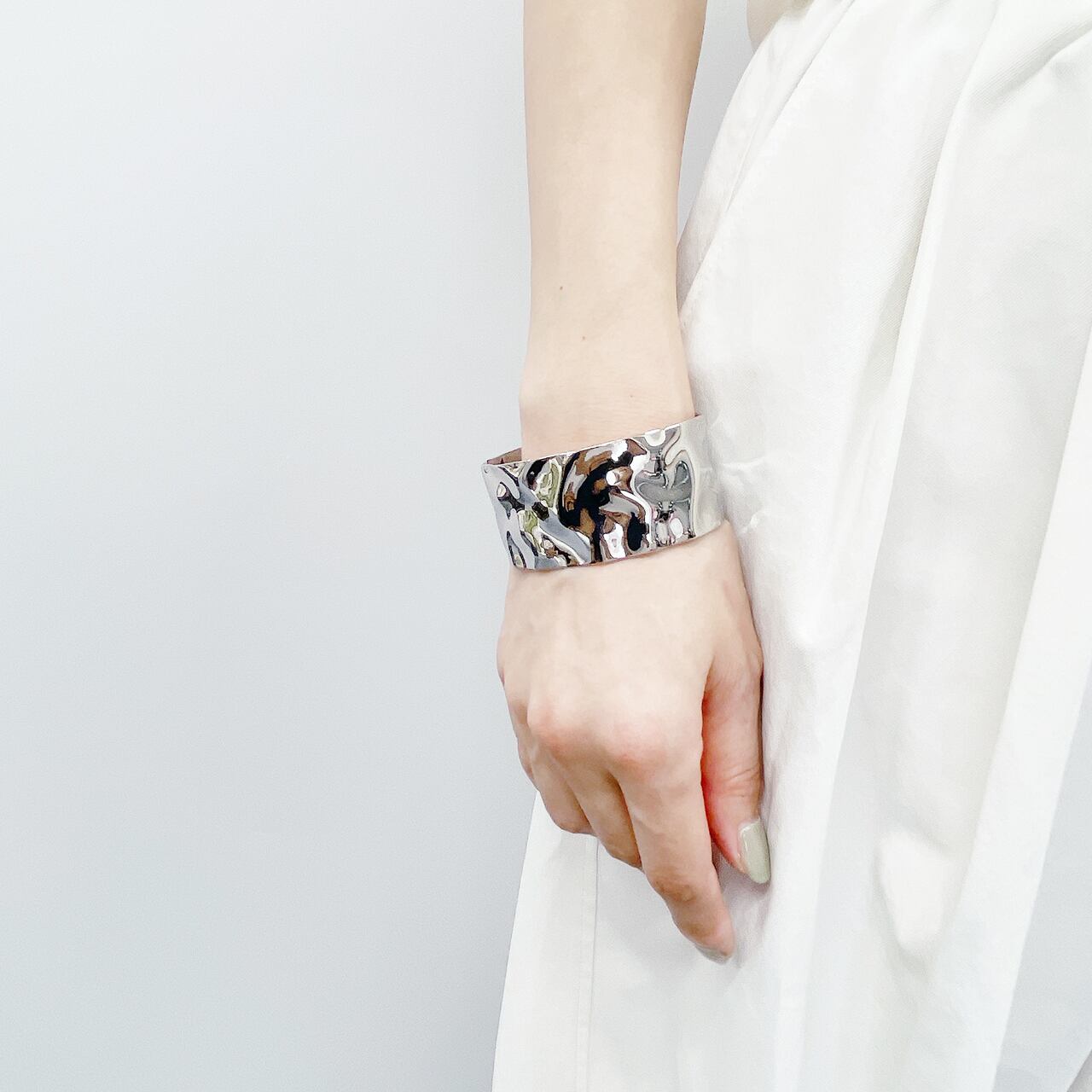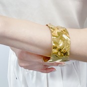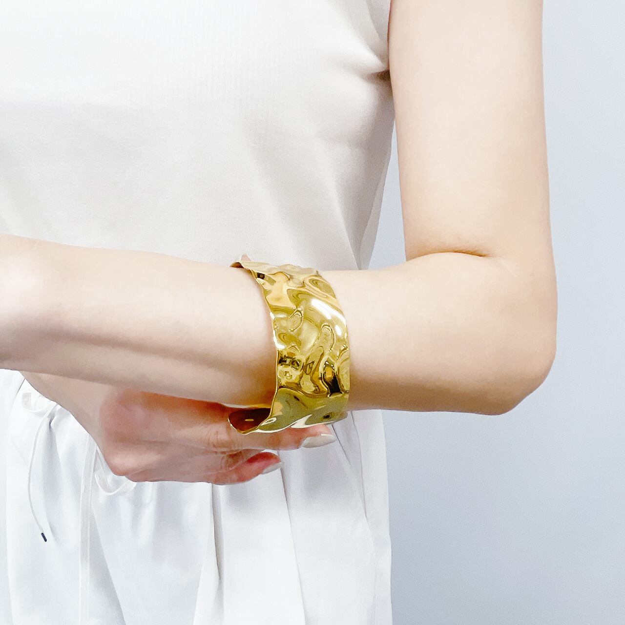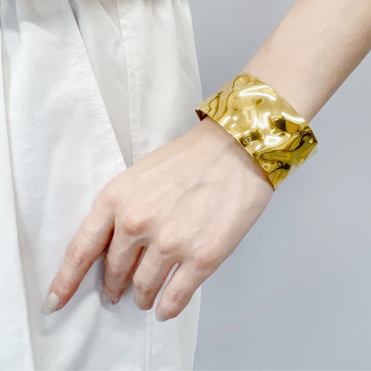 表面に波打つような凹凸を施した、光沢感あふれるワイドなカフバングルです。まるで水面のゆらぎを映したような有機的なフォルムが、手元にモダンでアートな印象を添えてくれます。スタイリングのアクセントになる存在感のあるデザインながら、どんな装いにも馴染みやすいカラー展開(ゴールド/シルバー)でご用意。一つ着けるだけでコーディネートをぐっと引き締めてくれるアイテムです。