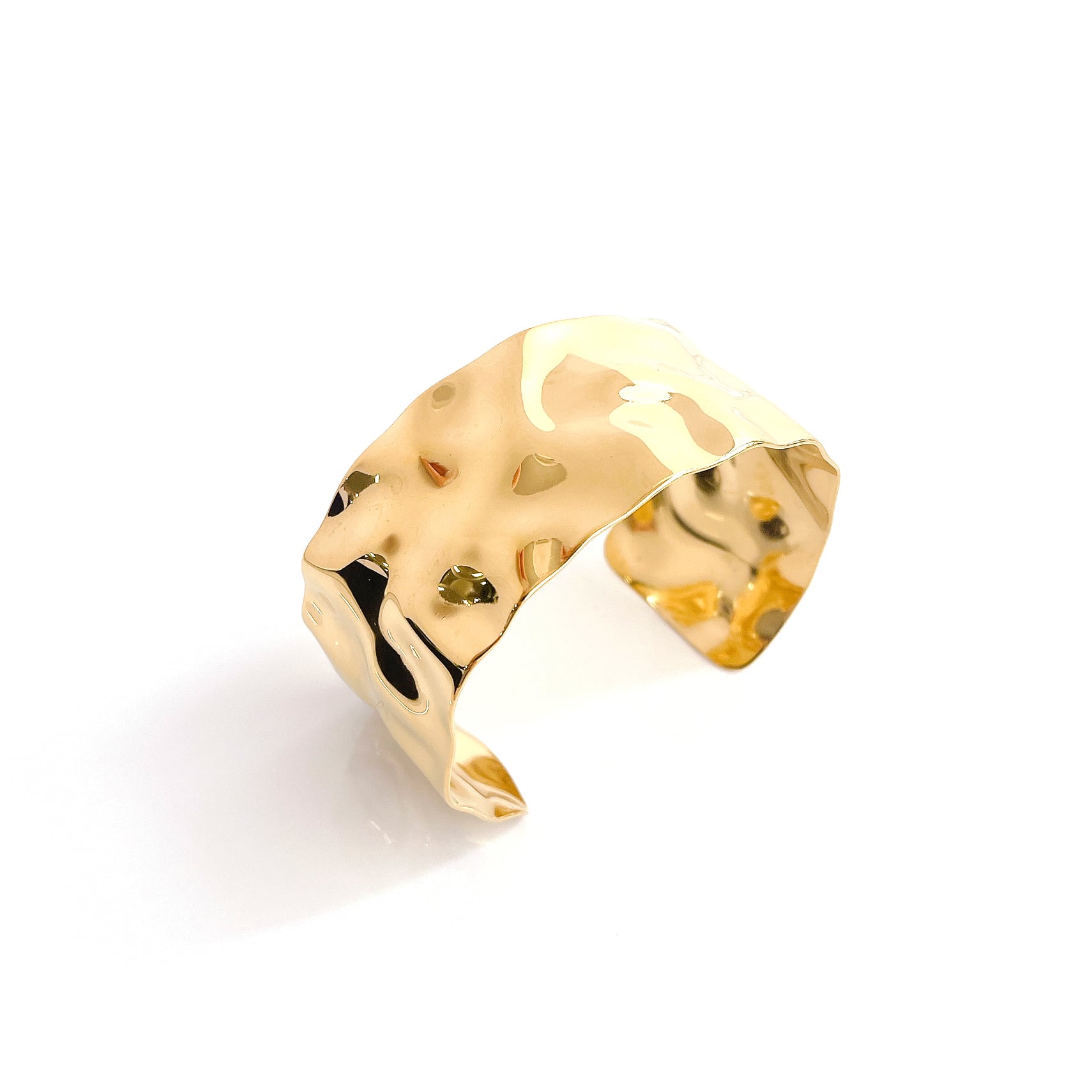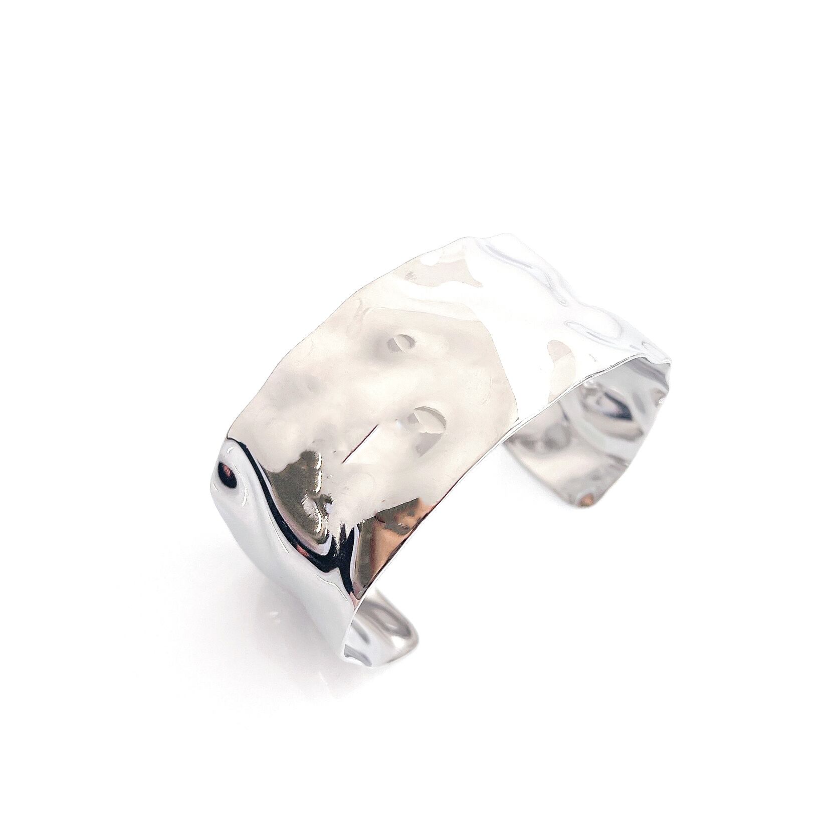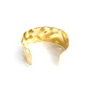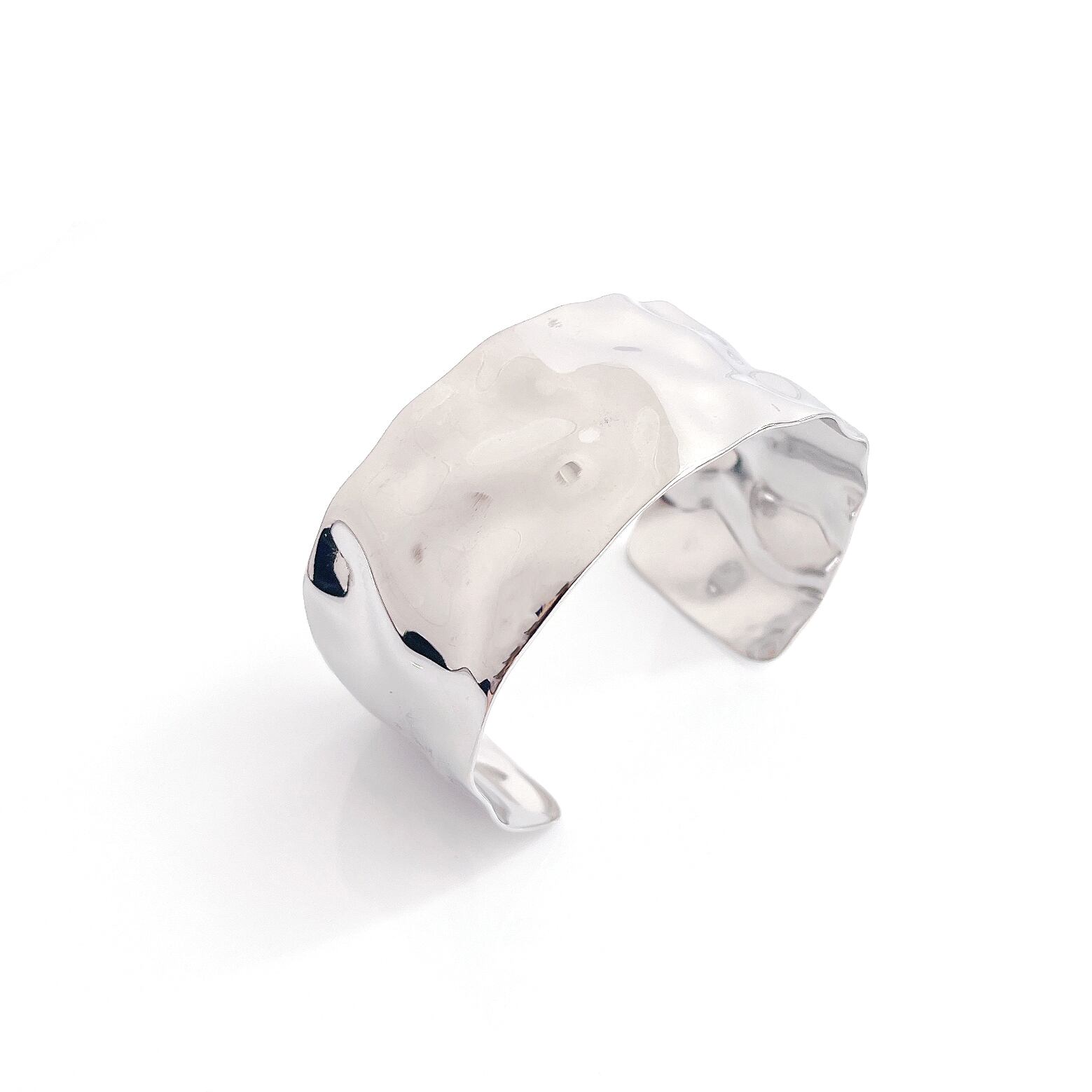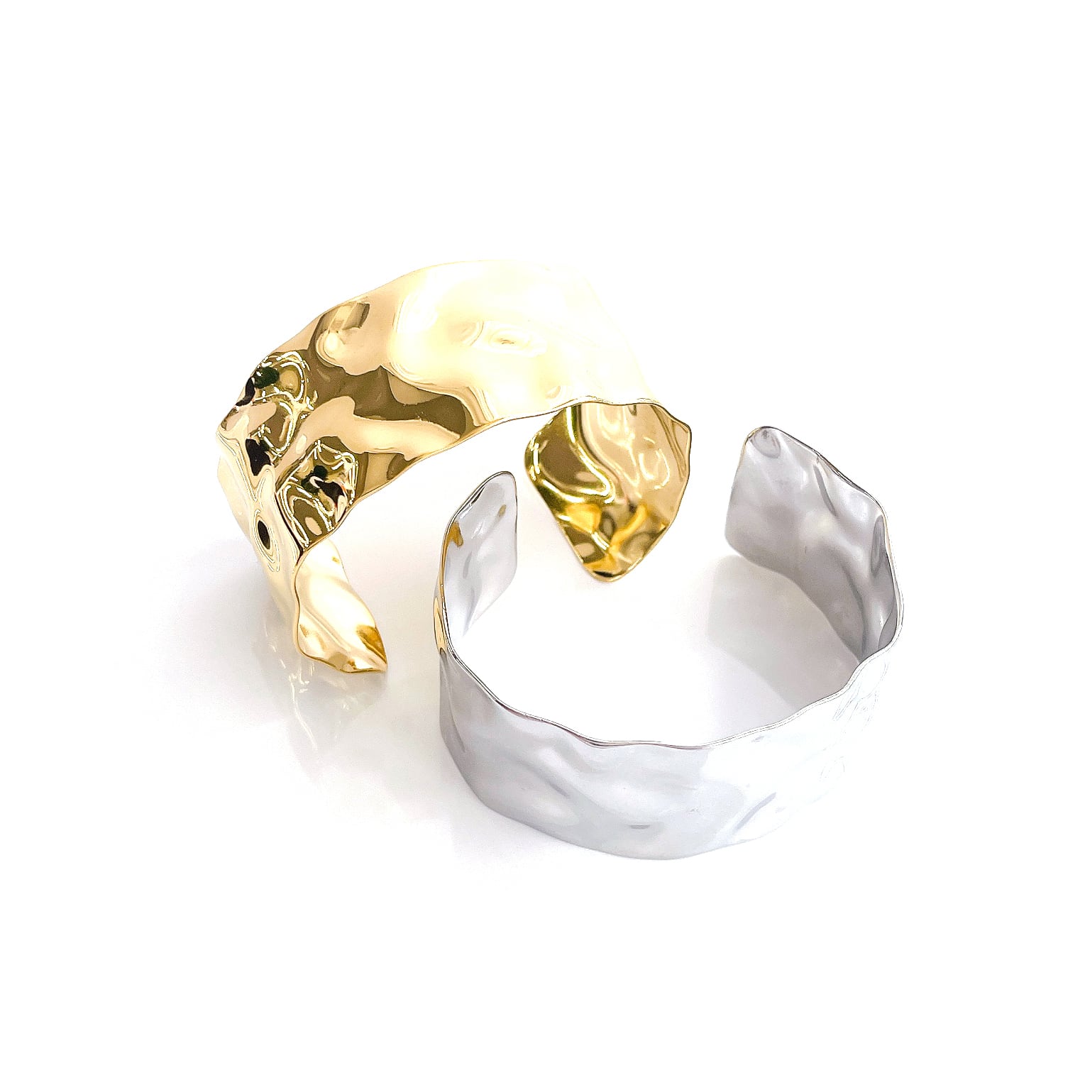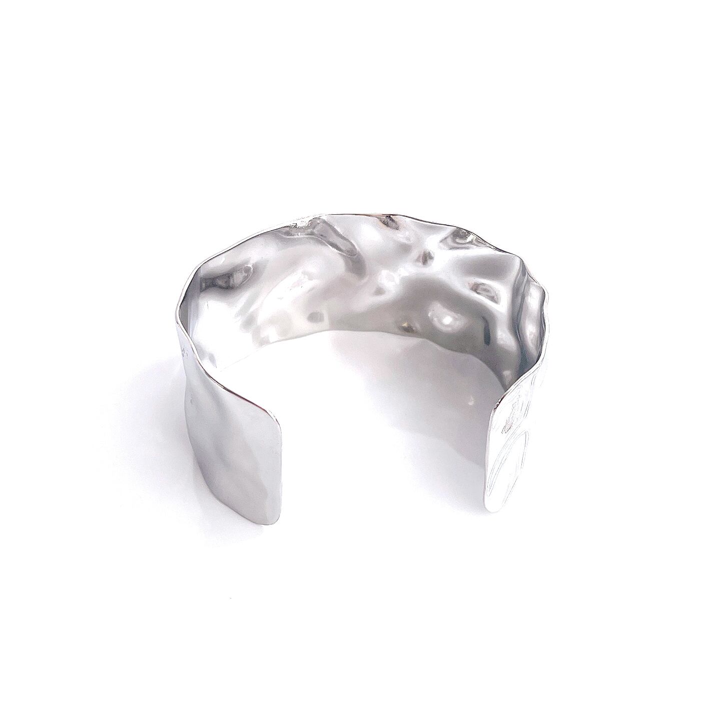 表面に波打つような凹凸を施した、光沢感あふれるワイドなカフバングルです。まるで水面のゆらぎを映したような有機的なフォルムが、手元にモダンでアートな印象を添えてくれます。スタイリングのアクセントになる存在感のあるデザインながら、どんな装いにも馴染みやすいカラー展開(ゴールド/シルバー)でご用意。一つ着けるだけでコーディネートをぐっと引き締めてくれるアイテムです。