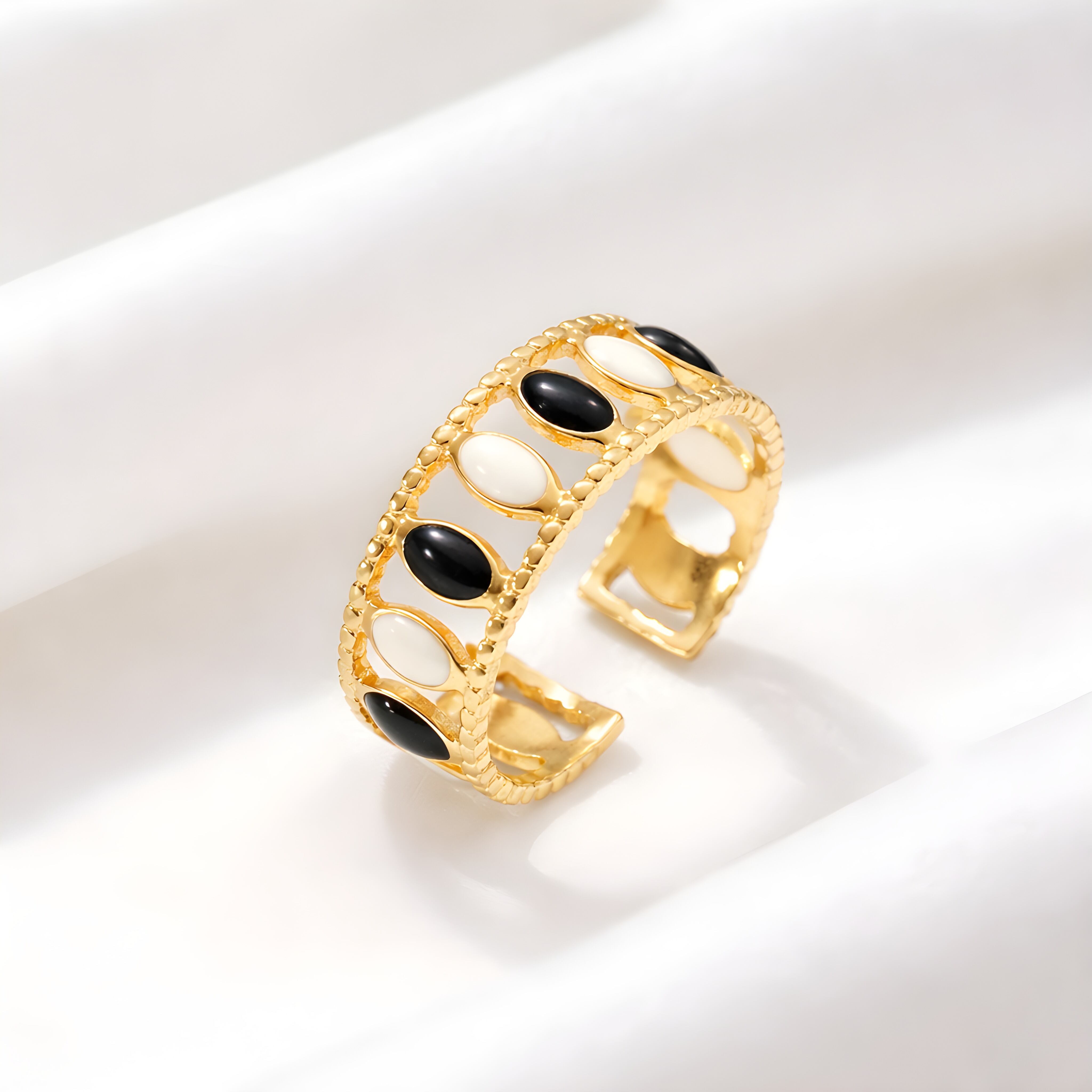 ブラックとホワイトのオーバルモチーフを交互に配した、洗練されたモノトーンデザインのリング。コントラストの効いた配色が指先にモードなアクセントを添え、シンプルな装いにも印象的な存在感をプラスします。程よいボリューム感がありながら、透かしのあるデザインにより軽やかな着け心地を実現。カジュアルからきれいめ、フォーマルなスタイルまで幅広く馴染み、ユニセックスでお楽しみいただけます。素材にはサージカルステンレス316Lを使用し、水や汗に強く変色しにくいため、デイリーにも安心して着用可能。オープンタイプで1〜2号程度のサイズ調整ができるのも魅力です。