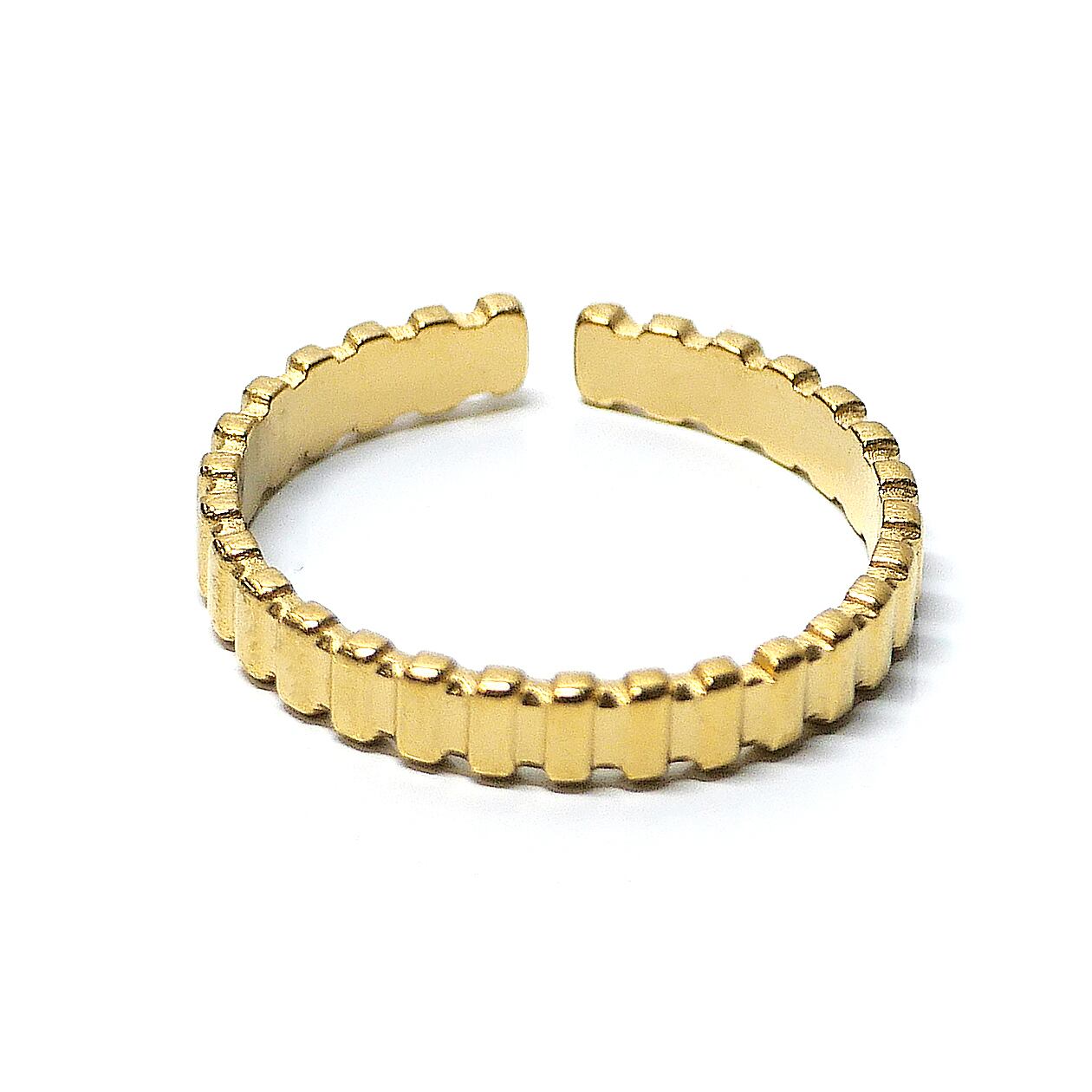 スクエア型のエッジを連ねた立体的なフォルムが印象的な、ミニマルデザインのオープンリング。直線的なラインが指元をシャープに引き締め、シンプルながらも洗練された存在感を放ちます。幅約3mmの程よいボリューム感で、単品使いはもちろん重ね付けにも相性の良いデザイン。ユニセックスで取り入れやすく、カジュアルからモード、きれいめスタイルまで幅広いコーディネートに馴染みます。オープンタイプのため指にフィットしやすく、日常使いしやすい軽やかな着け心地も魅力。ゴールドとシルバーの2色展開で、スタイルや気分に合わせてお選びいただけます。