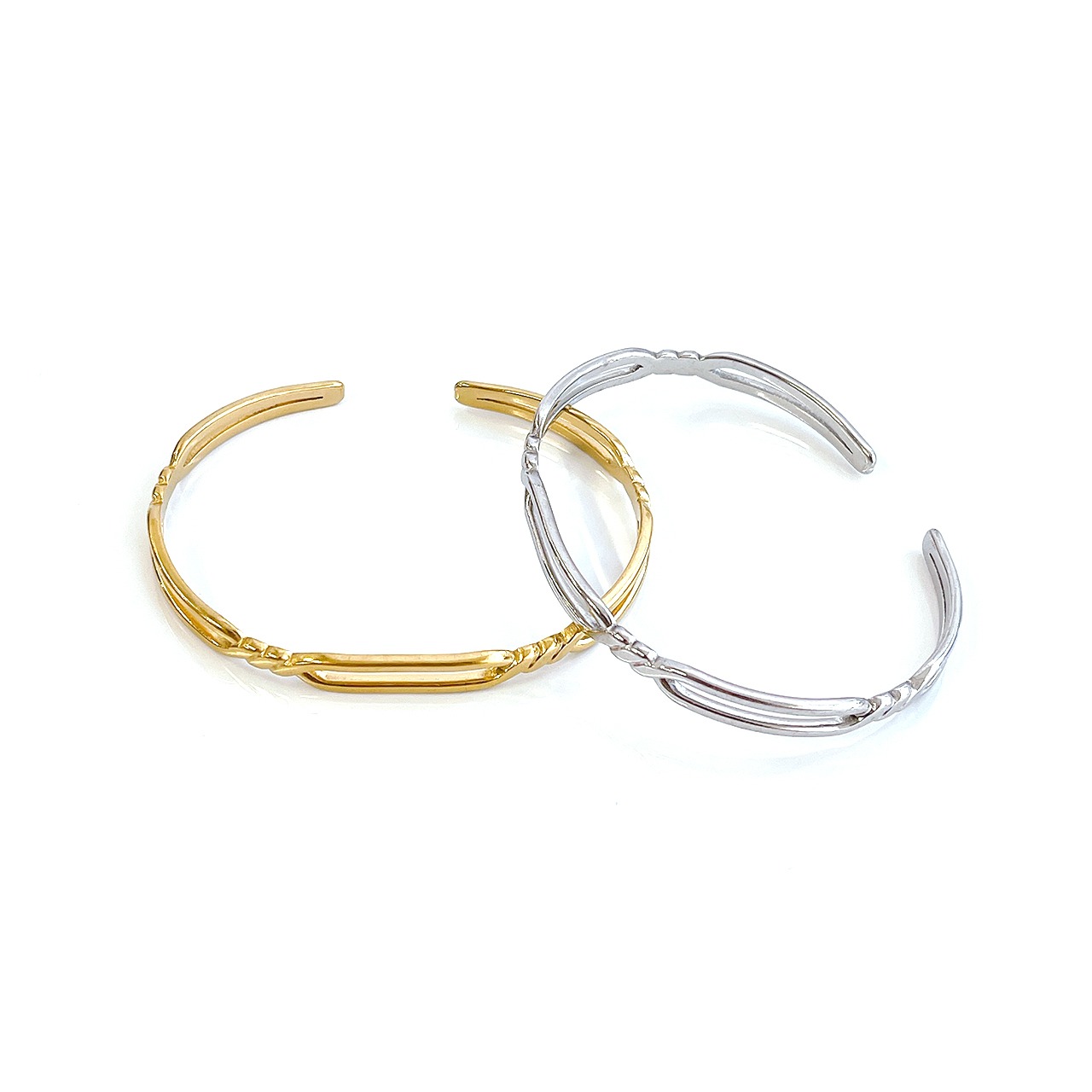 シンプルなラインにツイストを加えた、モダンで洗練されたデザインのバングル。華奢ながらも存在感のあるフォルムが、手元をすっきりと美しく見せてくれます。男女問わず身につけられるユニセックスデザインで、ギフトにも最適です。