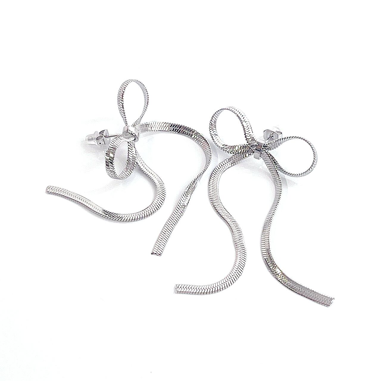 しなやかなリボンモチーフが耳元で揺れる、華やかで女性らしいデザインのロングピアス。