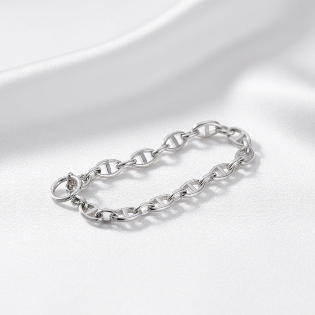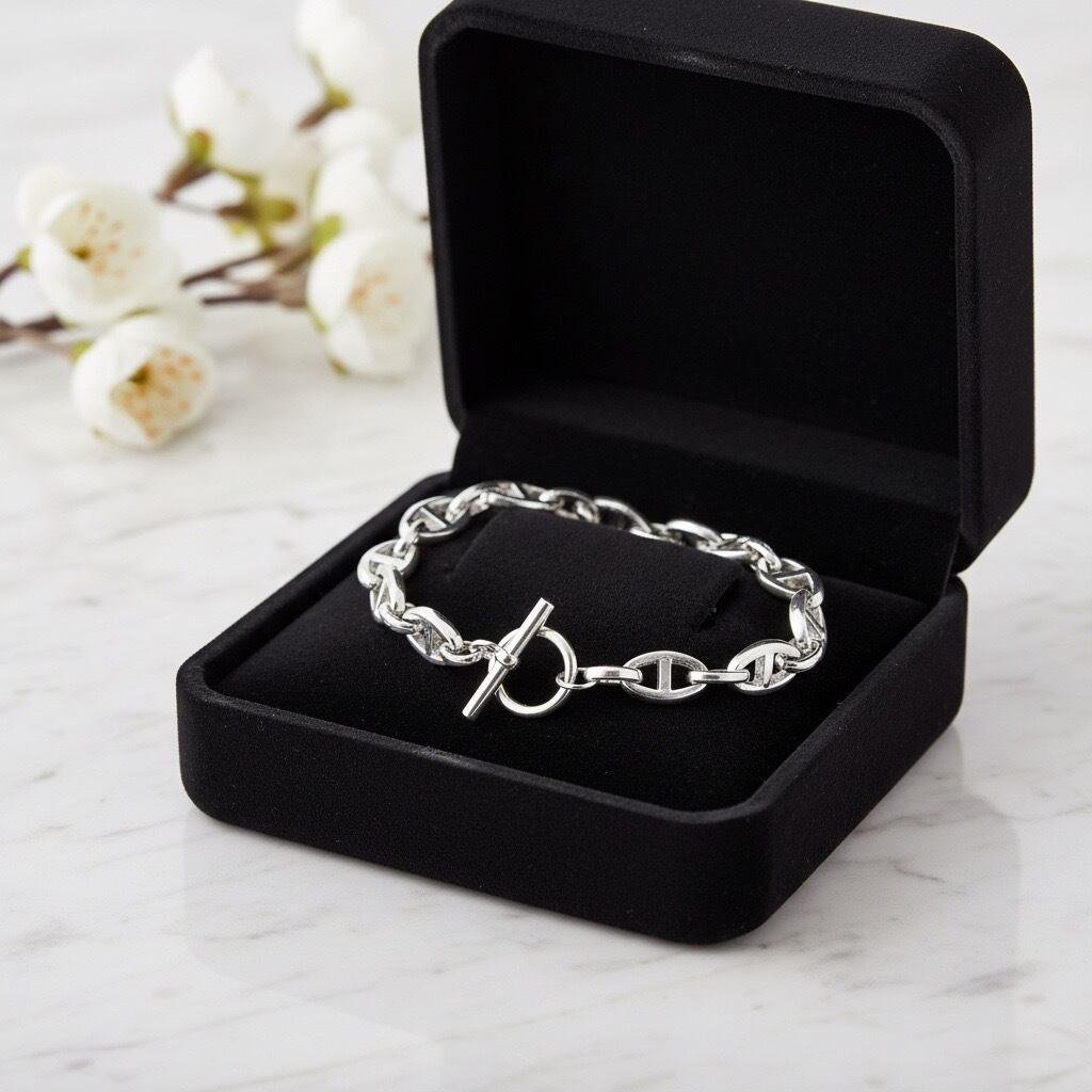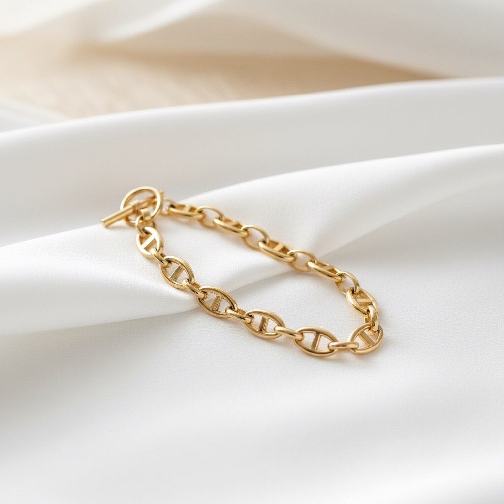 クラシックなトグル留め具が印象的な、サージカルステンレス316L製のチェーンブレスレット。シンプルなデザインながら、程よいボリューム感のチェーンが手元に上品な存在感を添え、デイリーコーデをさりげなく格上げしてくれます。留め具にはトグルタイプを採用し、着脱がしやすいのも嬉しいポイント。ゴールドは華やかで洗練された印象に、シルバーはクールでモードな雰囲気に仕上がります。水や汗に強く、変色しにくい素材を使用しているため、日常使いにも安心。カジュアルからきれいめ、ユニセックスなスタイルまで幅広く活躍し、ギフトにもおすすめのブレスレットです。