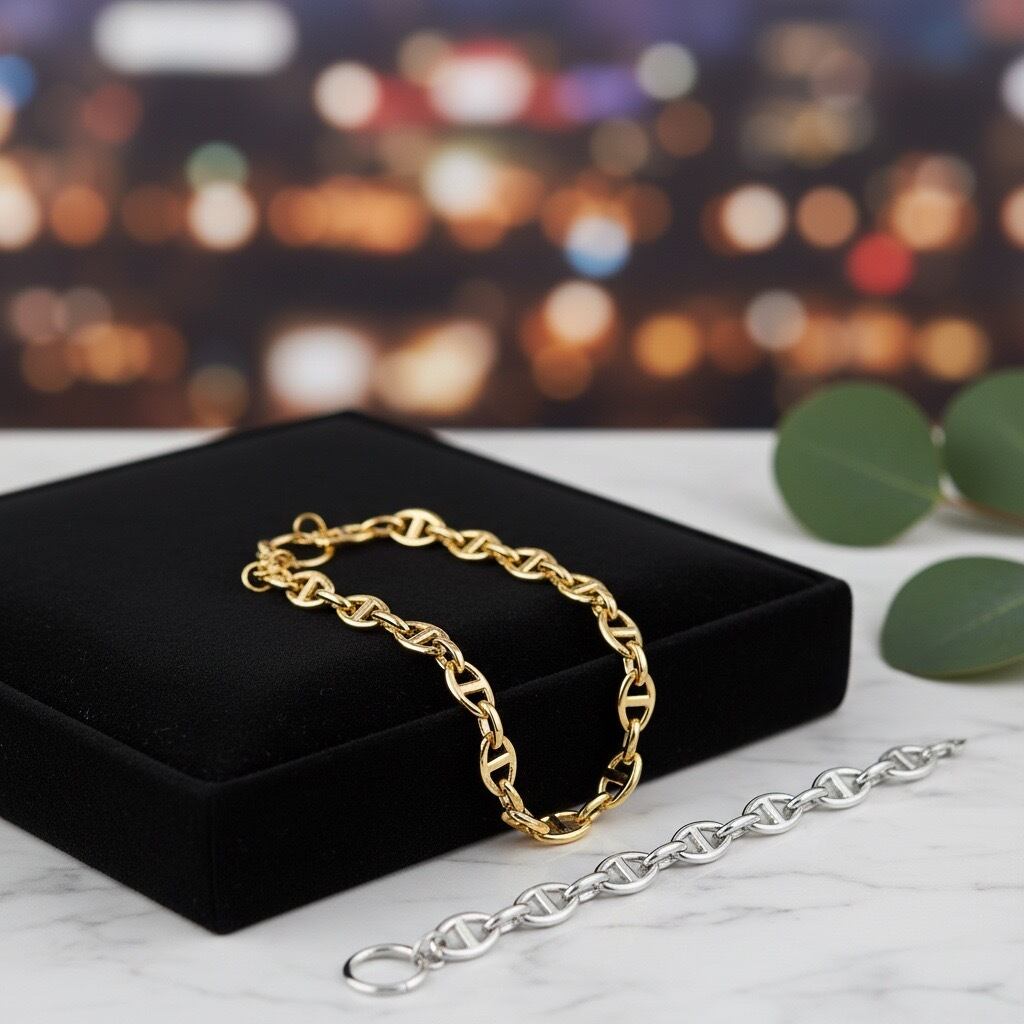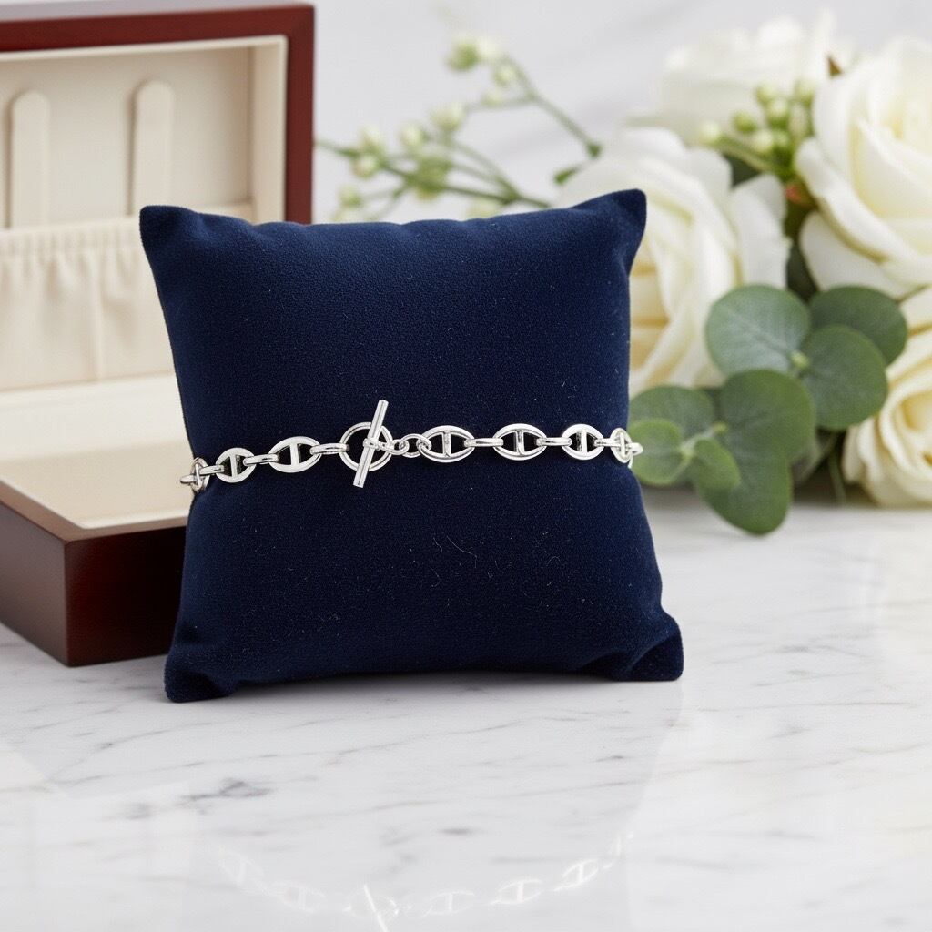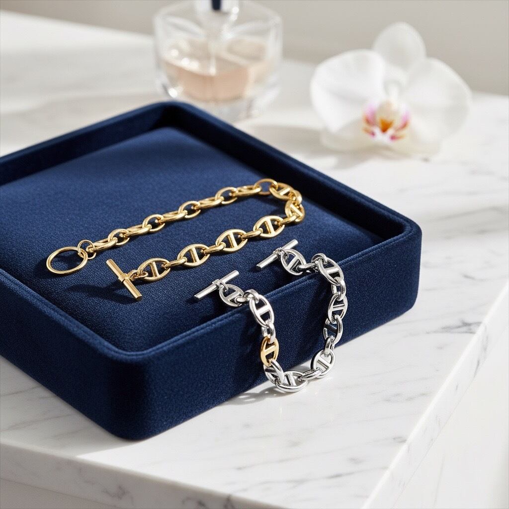 クラシックなトグル留め具が印象的な、サージカルステンレス316L製のチェーンブレスレット。シンプルなデザインながら、程よいボリューム感のチェーンが手元に上品な存在感を添え、デイリーコーデをさりげなく格上げしてくれます。留め具にはトグルタイプを採用し、着脱がしやすいのも嬉しいポイント。ゴールドは華やかで洗練された印象に、シルバーはクールでモードな雰囲気に仕上がります。水や汗に強く、変色しにくい素材を使用しているため、日常使いにも安心。カジュアルからきれいめ、ユニセックスなスタイルまで幅広く活躍し、ギフトにもおすすめのブレスレットです。