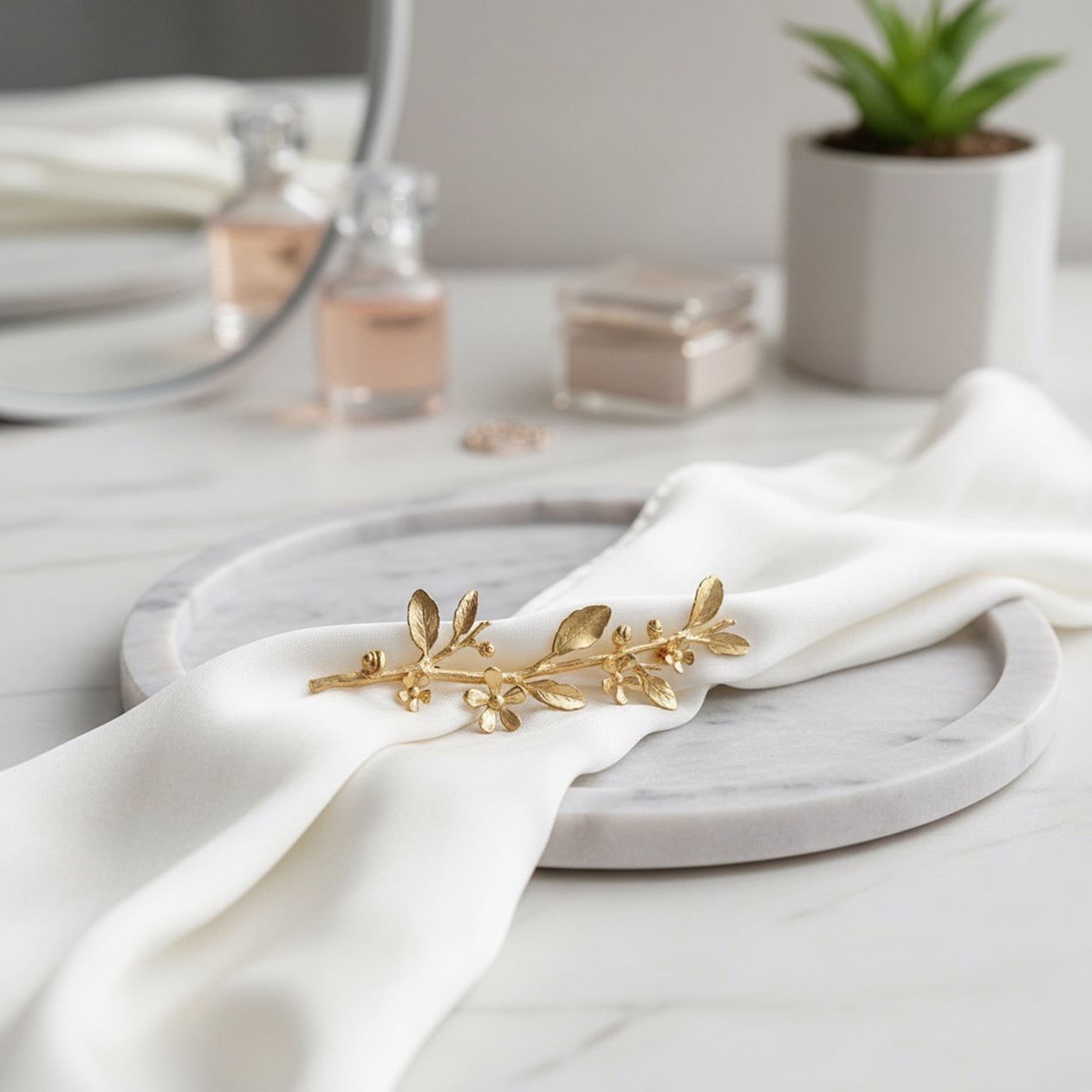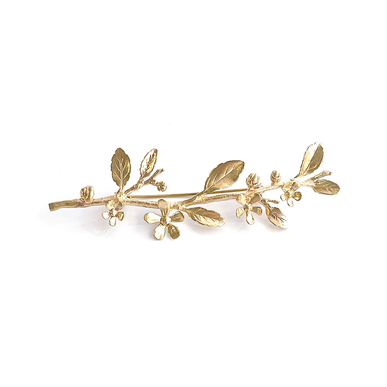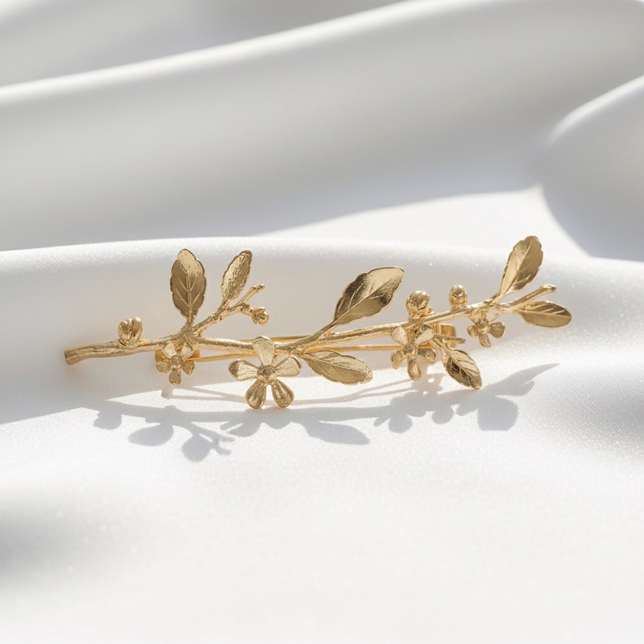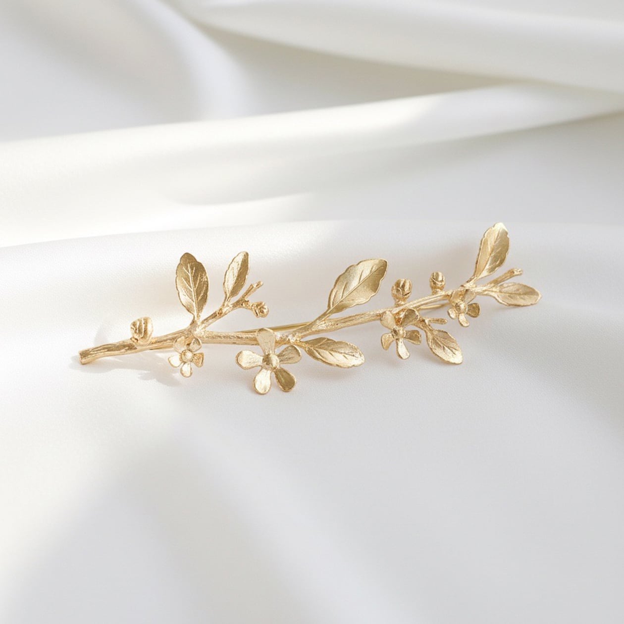 繊細な枝に小花と葉をあしらった、真鍮製のブローチです。アンティーク調のゴールドカラーが上品で、日常の装いから特別なシーンまで幅広く活躍します。植物モチーフならではの自然な立体感と華やかさが魅力で、ジャケットやワンピース、ストールなどに合わせるだけで、コーディネートを格上げしてくれるアクセサリーです。専用ボックス入りで、贈り物にも最適です。