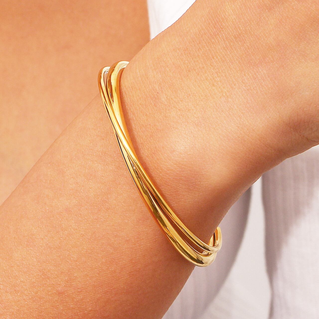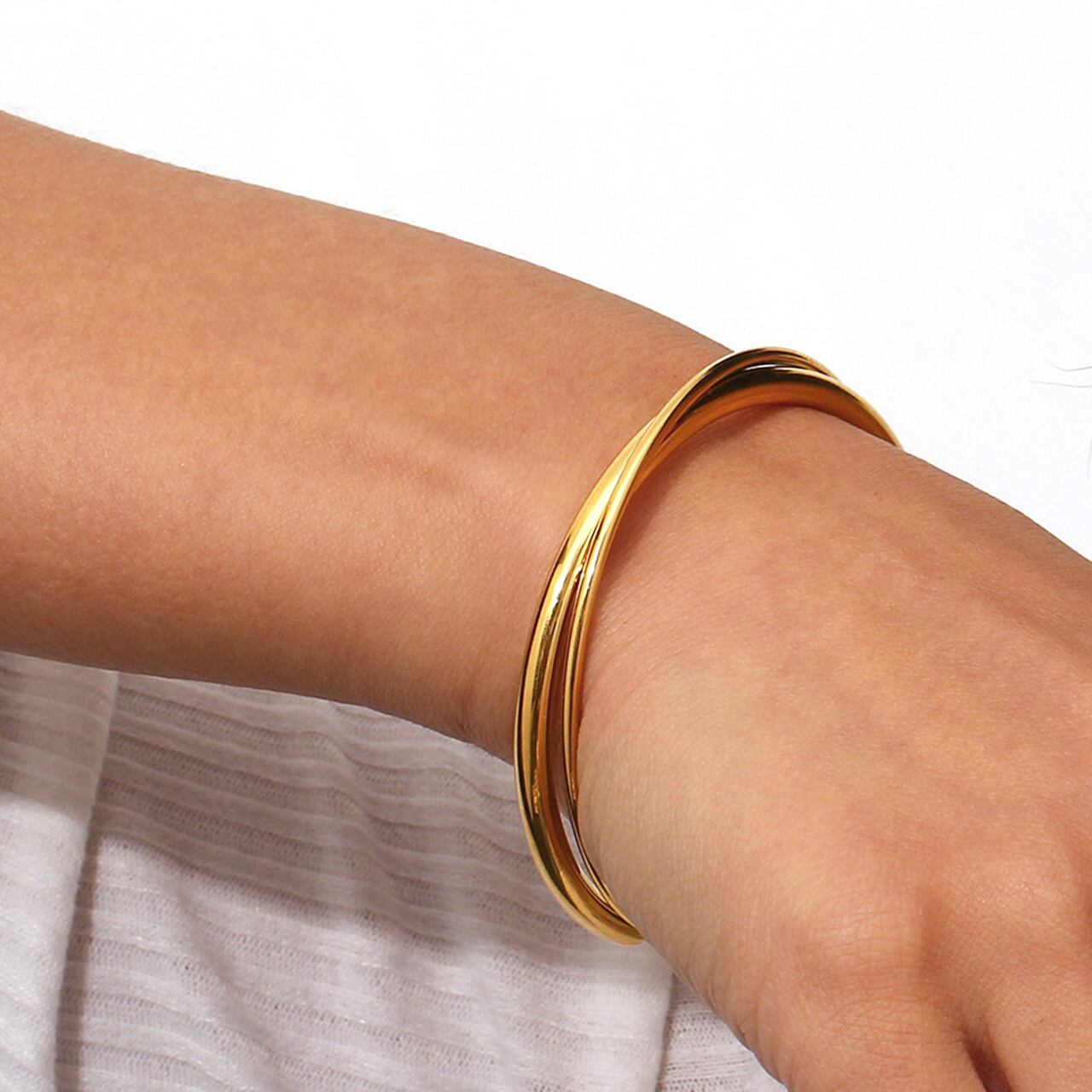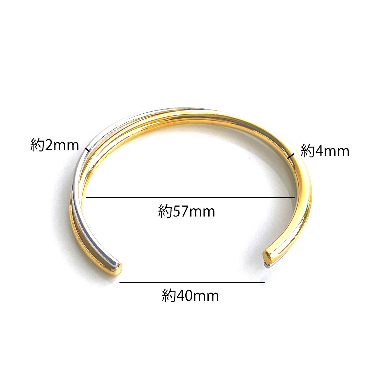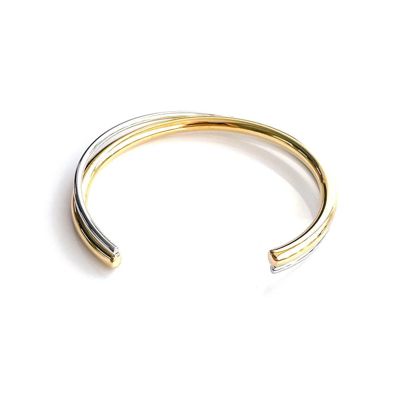ゴールドとシルバーが美しく交差するクロスデザインのバングル。異なるカラーのコントラストが手元を引き立て、洗練された印象を与えてくれます。サージカルステンレス316Lを採用し、水や汗にも強く、お手入れも簡単。カジュアルからフォーマルまで幅広いスタイルにマッチするバングルです。
