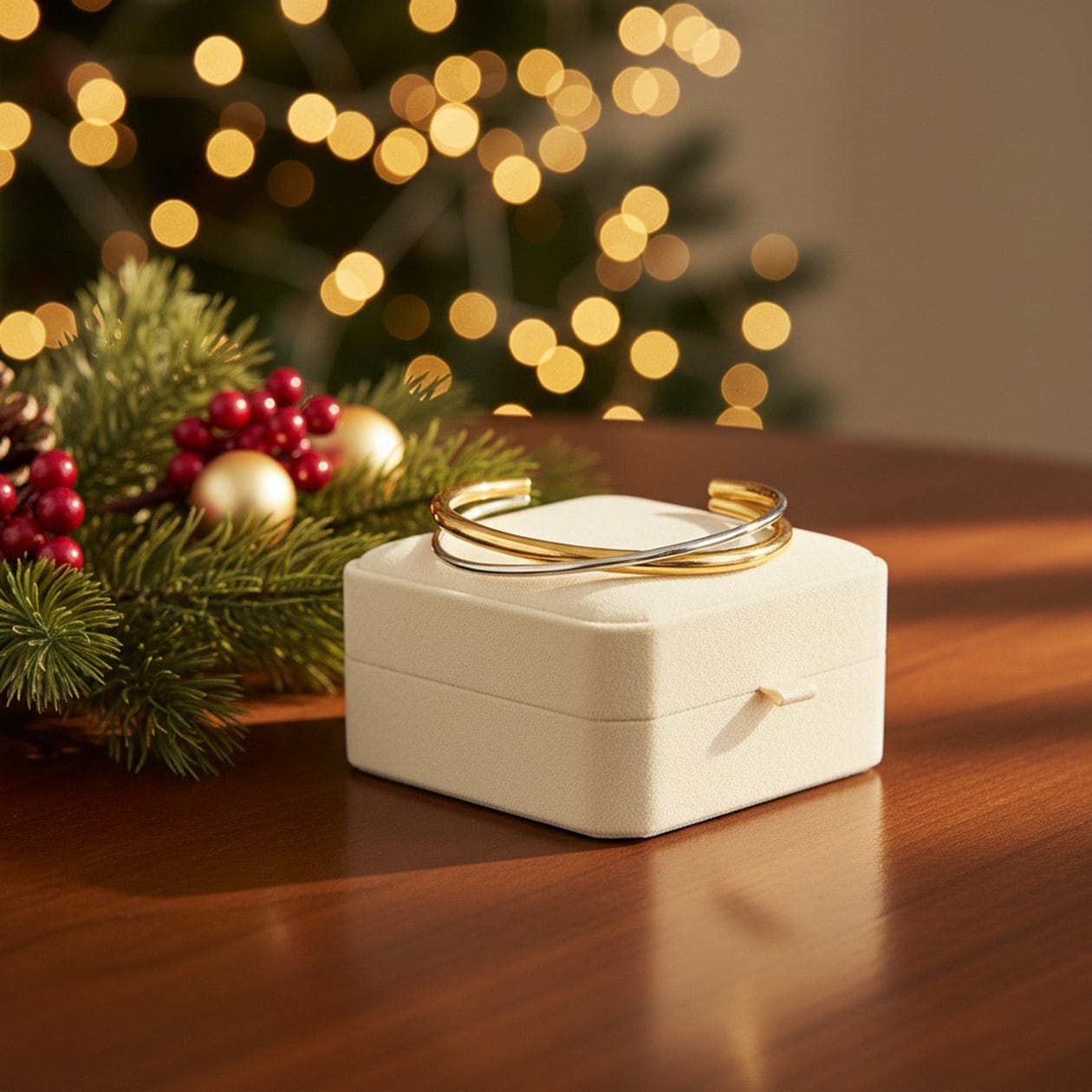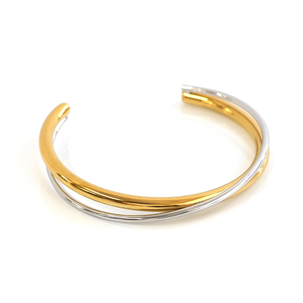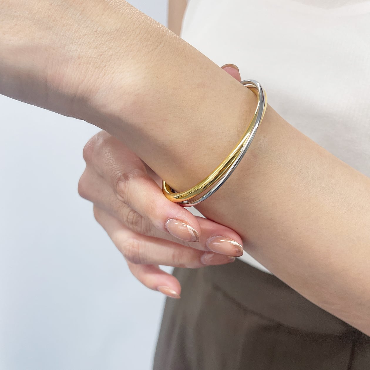 ゴールドとシルバー、ふたつの輝きが美しく交差するクロスデザインのバングル。異なるカラーのコントラストが手元を印象的に引き立て、洗練されたモダンな雰囲気を演出します。