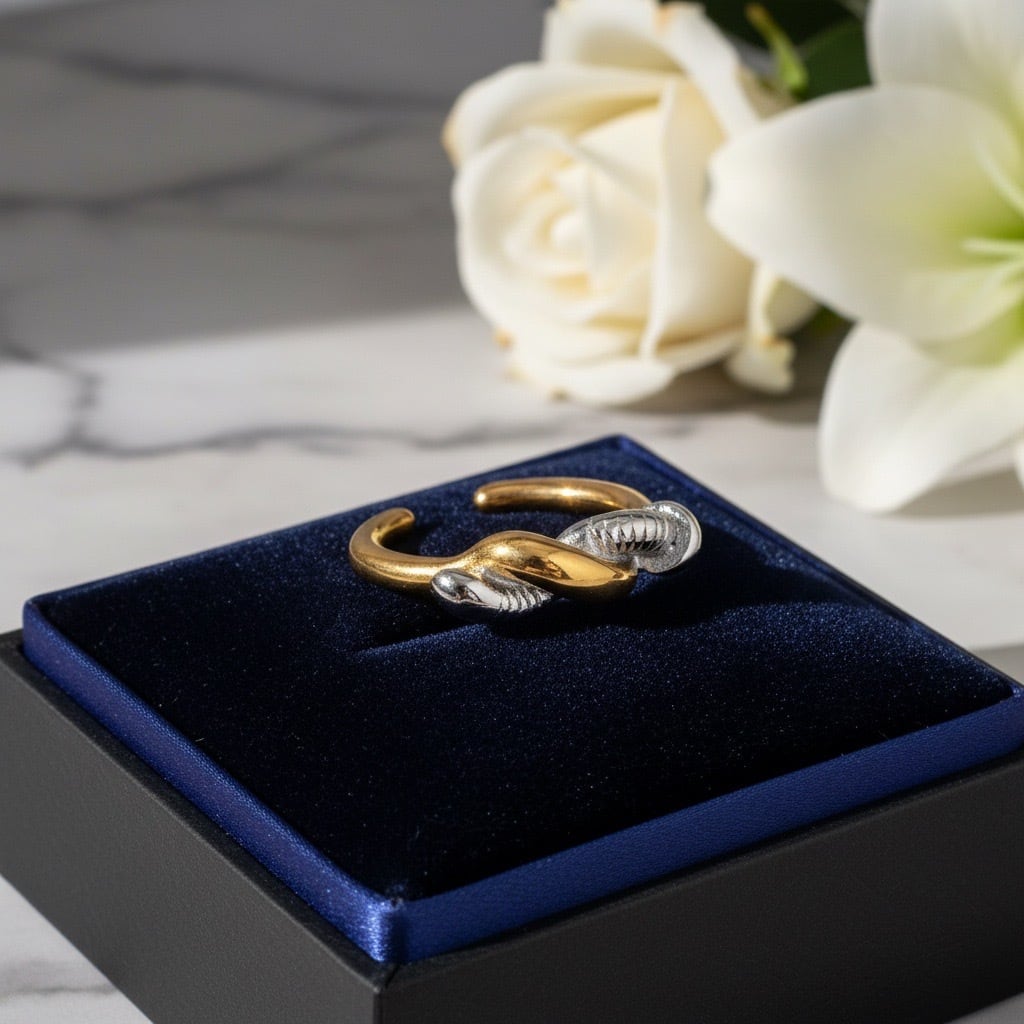 ゴールドとシルバー、異なるふたつの色彩が美しく重なり合い、指元にモダンで洗練された表情を与えます。程よいボリューム感がありながら主張しすぎず、シンプルな装いにも自然に溶け込むデザイン。ひとつ身に着けるだけでスタイリングに奥行きと品のあるアクセントを添えてくれます。結び目のモチーフには「つながり」や「調和」の意味が込められており、デイリー使いはもちろん、大切な想いを込めたギフトにもおすすめ。サージカルステンレス316Lを使用し、水や汗に強く、日常使いしやすいのも魅力です。