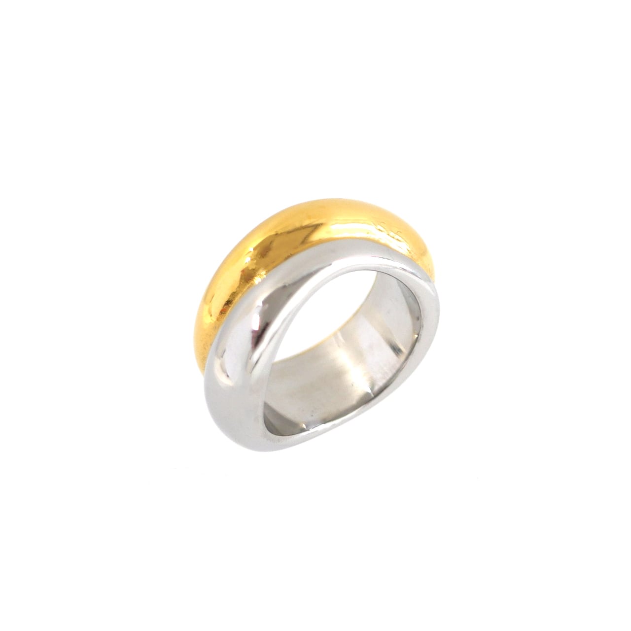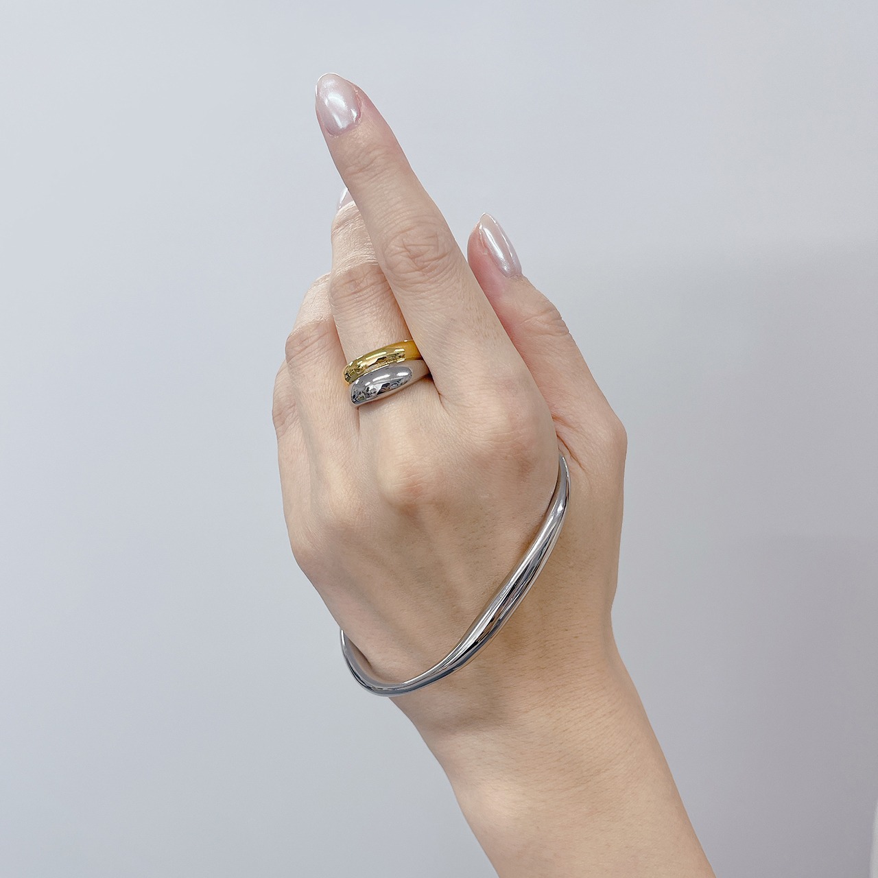 立体的なフォルムが美しい、サージカルステンレス製のドームリングです。ゴールドとシルバーのバイカラーが洗練された印象を与え、指先にモダンなアクセントをプラスしてくれます。