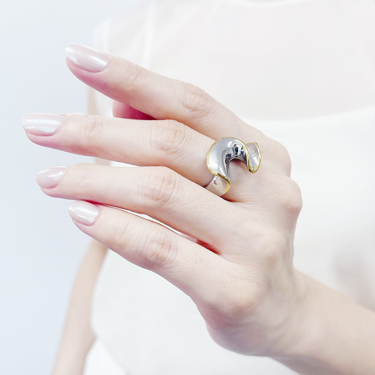 シルバーとゴールドのコントラストが手元に奥行きのある表情を与え、立体感のある存在感を演出します。有機的なウェーブラインは角度によって異なる表情を見せ、シンプルな装いにも自然なアクセントをプラス。ボリューム感がありながらも重たく見えにくく、指元をすっきりと引き締めてくれます。モードにもカジュアルにも取り入れやすく、デイリーから特別なお出かけまで幅広く活躍。ひとつ身に着けるだけで洗練された印象を与える、存在感のあるリングです。