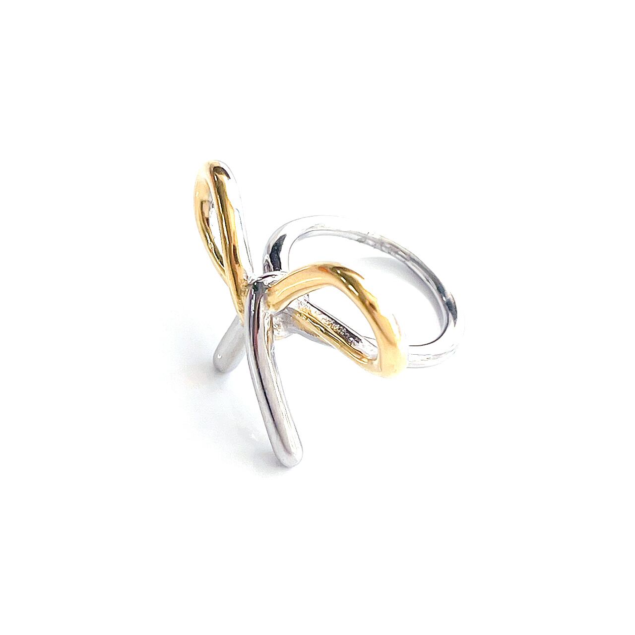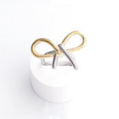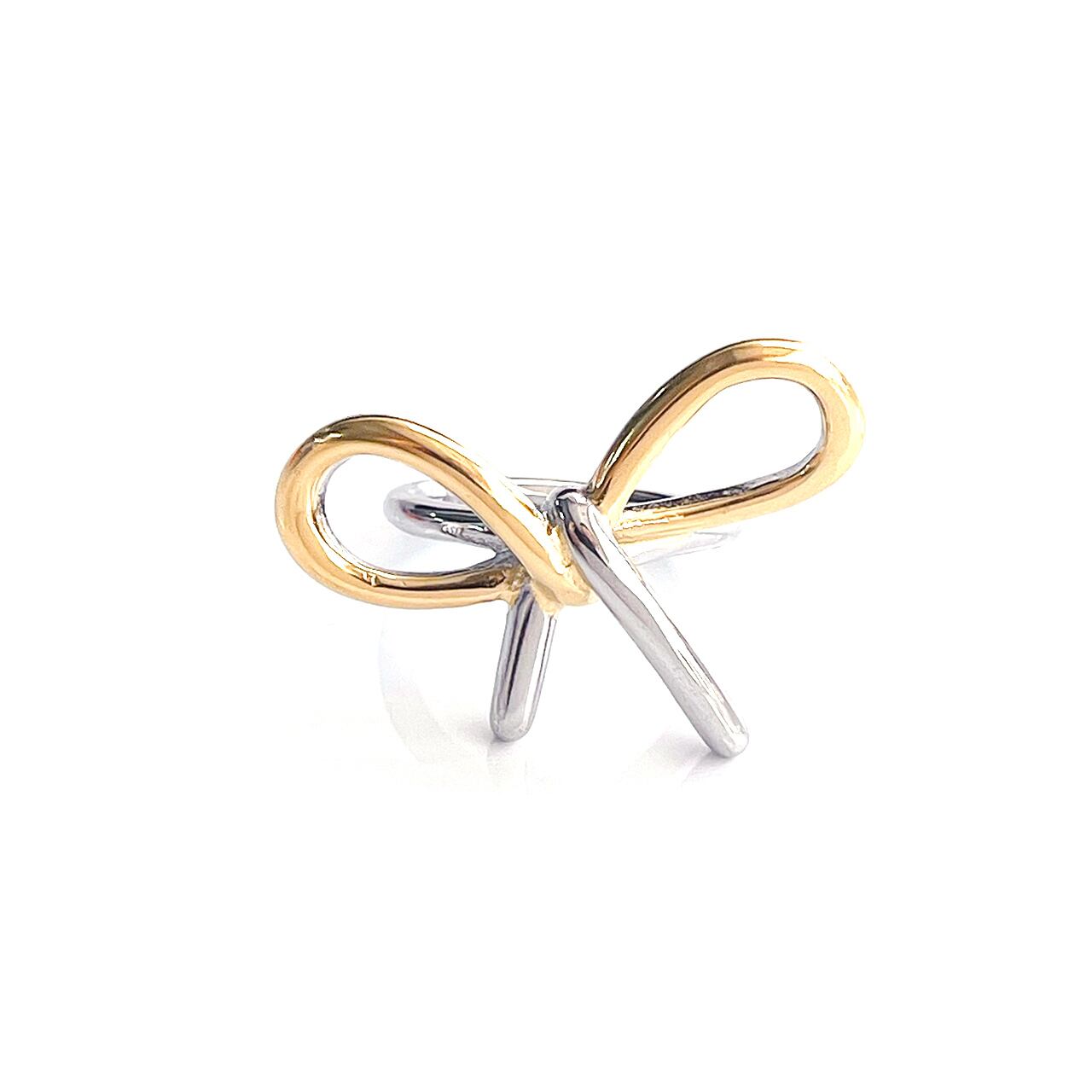 ゴールドとシルバーのコントラストが美しい、リボンモチーフのサージカルステンレス製リング。立体的に描かれたリボンのフォルムが、手元に華やかさと可愛らしさを添えてくれます。シンプルな装いのアクセントとしてはもちろん、フェミニンなコーディネートにもぴったり。バイカラーデザインが甘すぎず、上品で大人らしい印象を演出します。デイリー使いから特別な日のコーディネートまで幅広く活躍するアイテムです。贈り物にも最適です。