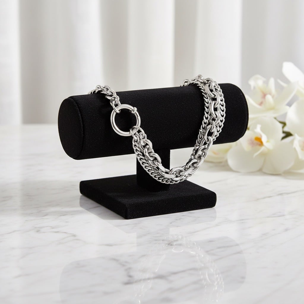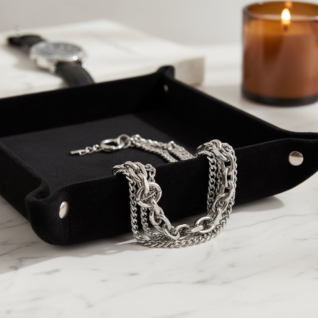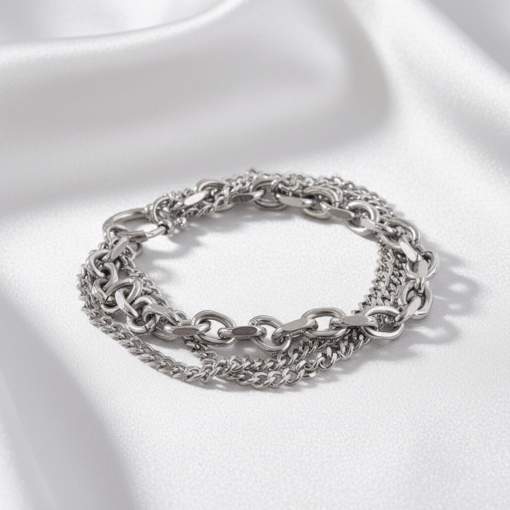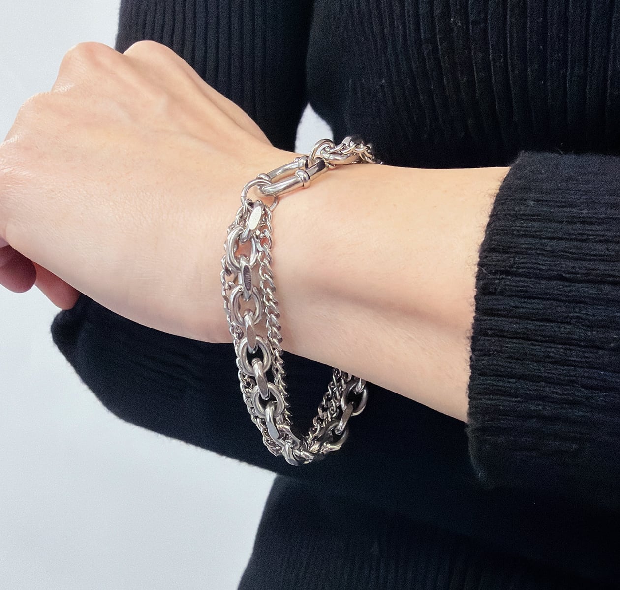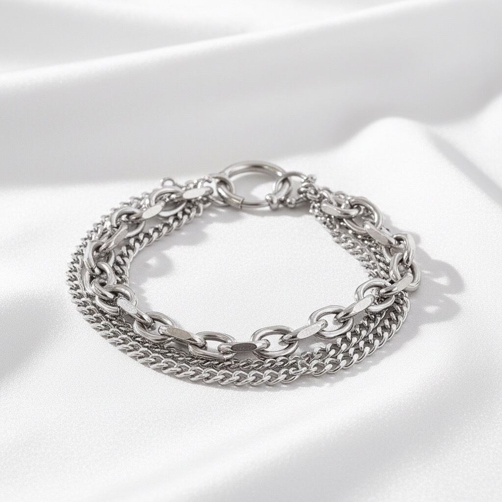 異なるデザインと太さの3種類のチェーンを組み合わせた、立体感のある三連チェーンブレスレット。重なり合うチェーンが手元に奥行きと動きを生み出し、シンプルながらも存在感のある仕上がりです。留め具には大きめのマンテル風リングを採用し、デザインのアクセントとして映えるだけでなく、着脱もスムーズ。単体使いで主役としてはもちろん、お手持ちのバングルやブレスレットとの重ね付けにも相性が良く、スタイリングの幅が広がります。素材にはサージカルステンレス316Lを使用し、水や汗に強く、デイリーに使いやすいのも魅力。ユニセックスで楽しめる、モダンなチェーンブレスレットです。