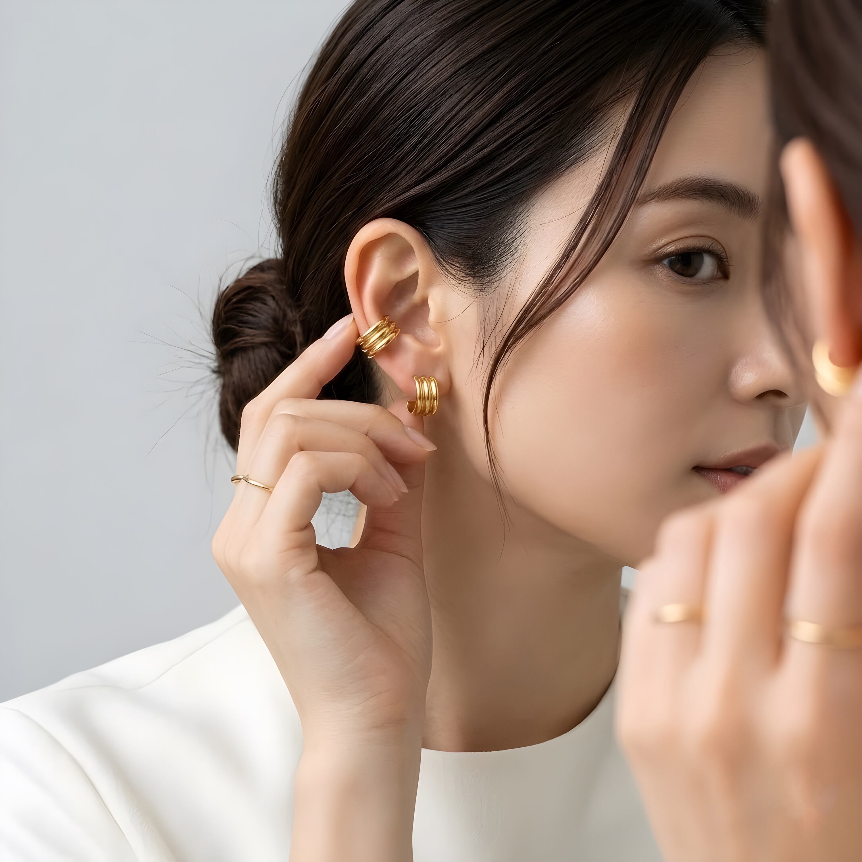 #サージカルステンレス316L #イヤーカフ #トリプルライン #片耳用 #ゴールドアクセサリー #モードアクセサリー #重ね付け #ミニマルアクセサリー #大人アクセサリー #デイリーアクセサリー #金属アレルギー配慮 #AtelierBEcudes #ギフトにおすすめ