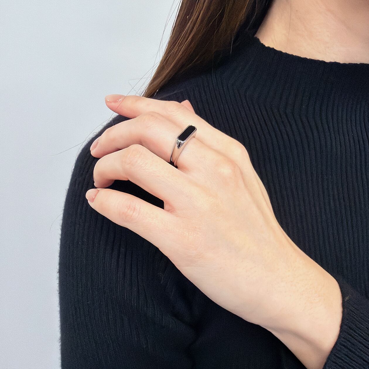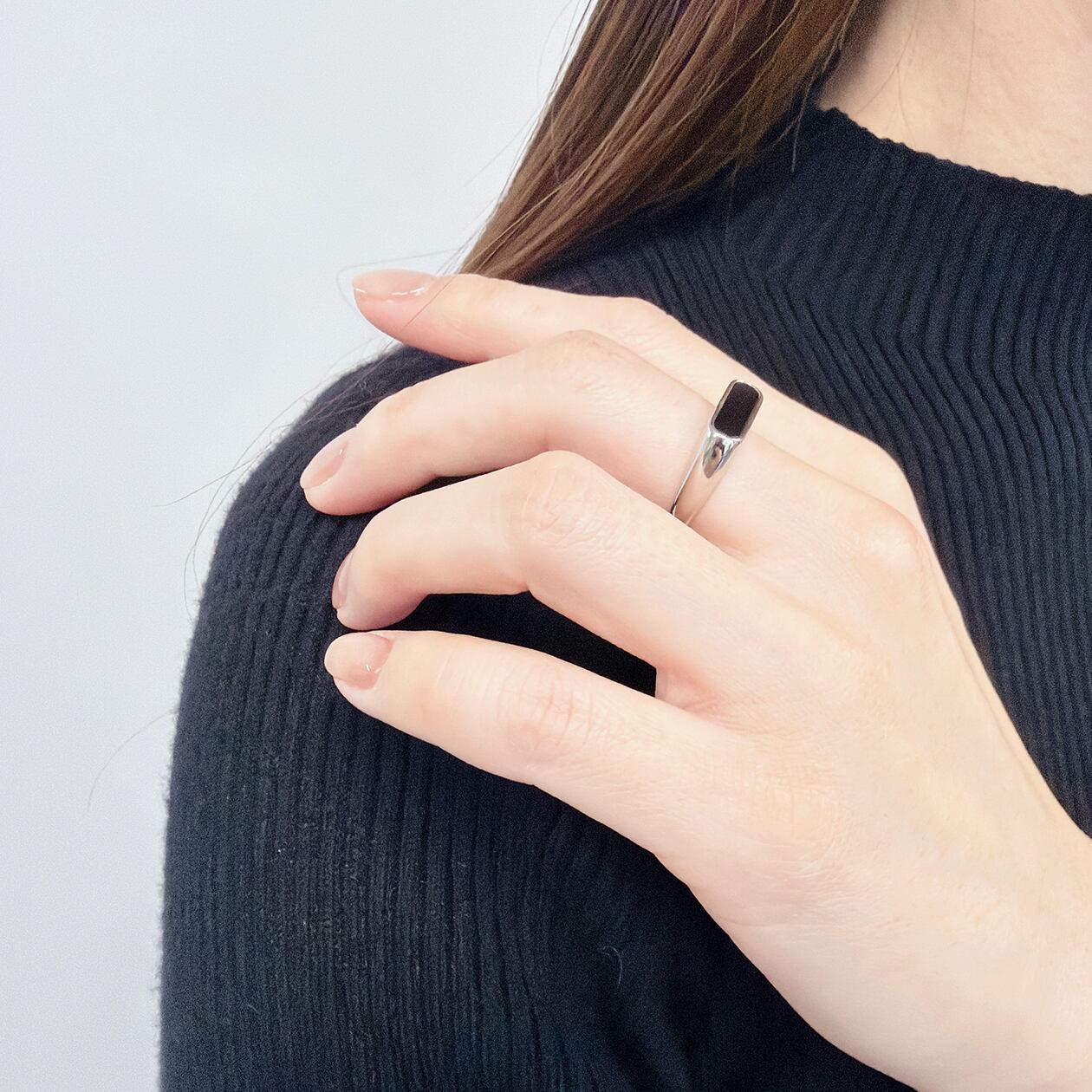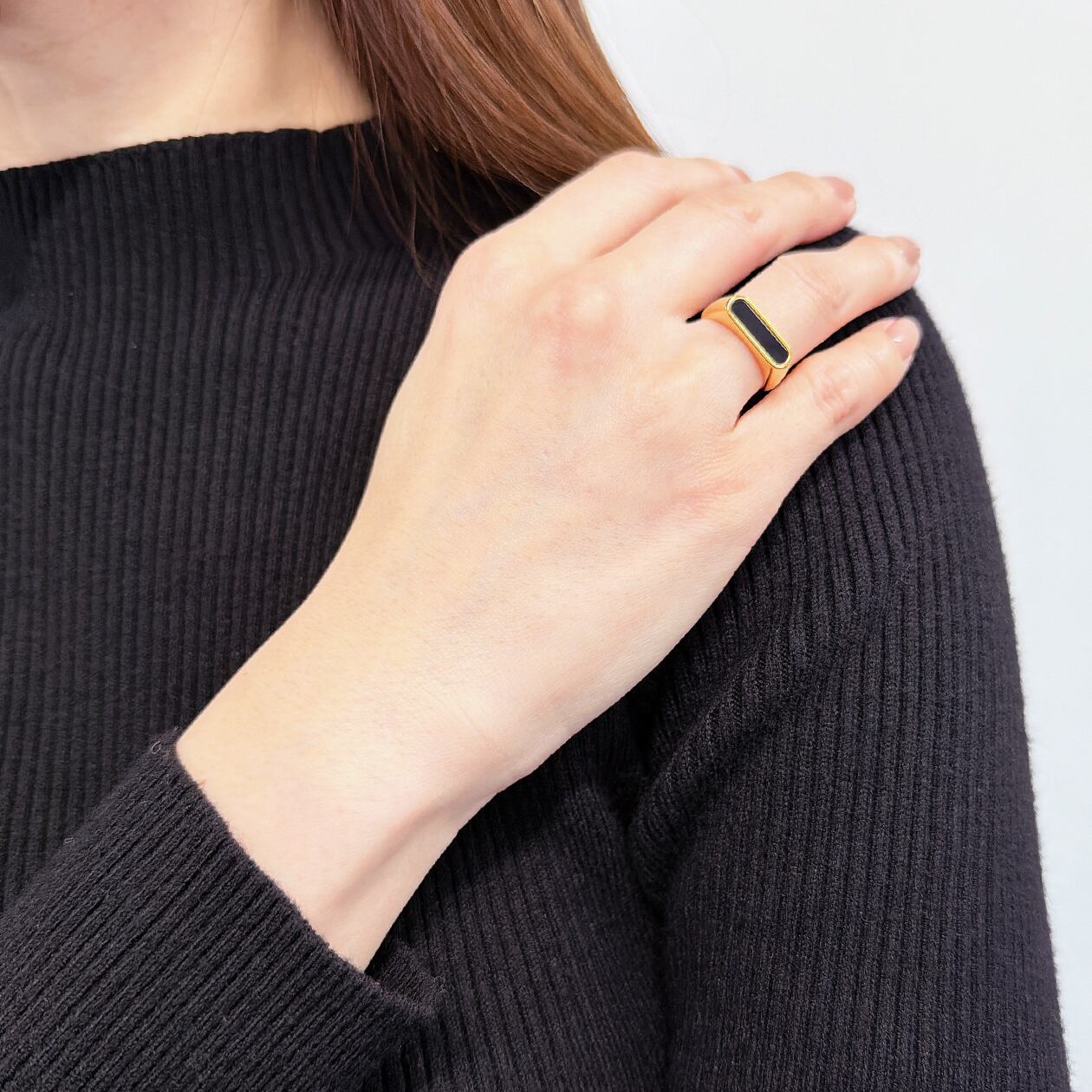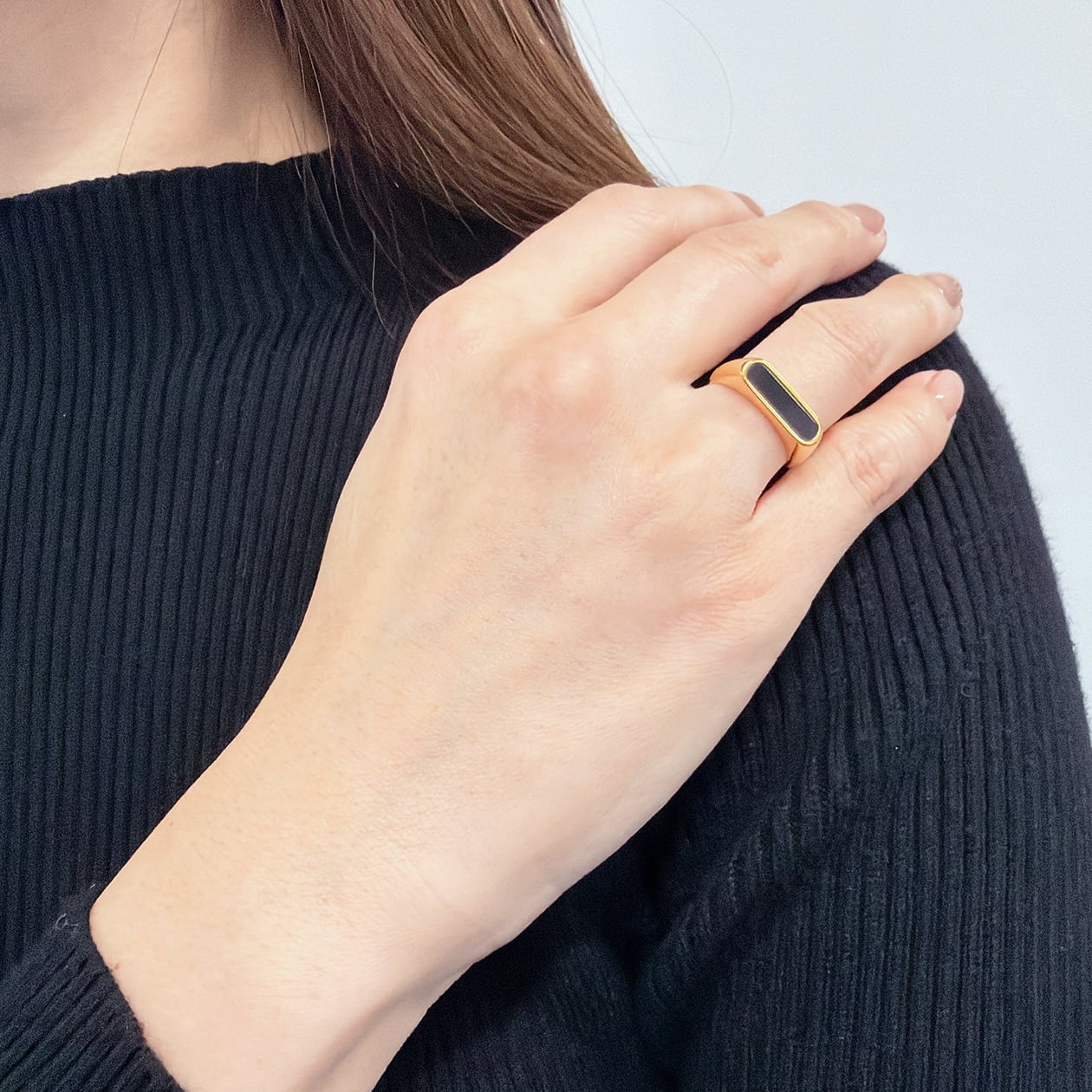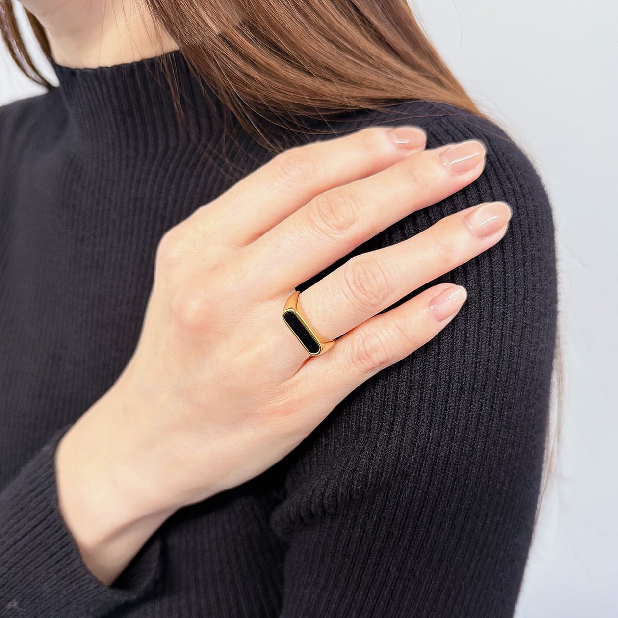 艶やかなブラックオニキスを横長にセットした、ミニマルで洗練された印象のサージカルステンレス316L製リング。直線的なデザインが指元をすっきりと見せ、程よい存在感でスタイルを引き締めてくれます。シンプルながらもモード感のある佇まいは、カジュアルからきれいめ、フォーマルな装いまで幅広くマッチ。ゴールドとシルバーの2カラー、複数サイズ展開で、ユニセックスに楽しめるのも魅力です。傷や水、汗に強く、変色しにくいためデイリー使いにも最適。単体ではもちろん、他のリングとの重ね付けやペアリングとしてもおすすめの一本です。