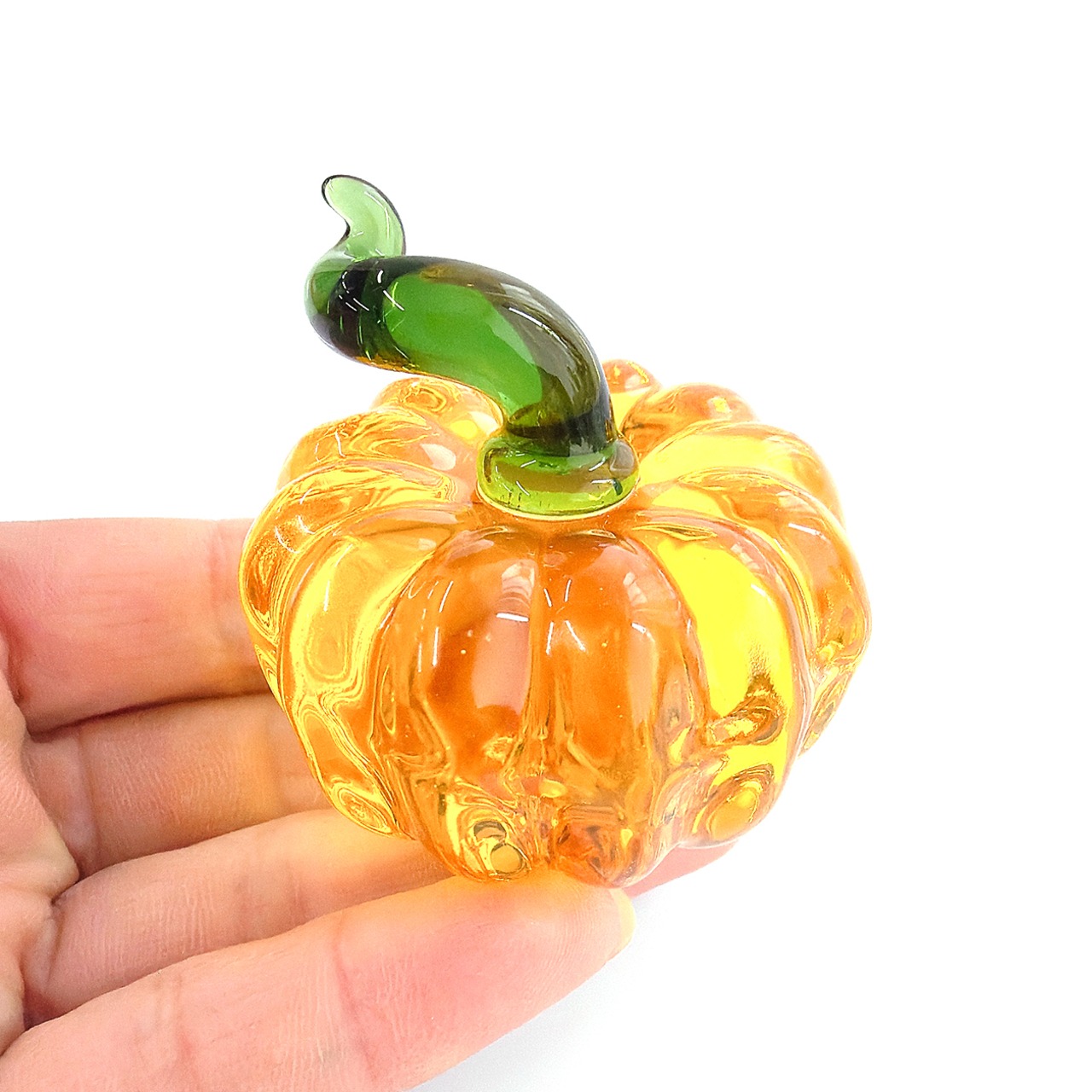 鮮やかなイエローとグリーンのコントラストが美しい、かぼちゃモチーフのガラスオブジェ。光を受けるたびにやさしくきらめき、秋の実りを思わせる温かみと上質感を空間に添えてくれます。ハンドメイドならではの繊細な造形は、一つひとつ表情が異なり、世界にひとつだけの存在感を楽しめるのも魅力。コンパクトなサイズ感ながら、飾るだけでインテリアのアクセントとして印象的に映えます。リビングや玄関、書斎のディスプレイにはもちろん、ハロウィンや季節のしつらえにもおすすめ。大切な方への贈り物や記念日のギフトとしても喜ばれる、特別感のあるガラスオブジェです。