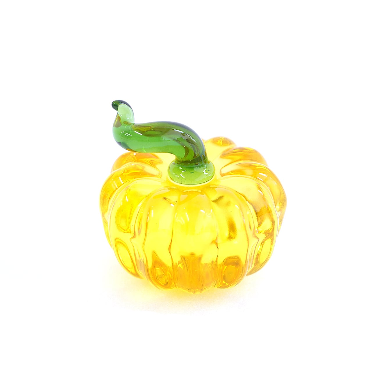 鮮やかなオレンジとグリーンが美しい、かぼちゃモチーフのガラスオブジェ。光を受けるたびにきらめき、秋の実りを思わせる温かみと高級感を漂わせます。ハンドメイドならではの繊細な造形は、一つとして同じものがなく、飾るだけで空間に特別な存在感を与えてくれます。