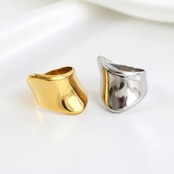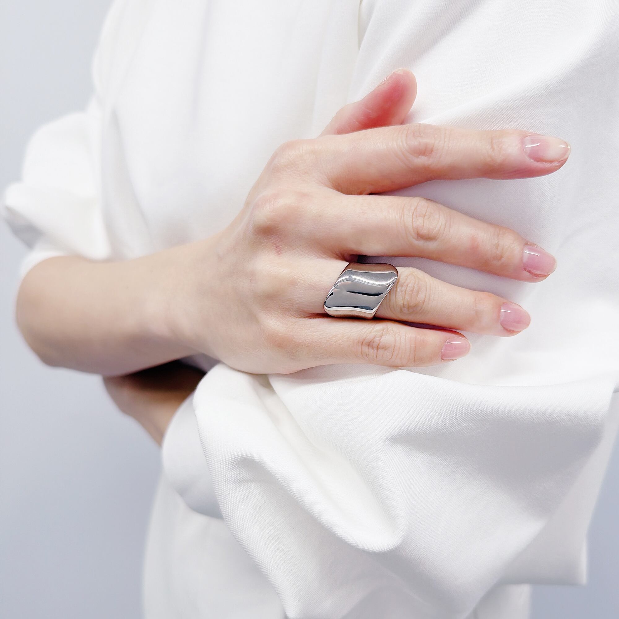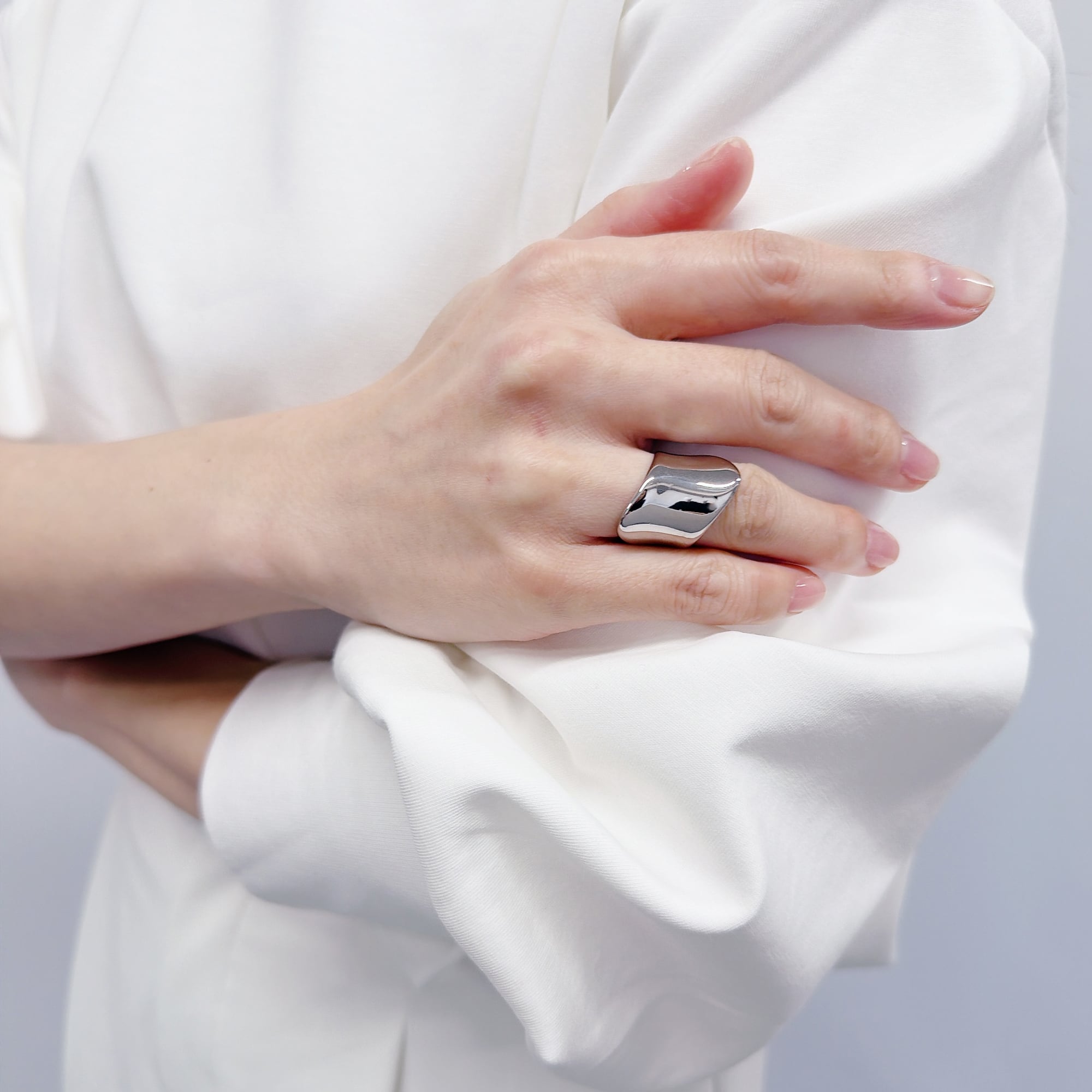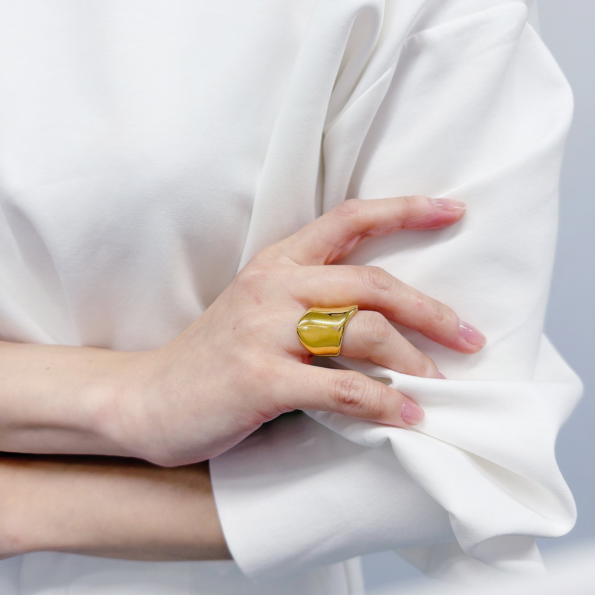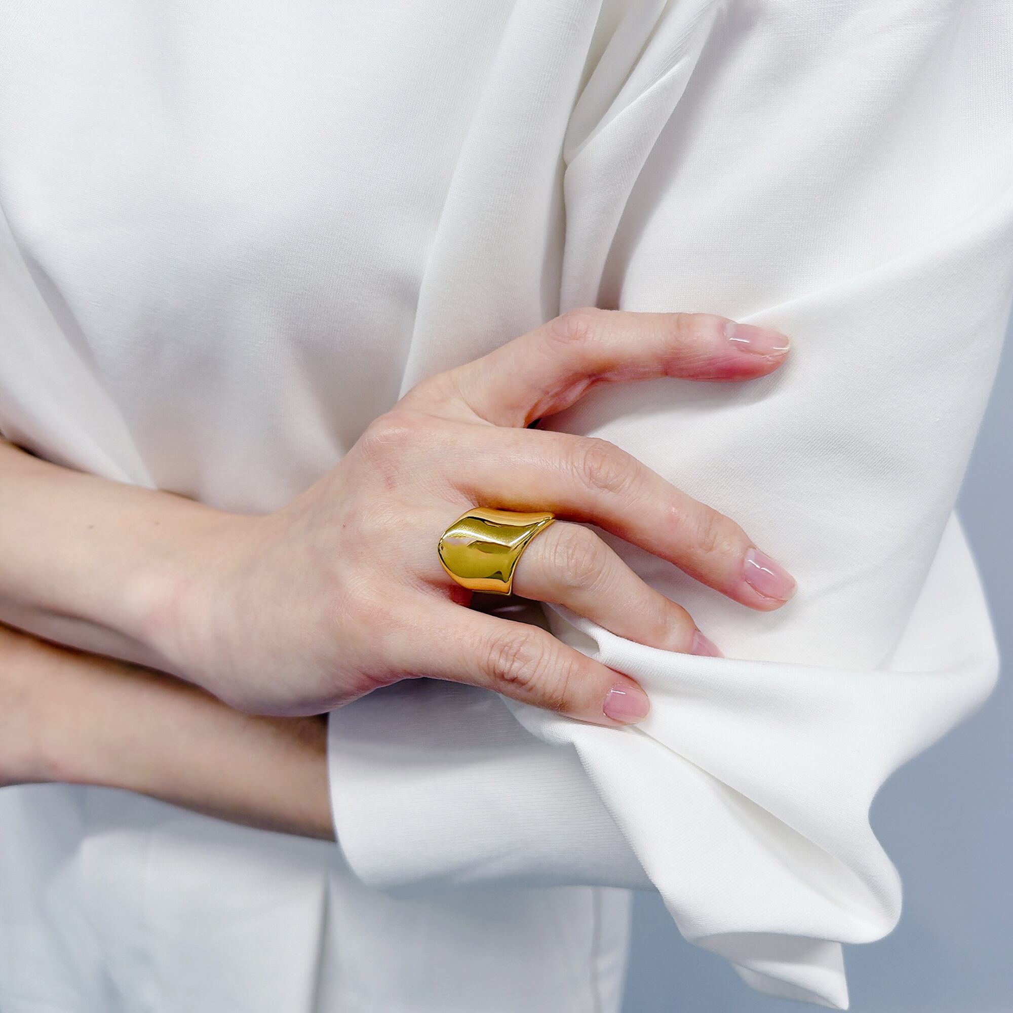 立体的なフォルムが目を惹く、大ぶりシルエットのボリュームリング。緩やかなカーブとミラーのような艶感が手元にモダンな存在感を与え、ひとつ着けるだけでスタイルを引き締めてくれます。厚みのあるデザインながら、指に沿うなめらかなラインに仕上げているため、見た目以上に肌なじみが良く、心地よい着用感も魅力。シンプルなコーディネートに合わせるだけで、アクセントとして程よい華やかさをプラスします。ゴールドとシルバーの2色展開で、ユニセックスに楽しめるのもポイント。サージカルステンレス316Lを使用し、日常使いしやすいタフさと美しさを兼ね備えた一本です。