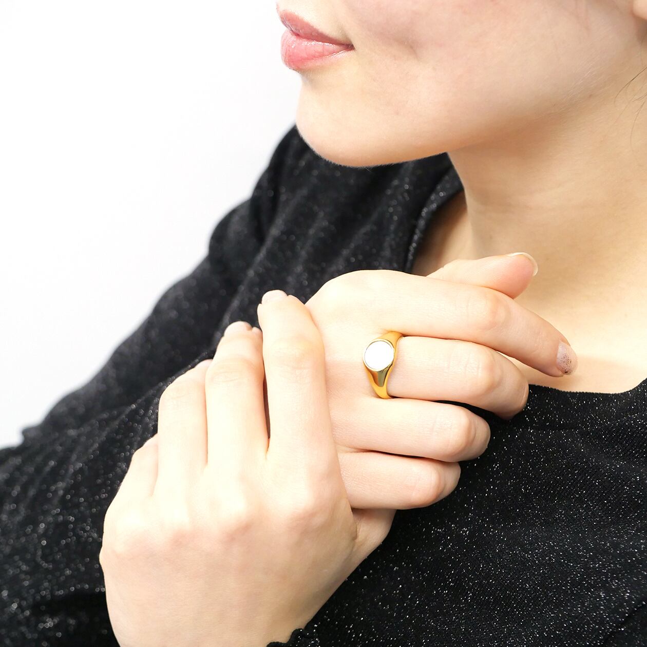 サイズ・カラー・ストーンの組み合わせを自由に選べる、サージカルステンレス316L製のシグネットリング。丸みのあるフェイスに、深みのあるブラックオニキス、またはやわらかく艶めくホワイトオパールをセットし、手元に上品なアクセントを添えます。カラーはゴールドとシルバーの2色展開で、スタイルやコーディネートに合わせた組み合わせが可能。傷や水、汗に強く、変色しにくいためデイリー使いにも最適です。ユニセックスで取り入れやすく、単体では程よい存在感を、他のリングとの重ね付けでは洗練された表情を楽しめる、長く愛用できるスタンダードリングです。
